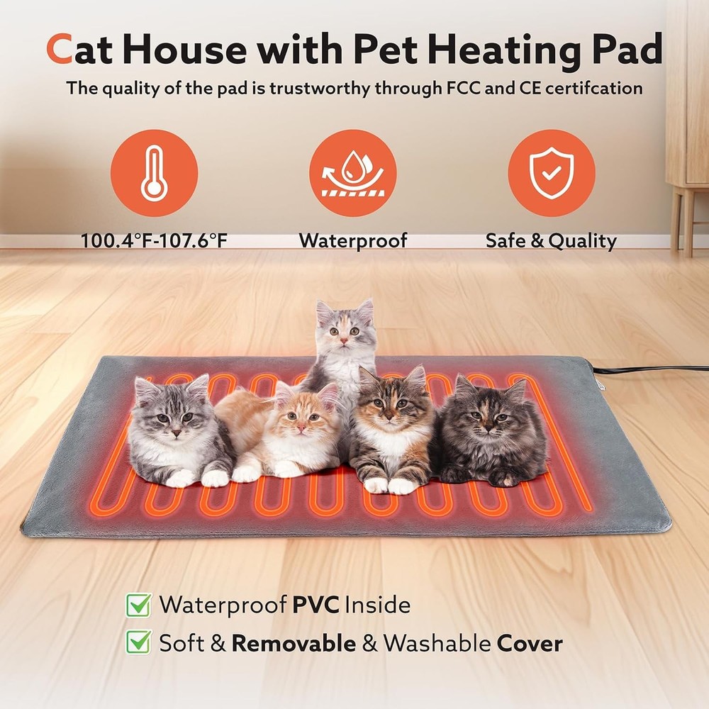 About this item Safe Heating Pad:The heated cat house with a heating pad which protect cats from chewing wires with dual resistant cord protection to ensure safety. Ultra-soft, machine-washable cover for comfort and convenience. It effectively keeps your pets toasty warm in cold days. Unique design: The roof is inclined to avoid water backlog and collapse on the roof. The elevated base is attached to prevent the cat house from changing. The front and rear exits escape from the back door when the cat is in danger. Fully Weatherproof & Insulation-The heated cat house for outside, made of 5 layers of waterproof and insulating materials, can protect cats from any extreme outdoor conditions. Super Large Sizes: Our outdoor feral cat house is large, measuring 25.7" Lx13.5" Wx18" H, accommodate multiple kittens, puppies, making it an ideal outdoor house for pets weighing about 25 pounds. Easy to Install:you only need to follow the simple steps in the manual to install it. And the cat roof can be opened for daily cleaning. Brand: Product Dimensions: 25.7"D x 13.5"W x 18"H Material: Aluminum, Polypropylene (PP), Polyvinyl Chloride (PVC) Color: Grey Style: Modern
