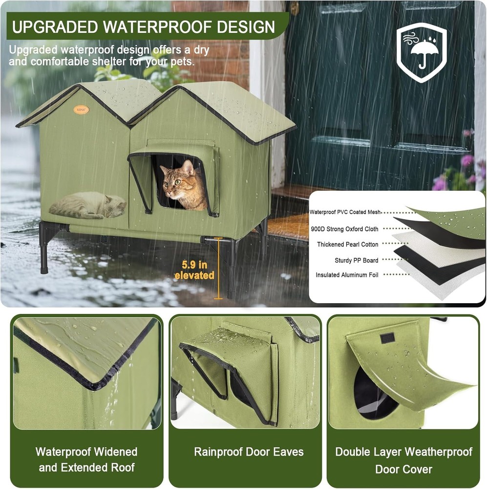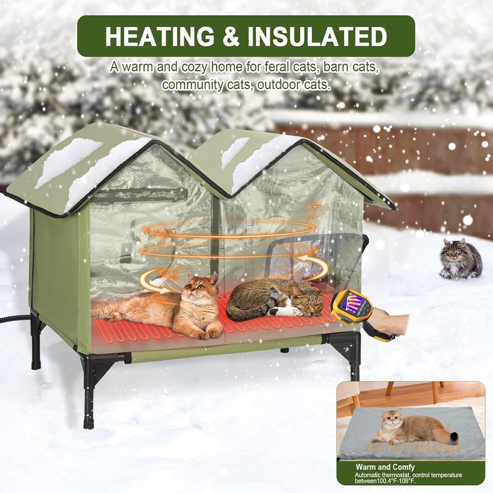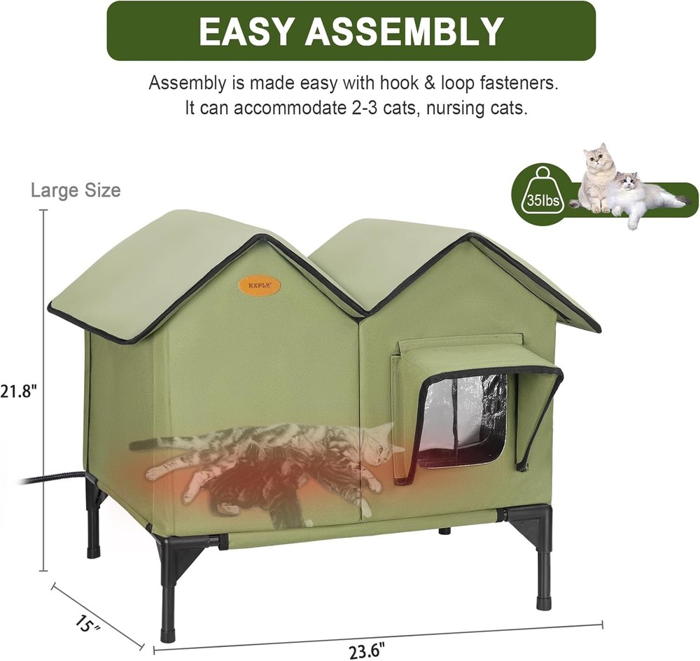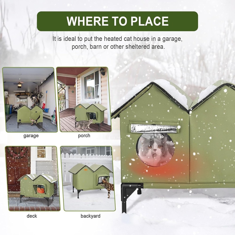 About this product [Winter Outdoor Warm Cat House] Designed for outdoor, feral, or stray cats, this warm cat house provides a comfortable and secure shelter from the elements and predators. It's ideal for porches, barns, garages, and backyards. [Full-Size Heating Pad] This outdoor warm cat house features a UL-certified, energy-efficient heating pad and thick insulation to keep your cat warm even in snow, wind, and freezing weather. Full-size heating pads are located throughout the house to ensure warmth in every corner. [Durable, Weatherproof Construction] Made of durable, waterproof-coated 900D Oxford fabric and reinforced with 1500g high-strength hollow panels, it withstands rain, snow, and outdoor wear. On Oct 29, 2025 at 22:16:05 PDT, seller added the following information: