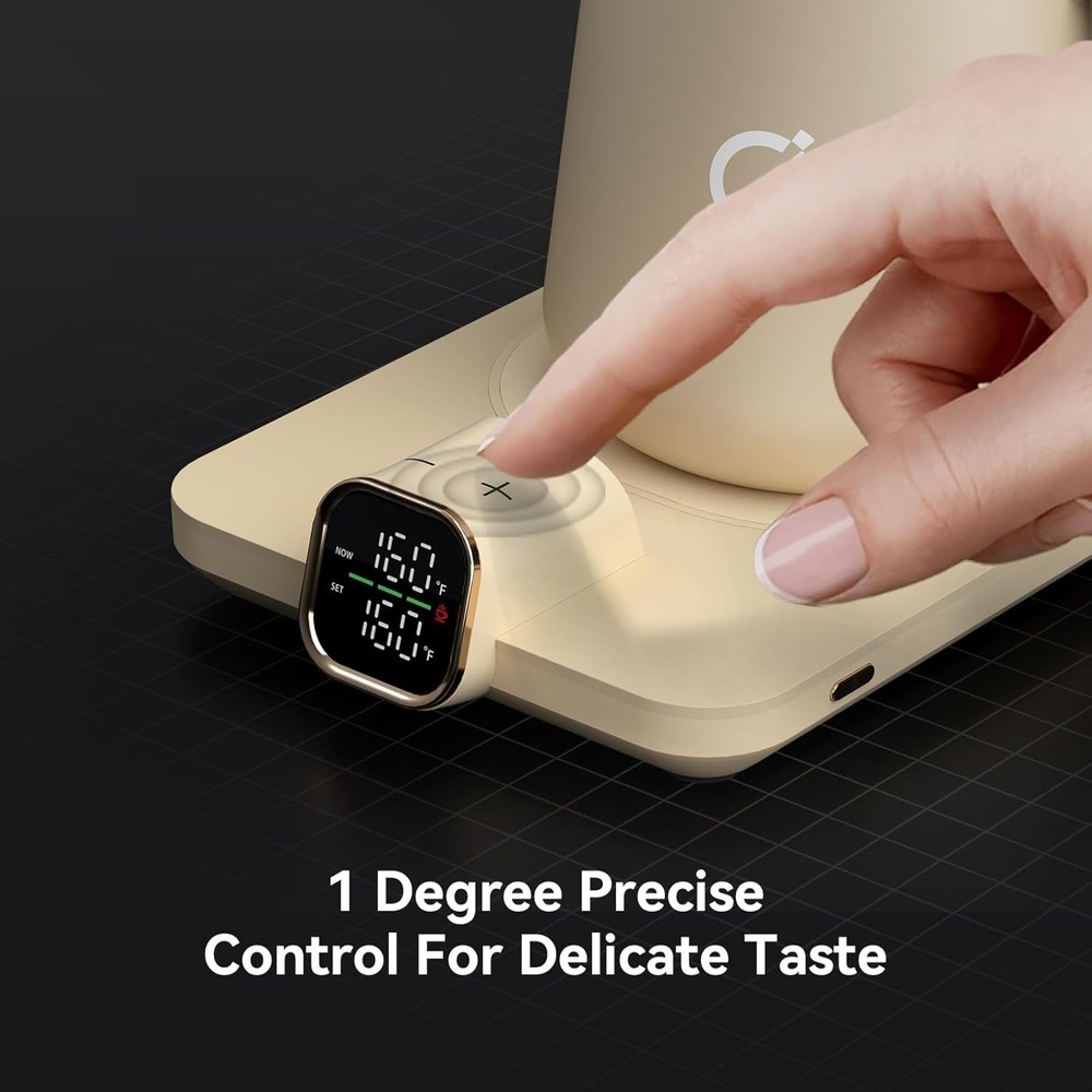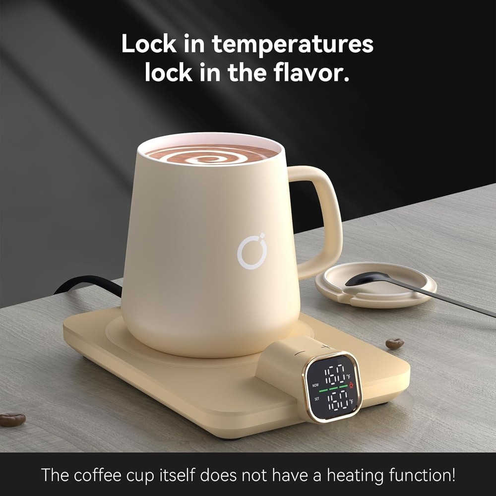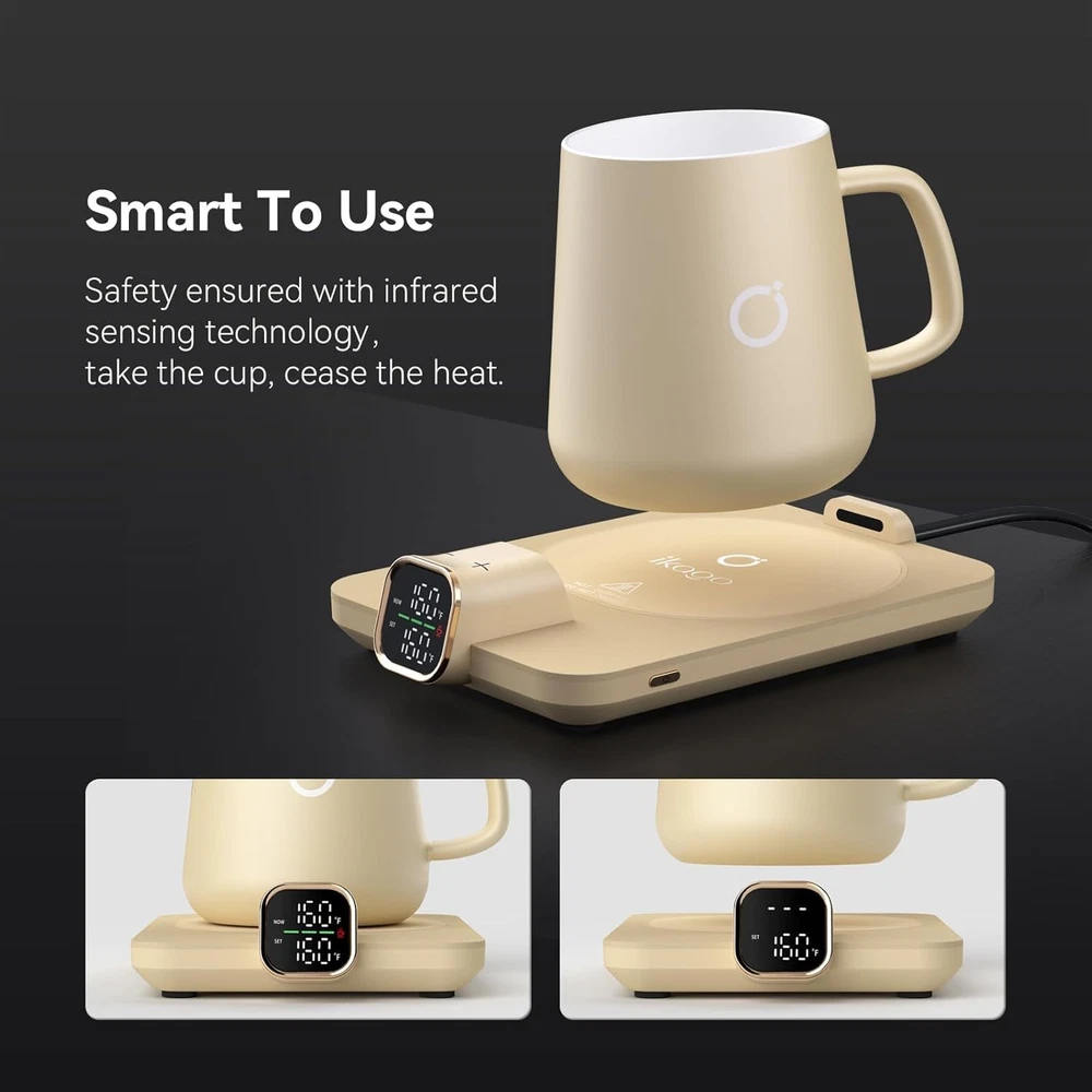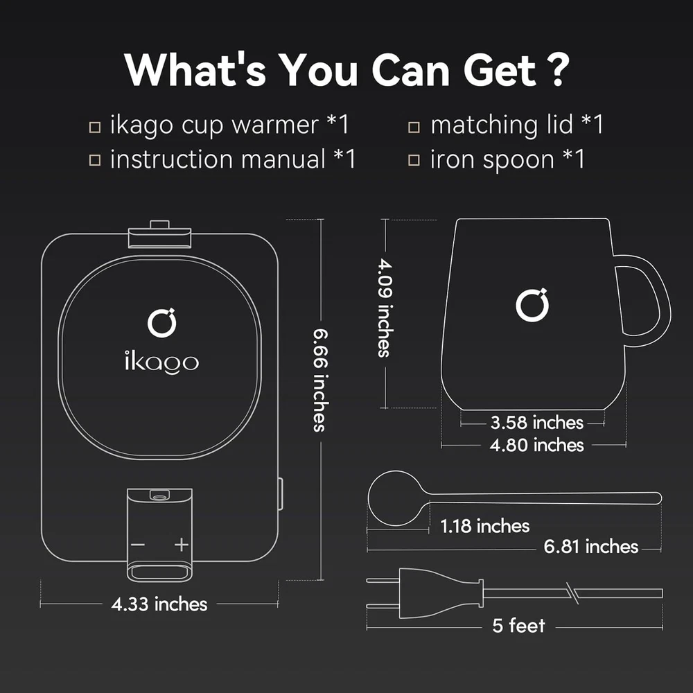 Perfect Gift Set for Any Occasion: Celebrate Birthdays, Father’s Day, Mother’s Day, Valentine’s Day, Teacher's Day, Christmas, Graduation, and more with the Ikago Smart Coffee Warmer Set. It’s a practical and stylish gift for anyone who enjoys a warm cup throughout the day — at home or at work Real-Time Temperature Control: Our smart heated coffee mug warmer uses dual infrared sensors and digital display to show & control real-time drink temperature. Keep your coffee, tea, or cocoa at the perfect warmth, anytime 1°F Adjustable Customizable Heat: Choose your ideal temperature from 105°F to 175°F, adjustable in 1°F increments. Perfect for crafting the best cup of coffee, tea, milk, or hot chocolate at home/at the office. Support change into ℃ Fast Heating & Energy Efficient: Powered at 75W, Ikago warmer heats 50% faster and reaches 175°F quickly. Smart power control maintains ideal warmth without overheating — saving energy while keeping every sip just right Smart Auto On/Off Safety: Thanks to dual infrared sensors, the warmer automatically shuts off when no cup is detected for 15 minutes, or after 2 hours of inactivity — ensuring safe, worry-free use at home or the office Universal Compatibility: Designed for most ceramic mugs, it's perfect for coffee, tea, milk, or cocoa. (Note: Not recommended for glass, metal, paper, or insulated cups.) This warmer set thoughtfully packaged with a 15oz ceramic mug, matching lid, stirring spoon, and smart warmer