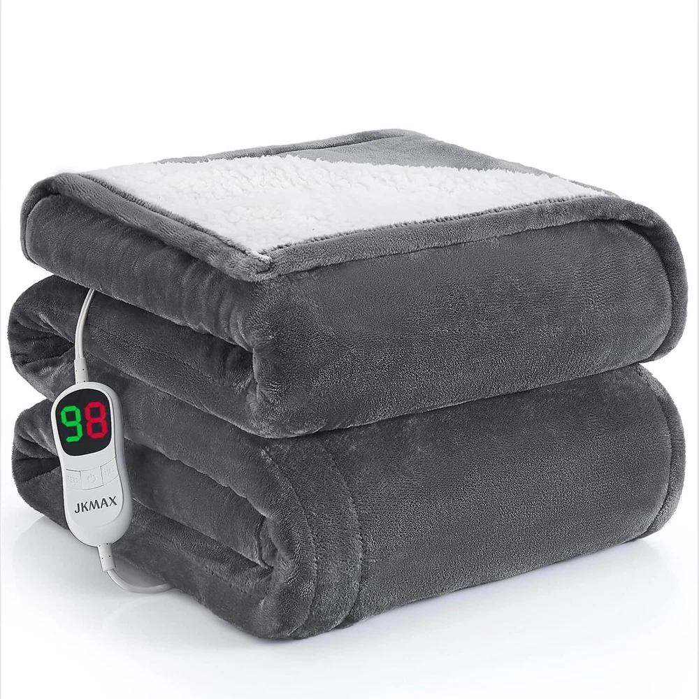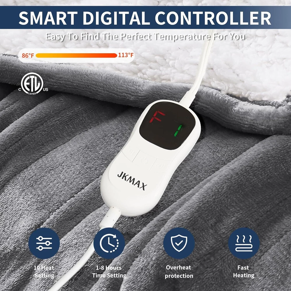 Heated Electric Blanket - Throw 62"x84" 62x84, Grey Product Details Special Feature: Unlit Material: Polyrester Brand: JKMAX Color: Grey Model Name: Heated Electric Blanket Professional: electric blanket twin has passed the U.S. safety UL964 test and has ETL certification, lower electromagnetic radiation; The heating wire is designed and produced by Japanese company, more advanced technology, stronger insulation and flame retardant; The heated blanket adopts NTC overheating protection technology, 8 hours automatic shutdown, overheating protection function to protect you and your family's safety Premium Material: The heated blanket throw is made of double-layer 220gsm flannel, softer and warmer than single-layer other materials, and warmer than ordinary blankets even when not powered; The fabric of the blanket warmer is durable and will not fall off; The diameter of the heating wire is 2.2mm, you can hardly feel the presence of the heating wire when you use it, more comfortable Heating Settings Upgraded: Unlike ordinary throw electric with 3 or 4 heating settings on the market, electric blankets have been upgraded to 10 heating settings (86°F - 113°F) and 5 timing settings (1, 2, 4, 6, 8 hours) in order to personalise the blanket to meet your temperature and timer needs; There are more temperature adjustment ranges and more automatic timer zones for more flexibility More Energy Saving: heated throw blanket for cold weather adopts intelligent temperature adjustment technology, when the temperature rises, the heating blanket will automatically adjust the temperature according to the surrounding environment, always providing users with a comfortable feeling, which is conducive to energy saving; Compared with air conditioners, electric throw blanket is more energy-efficient and can save you more money on heating costs in winter