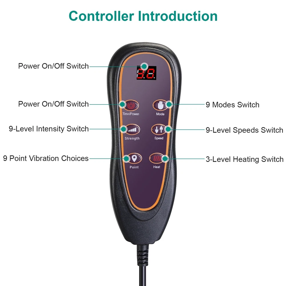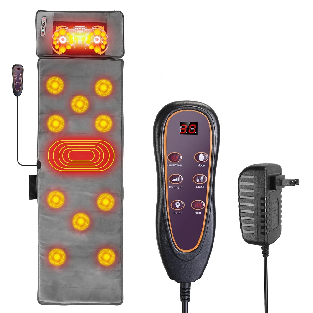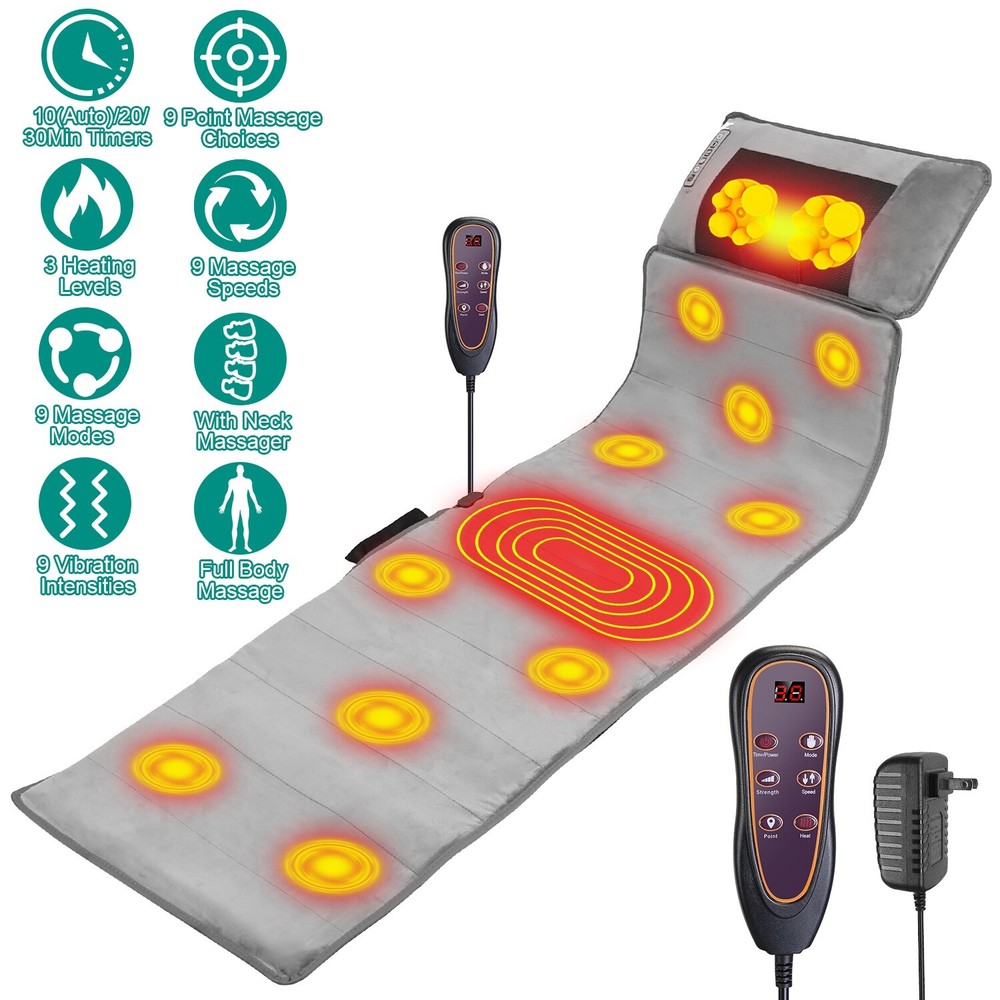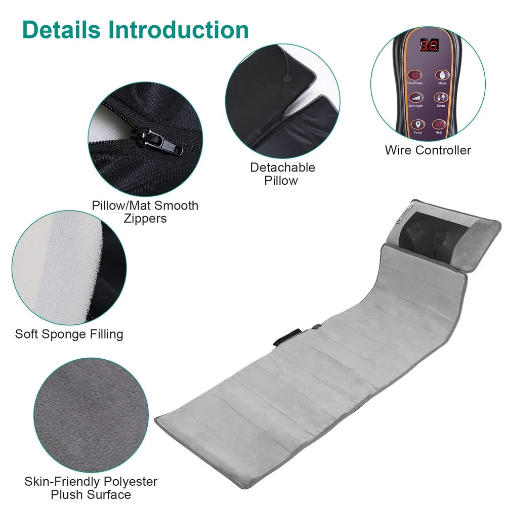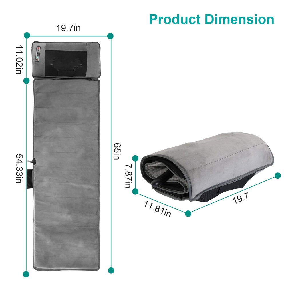 GOOD QUALITY Featured Item Product Detail Image Gallery Product Description Overview: No need to spend extra money and time to go to massage shop. Our full-body massaging pad with neck massager made of skin-friendly plush bring you therapeutic massage experience. The mat with 10 massage points can massage your Back, Buttock, Waist, Thigh and Calf. Heating function helps to release muscle tension, stress, and fatigue. You can choose multiple vibration modes in different intensity and different speeds as you hit all the right spots. Neck massager is able to relieve your neck pain and neck stiffness after long day work. Besides, 3 smart timers can be chose to customize you massaging time. Great to enjoy massaging on the chair, bed, couch, etc. comfortably. Perfect gift to take care of the health of your grandparents, parents, husband, wife or friends in Mother’s day, Father’s day or birthday. Features: Full Body Massage Mat: Our massage mat features 10 massage points including Back,Buttock,Waist,Thigh,Calf,and heating therapy function,it's able to give you a therapeutic massage that helps release tension, stress, and fatigue after a long work day. You can choose 9 designated vibration modes, 9 point-selection vibration modes, and enjoy full control over 9-level vibration intensity and 9-level speeds as you hit all the right spots. Soothing Heat Therapy: The massage pad also features heating function on lumbar zones to promote blood circulation to help relieve fatigue and muscle pain. You can choose 3-level heating to suit your personal needs. Neck Massager: A neck massager is provided to knead your neck to relieve your neck pain and stiff neck muscle. With 2 massaging head with total 20-node, which can grasp, knead, press your sore muscles like human fingers. You can choose positive or negative direction of massaging or choose other 3 massaging modes as you like. 3 Selectable speeds meet your diverse demands. The pillow also builds in heating infrared light to bring warmth to your muscle and results in speeding up blood circulation on your neck. Smart Timer & Soft Plush Surface: The massage pad adopts auto(10mins)/20mins/30mins timer to let you customize you massaging time. Besides, super soft polyester plush surface and soft sponge filling ensures that the massage mat is super soft to lie on or sit on. Just enjoy massaging on the chair, recliner, bed, couch and wood floor comfortably and without worry. Versatile Usage & Perfect Gift: The massaging mat is great to be used at home or in the office. It's a perfect gift for your grandparents,parents,husband,wife or friends in Mother’s day,Father’s day or birthday. Note:This is only a gentle vibration massager,not a deep kneading shiatsu massager. If you are looking for a deep shiatsu massager,please do not purchase this product. Specifications: Brand: iMounTEK Product Type: Full Body Massage Mat Color: Black Material: Polyester Surface, Sponge Filling Powered By: Plug-In Plug: 100-240V Non-Standard US Plug Power: 24W Massage Pad Function: Function: Heating, Vibration(9Modes + 9 Point Vibration), Timer[Auto(10Mins)/20Mins/ 30Mins] Operation Method: Key Control Speed: 9 Speeds Vibration Intensity: 9 Levels Heating Area: Waist Part Heating Levels: 9 Levels Massage Area: Neck, Back, Buttock, Waist, Thigh, Calf Neck Massage Pillow Function: Function: Kneading Massage (5 Modes: Positive/ Negative/ Intermittent Positive/ Intermittent Negative/ Positive & Negative), Heating Massage Speed: 3 Levels Heating: 4Pcs Infrared Light Beads Power Cord: 1.8m/70.87in Control Cable Length: 56cm/22.05in Massage Pillow Cable Length: 98cm/38.58in Item Size: 165x50x10cm/65x19.7x3.94in Item Weight: 2.35kg/5.18lbs Package Size: 51*20*33cm/20.08*7.87*11.81in Package Weight: 2663g/5.87lbs Package Contents: 1 x Full Body Massage Mat with Neck Massage Pillow 1 x Adapter 1 x User Manual Terms & Conditions Thank you for your business !