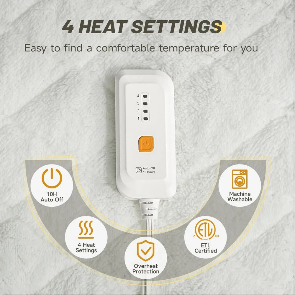 SOFT MATERIAL: The heated mattress pad fabric is made of micro plush,delicate and soft, skin-friendly and non-irritating, and the warm and comfortable queen mattress pad can be used personally, giving you a comfortable sleep in the cold winter 4 HEATING SETTINGS&10H AUTO-OFF:The matress pad queen size is equipped with dual temperature and dual controller,left and right control,each needs, the mattress pad has 4 heating settings adjustment and 10-hour automatic shutdown function to prevent forgetting to shut down,The queen heated mattress pad can avoid you waking up in the middle of the night in the cold winter, to ensure that you have a comfortable and stable sleep experience Deep pocket design: Our heated mattress has a deep pocket design, the side of the pocket is easy to stretch to ensure that the 15-inch mattress fit, and our mattress pad also has a non-slip design, so that if you fall asleep and turn all night, you don't have to worry about the heated mattress pad will slide and affect the comfort OVERHEATING PROTECTION&SAFETY ASSURANCE:The mattress pad has the function of overheating protection. When a high temperature is detected, the heated mattress pad will automatically power off.heated mattress pad has an ETL certification,Ensure your safety during use EASY MACHINE WASH:Our heated mattress pad is machine washable.Separate the controller from the matress pad,the whole heated mattress pad can be put into the washing machine.It is easy to keep the body of the heating mattress pad clean and the surface of the heating mattress pad soft and durable