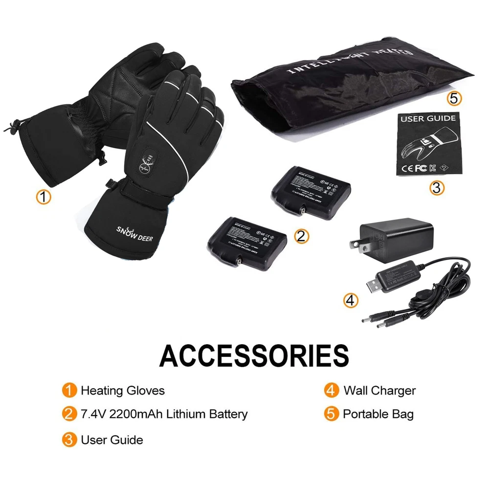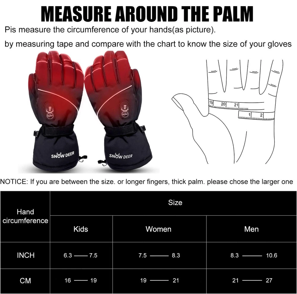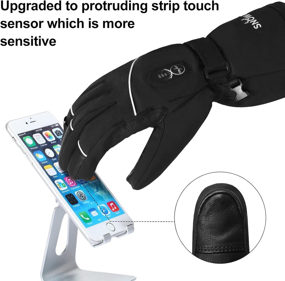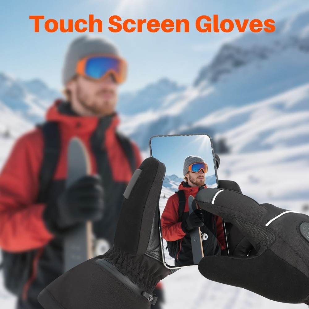 【3 Temperature Settings& Thumb Double Heating】The electric heating gloves with 3 heat setting controllers, there are 3 heating level. You can adjust the temperature whatever you like. Heating Elements Covers Back of hand and whole fingers till finger tips. The thumb use double heating, no more cold. The electric heating gloves Included a pair of 7.4V 2200mah rechargeable lithium polymer batteries. It can be heating up to 5-6 hours after fully charged by 3-4 hours 【Sensitive Touch Screen Function】This new Electric Glove mitten with new design for the touch screen function, as you can see there is an U shape design on the thumb which makes you can touch your Phone/I pads without taking off the gloves in the cold weather. The touch screen material is very sensitive and comfortable, so no worry for the quality. 【Comfortable Material】The rechargeable heated mittens are made of insulated Cotton,breathable comfort Fleece inside.The special quality material can storage thermal efficiently and provides nearly twice warmth of other materials, it can keeps your hands more cosy warm from cold weather outside.It is stimulate your hand blood circulation when you put on gloves, and it is also great for people who suffers from Raynaud’s, Arthritis, Bad Circulation, Stiff Joints. 【Excellent performance】Those electric skiing gloves are good for Skiing,Motorcycling,Hiking,Cycling, Hunting, Fishing, Walking your dogs, Climbing, Shoveling snow, Outdoor work,heating and durable.Give you warmth and comfort for a long time. 【The Ultimate Cold Weather Solution】 The Far Infrared Fiber heating elements provide superior heat dispersion, ensuring your hands stay warmer for longer. Say goodbye to the discomfort of cold hands. Our Battery Heated Gloves are here to elevate your cold weather experience, providing warmth, comfort, and improved circulation. Rediscover the joy of cold-weather activities with gloves that are engineered to perfection.