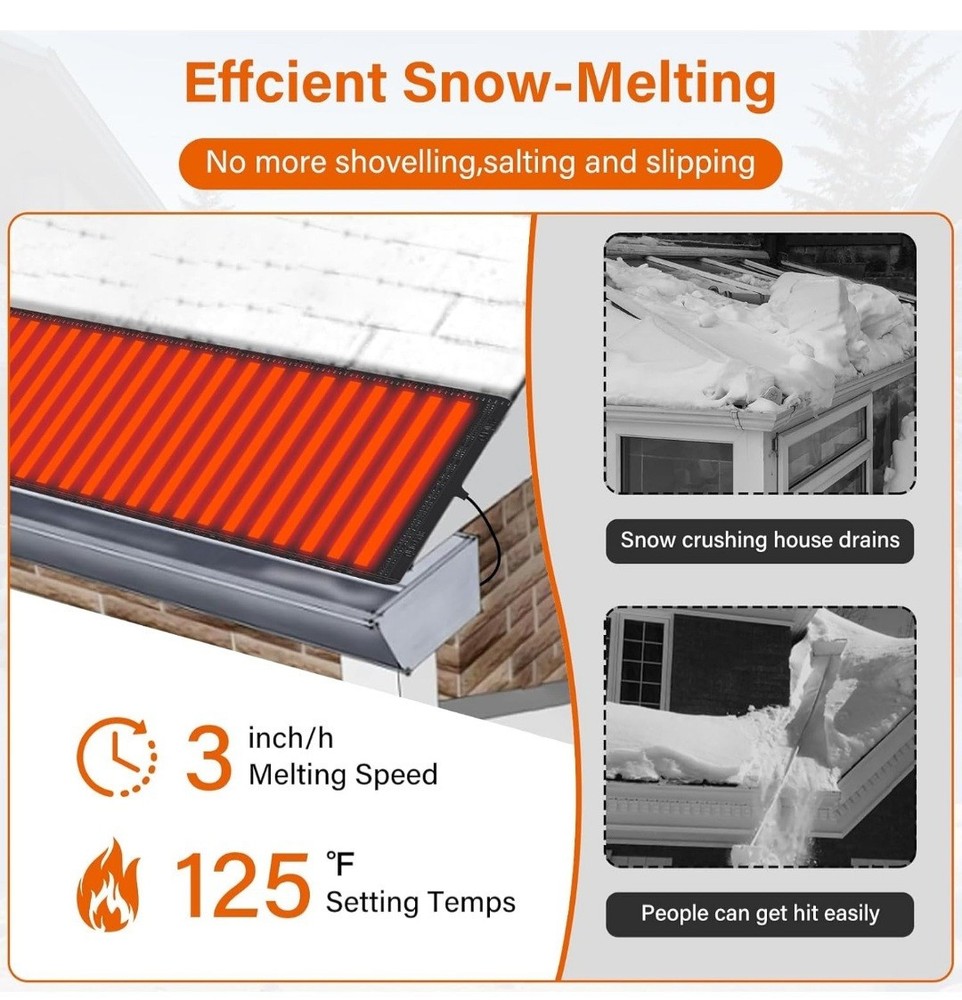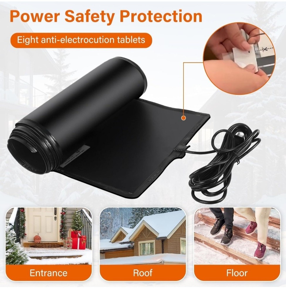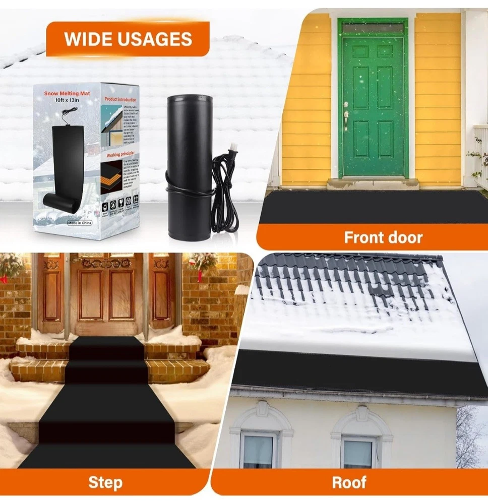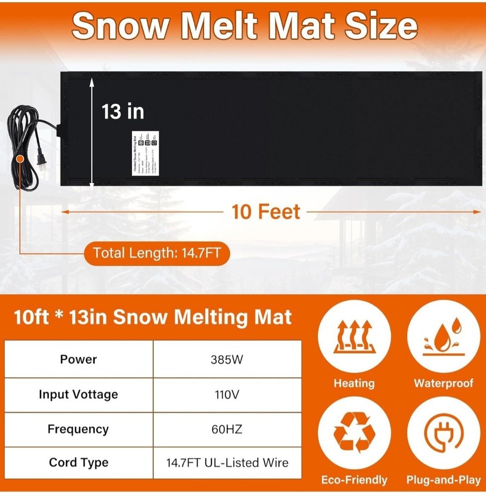 Product details Top highlights Heated Snow Melting Mat:Heated outdoor mats size is 10 ft *13 in,which is large enough to cover considerable ground, offering utility; Snow melting mats walkway comes with a power cord up to 14.7ft long, it can be easily plugged into a standard volt socket, saving you time and effort Energy Efficient: Snow melting mats outdoor melt snow at 2 -3 inch per hour and use far less energy than traditional snow melting systems,it is recommended to match the controller,saving you both time and money. During normal operation,surface temperature of heated mat gets to 40 ℉ above the ambient temperature and works well down to -22 ℉ Easy Installation:Just lay out the ice melting mats for walkways, plug snow melting mat in,and watch the snow melt on contact,No more shoveling! No more Salting!No more Slipping! Please note that Ansgery heated mat are a stand-alone mat that comes with its own power source, but cannot be connected to other snow-melting mats outdoor Versatile Use:Outdoor heating mat is suitable for both residential and commercial use,whether it's for your home's entrance,a busy commercial building,or even a small business,the mat can protect your floor from winter hazards.And snow & ice heated outdoor mats can also be used on roofs to prevent ice dams from forming and protect your house Warm Tips:Before turning on the power, fully unfold snow melting mats so that they do not touch,cross or overlap each other.Do not plug in the cable until snow melting mat is completely loosened. Insert the cable and after about 5 minutes you should feel it slightly warm to the touch.When storing,please disconnect the power supply in advance,cool it down and then circle it for storage,folding is strictly prohibited Product information Product Dimensions 1200 x 13 x 1 inches Item Weight 5.96 pounds Manufacturer Ansgery ASIN B0D72722H7 Country of Origin China Item model number 10ft*13in Product Dimensions 1200 x 13 x 1 inches Item Weight 5.96 pounds Manufacturer Ansgery ASIN B0D72722H7 Country of Origin China Item model number 10ft*13in TESTED WORKS GREAT HEATS UP GREAT