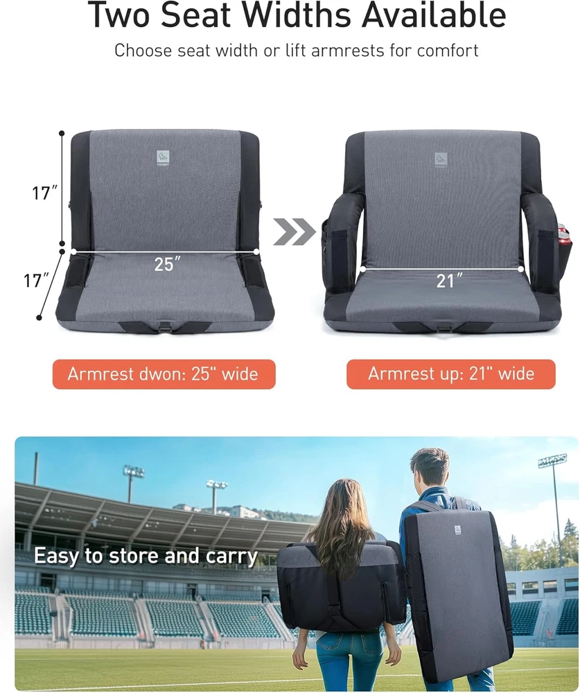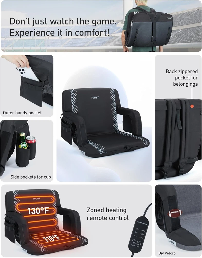 Dual Heating & Adjustable Temp: Our heated stadium seats come with an impressive dual heating system that warms both the seat and backrest(one battery is required each). With three adjustable heat settings reaching up to a cozy 140°F, you’ll stay toasty while enjoying a concert. The user-friendly remote lets you switch between settings with ease, so you can focus on the action, not the chill. Please note that you'll need two 5V battery to power the heated bleacher seats (not included) Unmatched Comfort Experience:Designed for those who love to bask in the excitement of outdoor sports, these seats feature six adjustable reclining positions from 90° to 180°. Whether you're sitting upright to catch every thrilling moment or reclining back to relax during a camping trip, you can customize your seating to fit your mood. The plush cushioning provides luxurious support for long hours at the stadium, making these heated stadium seats your new best friends for any outdoor adventure Built to Last in All Conditions:Our heated bleacher seat is made from waterproof Oxford fabric that can brave unexpected splashes or light rain. You can enjoy your favorite outdoor sport without worrying about the weather ruining your fun! The strong leather base adds grip and stability, ensuring you remain secure, even when jumping up in joy as your team scores the winning goal. Plus, our chair’s robust framework supports various body types, promising reliable comfort for everyone Easy Setup & Secure Guaranteed:No more sliding around when you leap up to cheer! Our stadium chair comes with convenient bottom straps designed to keep your seat firmly anchored to the bleachers. This ensures safety and stability while reducing movement, allowing you to focus entirely on the excitement of the game or concert. Enjoy peace of mind knowing that your heated bleacher chair isn’t going anywhere, even during the most thrilling moments Portable & Multi-Pocket Convenience:Our heated stadium seats for bleachers are equipped with multiple pockets designed for ultimate convenience. Store your water bottle, snacks, or personal items in the handy side pockets and zippered back compartment—perfect for those chilly evenings! With two shoulder straps, carrying your heated bleacher chair is as easy as slinging on a backpack Multi-scene application:The TOURIT Heated Stadium Seat is the perfect choice for watching a variety of sporting events like football, baseball, basketball, the Olympics, and the World Cup, as well as outdoor activities like camping and fishing. It’s especially great for parents watching their kids practice or waiting on the sidelines during games. Say goodbye to cold, hard bleachers Product Description