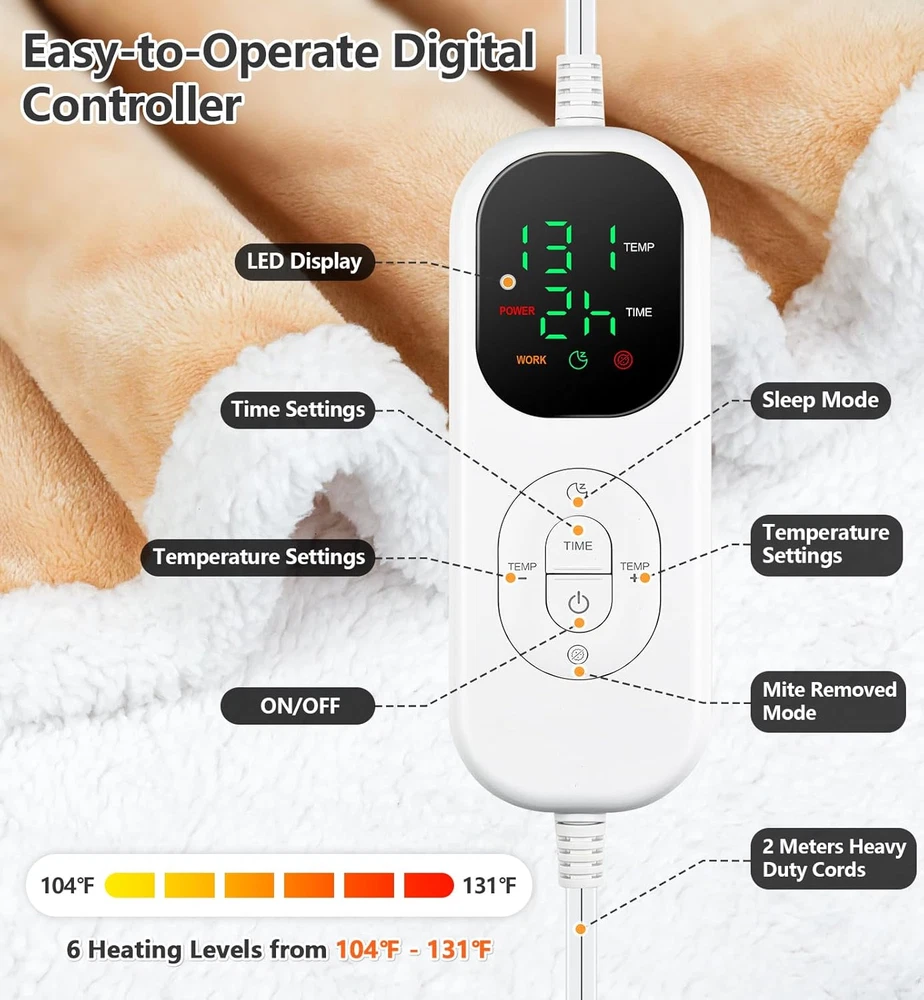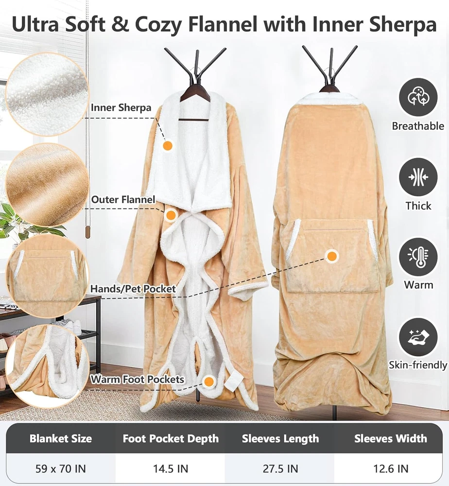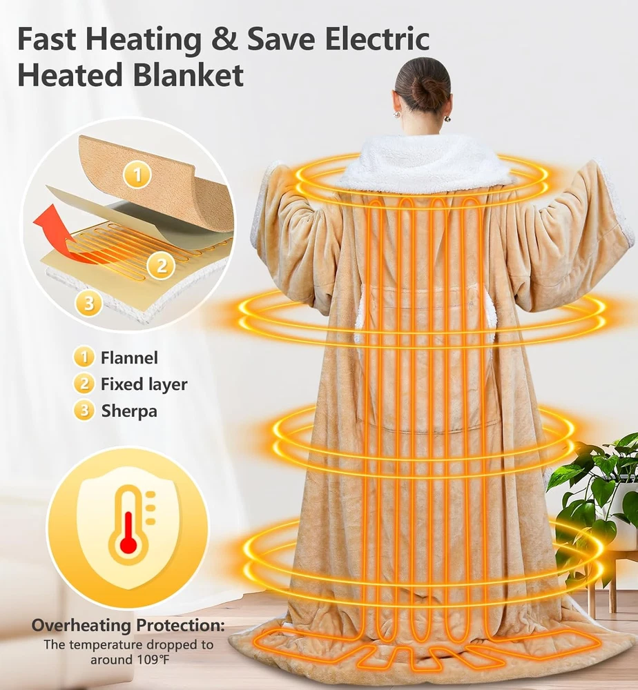Stay cozy and warm with this wearable heated blanket Features 1. Heated Blanket Size: At 59x70 inches (150 x 180 cm), it features a built-in foot pocket with heating elements to keep your feet toasty 2. Sleeves of the Blanket Size: The sleeves measure 65 cm long and 46 cm in circumference, ensuring a comfortable fit. 3. Pocket for Hand and Furry friend: A zippered pocket on middle (50 x 50 cm) allows you to carry small items or even your furry friend 4. Time and Temp Controller: The digital temperature control offers six heat settings from 104 °F to 131 °F (40 °C to 55 °C), and a timer with 2-12 hour increments, each press is 2 hours "Time -" or "Time +" 5. Material: Crafted from soft flannel and sherpa, it's machine-washable for easy care 6. Perfect Gift: This versatile heated blanket makes an excellent gift for loved ones seeking ultimate warmth and relaxation, especially a great gift for Mom, Wife on Christmas Day Specification Material: Flannel and sherpa Color: Champagne pink, gray Size: 59 x 70 inches