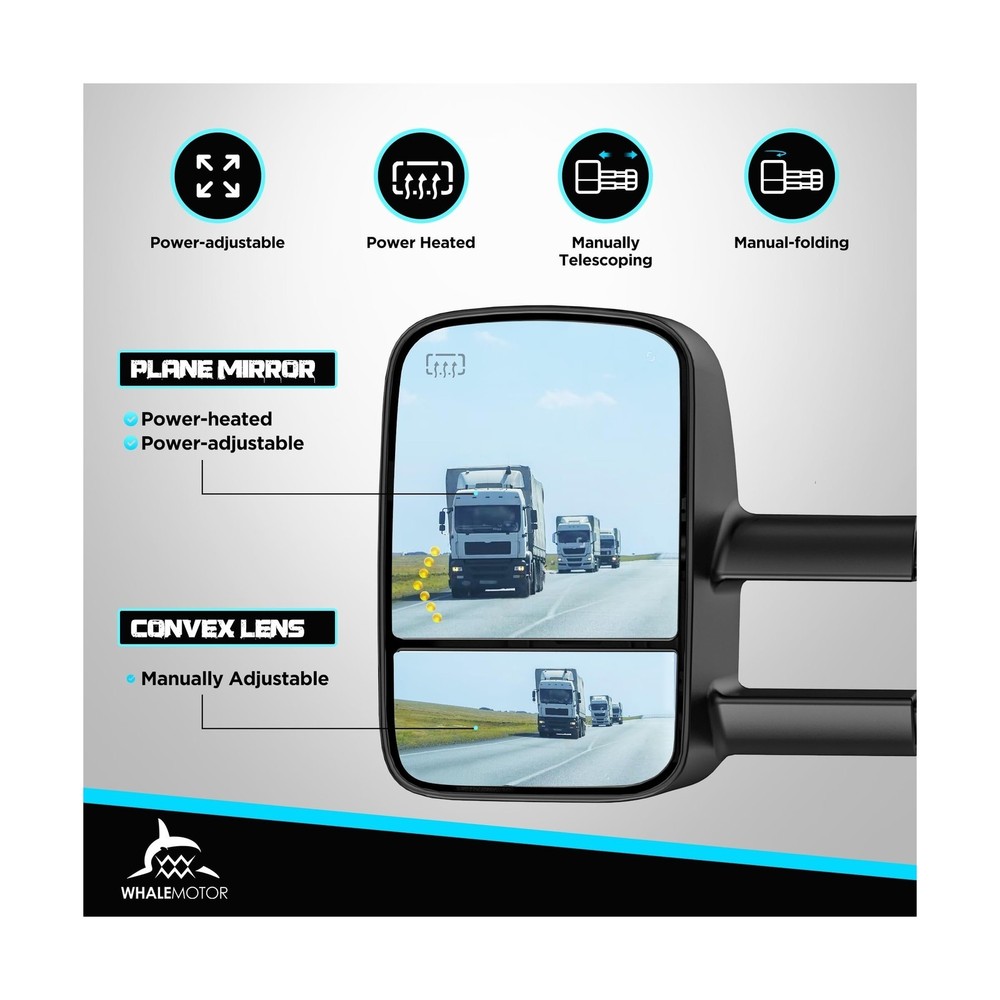 {{title} Heated Tow Mirrors Compatible with 2003-2007 Chevy Silverado GMC Sierra(2007 Classic) 1500 2500 3500, Tahoe Suburban Avalanche Yukon Escalade, Extended Trailer Towing Side Mirrors LED Turn Light Description Features: Vehicle fitment: 2003 2004 2005 2006 Chevrolet Silverado & GMC Sierra 1500 2500 3500 HD, 2007 Silverado & Sierra 1500 2500 3500 classic, 2003-2006 Chevy Tahoe & Suburban & Avalanche, 2003-2006 GMC Yukon & Yukon XL, 2003-2006 Cadillac Escalade. Eliminate blind spots: A wide angle & adjustable flat mirror provides a clear view of the traffic, a convex mirror provides broader view of the objects behind and alongside the vehicle. Extendable arms: Manual adjust the length of the arm to better suit your needs, help you see around the trailer more easily, ensure road safety. Safer Lane Changing: Built-in turn signals are more visible to other drivers when you are turning or changing lanes, especially when towing a trailer that may obstruct your rear lights. Essential in foggy conditions: The electric heating element inside the mirror glass helps to quickly defrost and clear any moisture, very important when towing in harsh weather conditions. Product Details: Auto Part Position: Front Outside Material: Acrylonitrile Butadiene Styrene (ABS), Aluminum, Glass Brand: WHALEMOTOR Vehicle Service Type: Truck Color: Black Mounting Type: Door Mount Included Components: a pair of tow mirrors, Include driver side and passenger side. Special Feature: Adjustable, Extendable, Foldable, Heated, Manual Telescoping Fit Type: Vehicle Specific Fit Shape: Rectangular Auto Part Position: Front Outside Brand: WHALEMOTOR Color: Black Mounting Type: Door Mount Included Components: a pair of tow mirrors, Include driver side and passenger side. Special Feature: Adjustable, Extendable, Foldable, Heated, Manual Telescoping Fit Type: Vehicle Specific Fit Shape: Rectangular Automotive Fit Type: Vehicle Specific Fit Manufacturer: WHALEMOTOR Lens Curvature Description: Convex Model: Compatible with 03-07 Chevy Silverado & GMC Sierra with Built-in Arrow Turning Light Item Weight: 16.37 pounds Package Dimensions: 20.9 x 14.6 x 11.6 inches Item model number: 2003-2006 Exterior: Machined Manufacturer Part Number: WMTM-0002 Special Features: Adjustable, Extendable, Foldable, Heated, Manual Telescoping Lift Type: Power Date First Available: July 16, 2023 Delivery We Do Not Ship Outside of the Continental US. Return Policy All items qualify for returns within 30 days of receipt. Buyer is responsible for return shipping on any item that is not damaged. Feedback We take our reputation seriously, we buy and sell online, so we understand the value of trust. If you are unsatisfied with your order, please contact us and we will work with you to resolve it to your satisfaction. Delivery We Do Not Ship Outside of the Continental US. Return Policy All items qualify for returns within 30 days of receipt. Buyer is responsible for return shipping on any item that is not damaged. Feedback We take our reputation seriously, we buy and sell online, so we understand the value of trust. If you are unsatisfied with your order, please contact us and we will work with you to resolve it to your satisfaction.