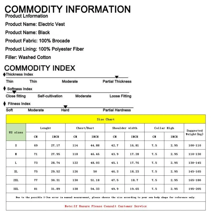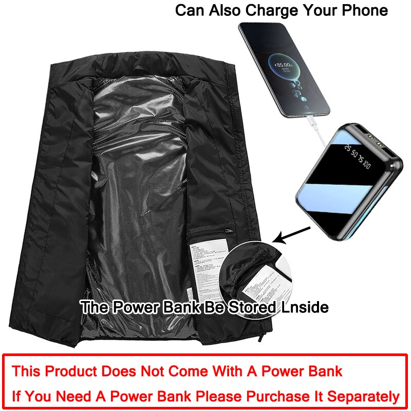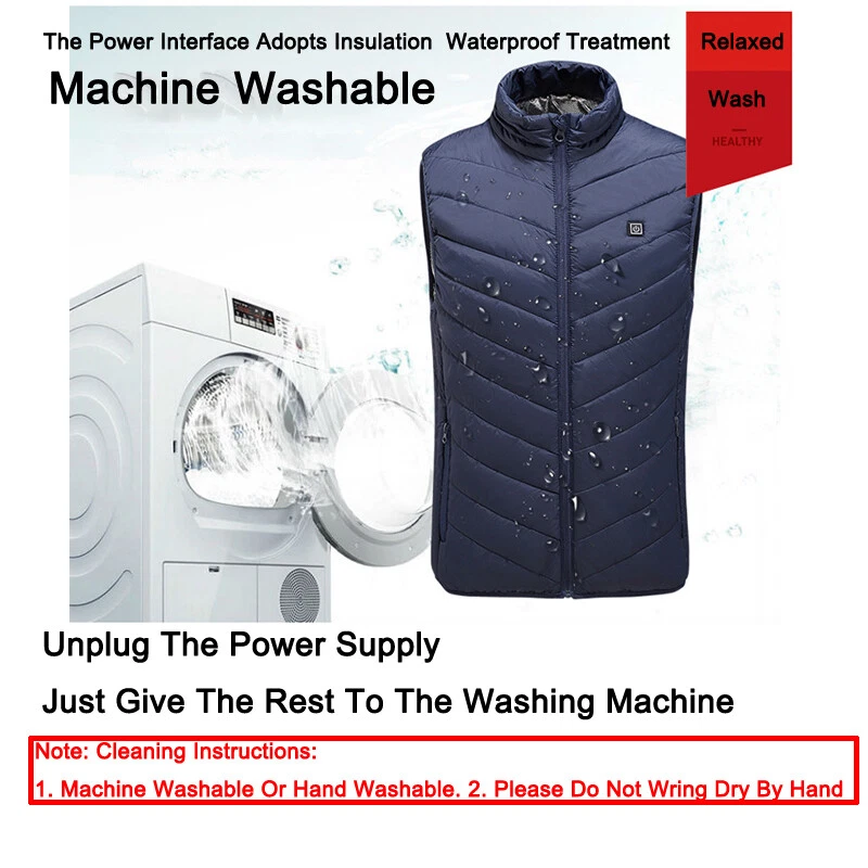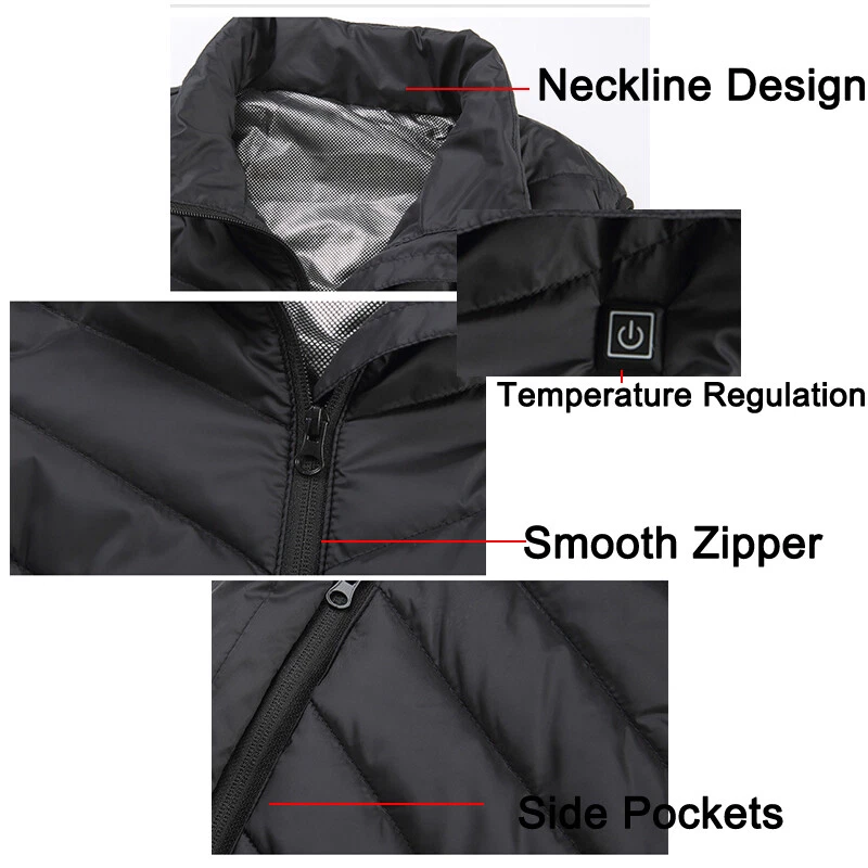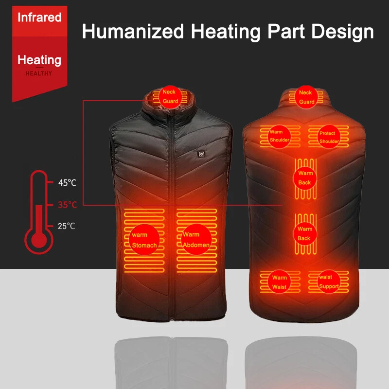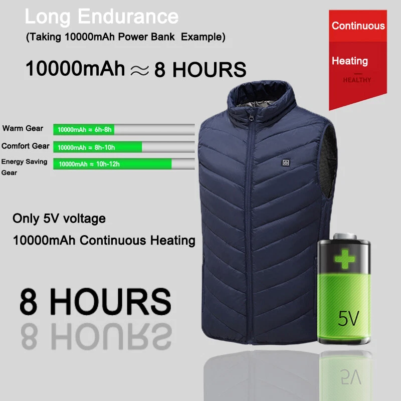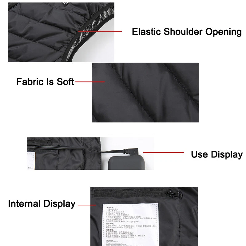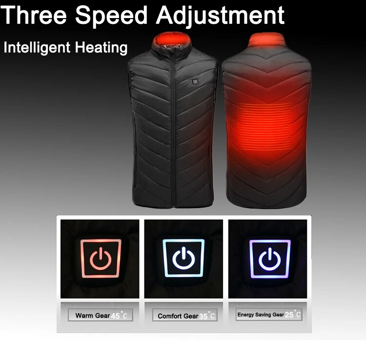 Product Description Material: Polyester Color: Black Size: S-3XL Power Supply Interface: USB Fever Area: Back Function: Keep warm, Anti water splashing and Prevent cold Age Of Application: Adult Men/Women Temperature Shift(Manual adjustment) Warm:45 ℃ (Red Light) Comfort:35 ℃ (White Light) Energy Saving:25 ℃ (Blue Light) Regarding logistics and payment matters . Payment can only be accepted through PayPal (payment through PayPal is safe and fast) . We do not provide combined transportation services. You need to pay in full for each shipment and insurance.(We will ship within 1-3 working days after payment is settled) . If you have any dissatisfaction or questions about your purchase, please feel free to contact us via eBay message.We will reply to you within 1-2 working days(Due to time differences, we will reply within 24 hours) Features . This is a intelligence vest for you. With mobile power storge pocket, easy travel. 1 minutes fast heat, dispel cold and keep you warm. Set the temperature you want to respond to a variety of environments. A button to heating, three stall temperature control, intelligent heating. It can be washed by machine and can be washed by hand. Do not wring it by hand. General USB interface power supply, longer service life,anti water splashing and washable. The fashion is warm, comfortable and breathable, and it's a good partner for your winter going out. Cleaning instructions: 1.Take out removable charger. 2.Neutral detergent is available and then hand wash. 3.Do not force knead or beat. 4.After nature air drying can be use. Warm Tips: 1.If not used for a long time,please do not plug in removable charger 2.Do not use high temperature water or strong acid detergent. 3.Forbidden to use electricity for wet clothes,Please turn off the power and stop using if cloth is wet. 4.Use time depending on the capacity of removable charge. How To Use: 1.Take out USB plug 2.Plug in removable charger 3.Switch on the removable charger 4.Press the chest temperature control switch for two second 5.Red light flashing,means heating automatic 6.After red light flashes for 5 minutes,then automatic turn to white light,means medium temperature 7.Manual adjustment has three level,red light means hign-temperature heating continuously. White light means medium heating continuously,blue light means low heating continuously 8.Press the chest temperature control switch for two second,lights out and stop heating Size