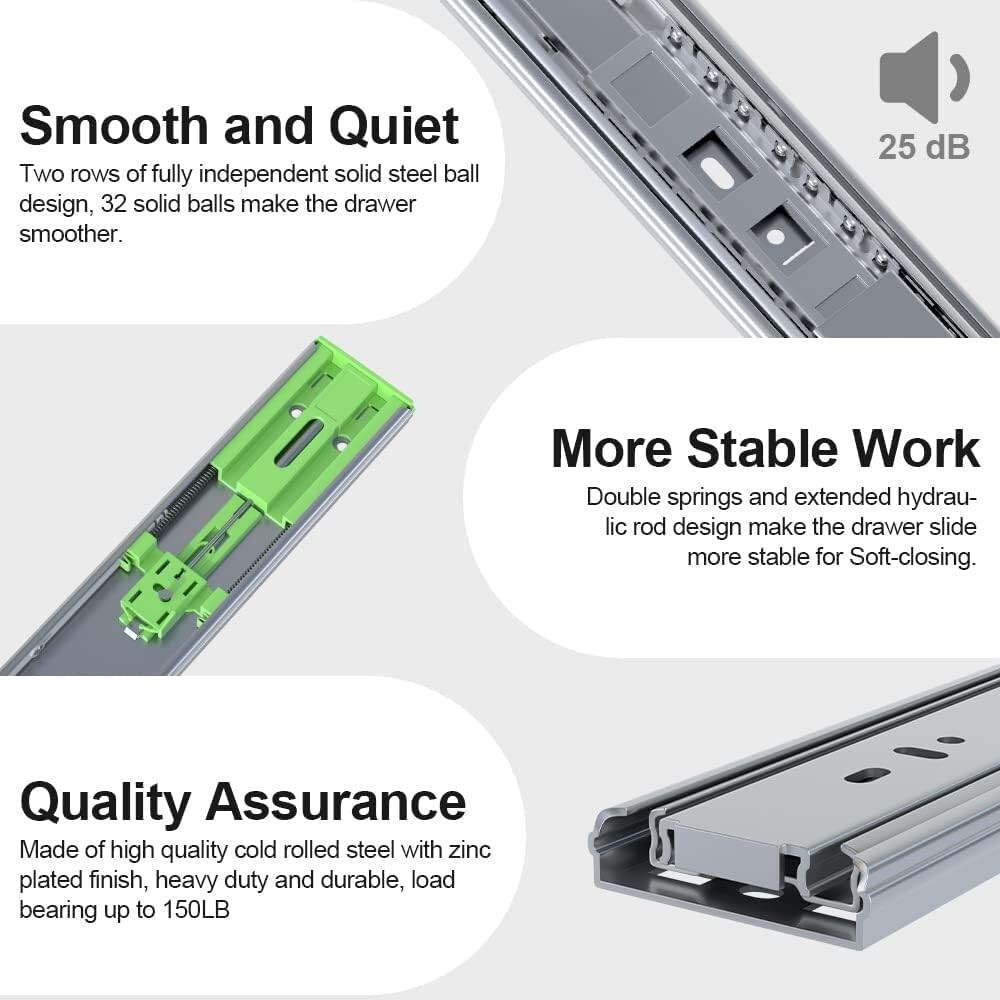 These drawer slides are amazing! Super smooth soft-close action holds up to 150 lbs effortlessly. Perfect upgrade for cabinets - installs easily and works like a dream. No more slamming drawers!