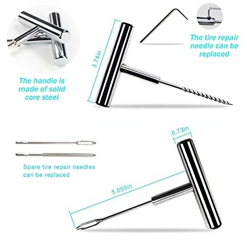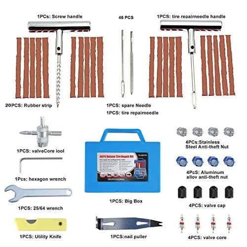 46 Pcs Tire Repair Tools and Labor-Saving Design - Containing the elaborate 46 pieces, this tools can meet all your needs on tire repairing work totally. Tire repair kit is strictly complied with the top production standards and the scientific design concept to enable you to save time, worry, and effort. Superior Quality's Materials - Better than any other brand, our T-handle is made of the solidest A3 steel material which is stronger than others and is hard to break. The Tire Repair Strip is used the best rubber which is durable and not easy to age and harden. Aluminum alloy and stainless steel anti-theft nut can better protect the tire from damage. Adaptable to More Tires and Bigger Punctures - This kit has extensive applicability design, which can repair more types of tires for up to 3CM punctures, like glass, piton, rock punctures of auto, motorcycles, tractors, lawnmowers, dirt bikes, trailers, jeeps, or trucks, etc. You can use it in a big truck comfortably. Neat Parts in Exclusive Positions and Detailed Instruction for Faster Repair - the parts are arranged neatly. A detailed procedure instruction is included to ensure anyone can repair their flat tire in the right and quick way. The spiral probe and insert tools which are made of high-strength steel, can let you easily .pierce the repair plugs and quickly finished the repair work. Gift Idea & Sturdy Box -20* Brown strings;4*Aluminum alloy anti-theft nut ;4*tainless steel anti-theft nut;4*Plastic valve core nut ;4*valve core;1* 4-way valve steam tool;1*Anti-theft nut wrench ;1*nail puller;1*Hexagonal wrench ; 2* Solid A3 Steel T-handle grips;2* Needle replacements;1*pocket knife ;1*tool box; 13 Pcs 【Essential Tire Repair Kit】 - Quickly fix flat tires and get back on the road with this compact tire repair kit, suitable for tubeless tires on cars, SUVs, motorcycles, enduro bikes, and lawn mowers. 【Ergonomic T-Handle for Comfort and Control】 - The T-handle tools are crafted with a durable, ergonomic grip, featuring a soft yet firm exterior that minimizes hand fatigue during use. This comfortable design provides maximum leverage and control, allowing you to tackle punctures with ease and confidence, even on tougher tires. 【Self-Vulcanizing Tire Plugs】 - Includes 10 premium self-vulcanizing plugs, ensuring a secure and reliable seal for most small punctures on tubeless tires. 【Compact Blister Packaging】 - Packaged in a blister card for easy storage and access, ideal for glove compartments or emergency toolboxes. 【Complete Components for Quick Repairs】 - This kit includes everything you need for emergency tire repairs: a T-handle insert tool, a T-handle rasp tool, 10 self-vulcanizing tire plugs, and a compact utility knife. Perfect for tackling punctures on the go, all in a convenient blister pack. 【High-Quality Construction】 - Made with premium steel and high-quality materials, this tire repair kit is designed for durability, flexibility, and eco-friendliness, ensuring reliable performance in emergency situations. Thank You