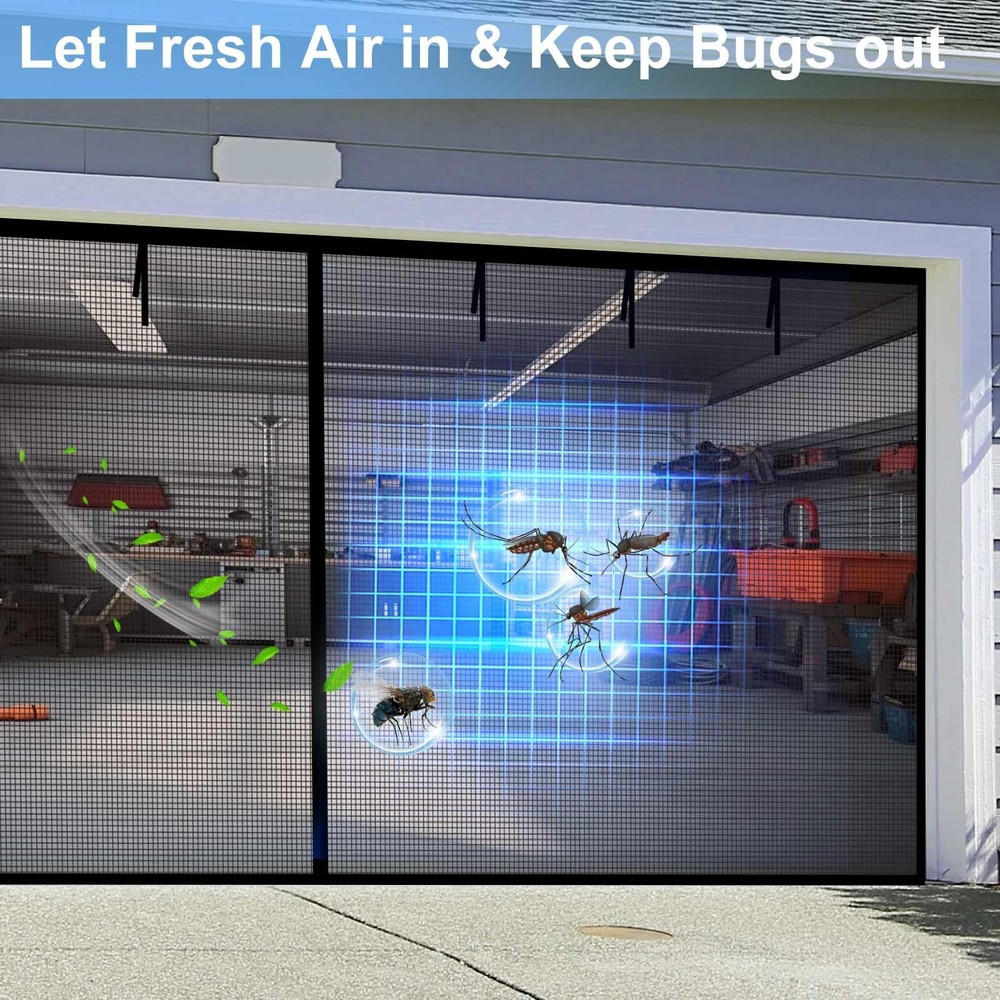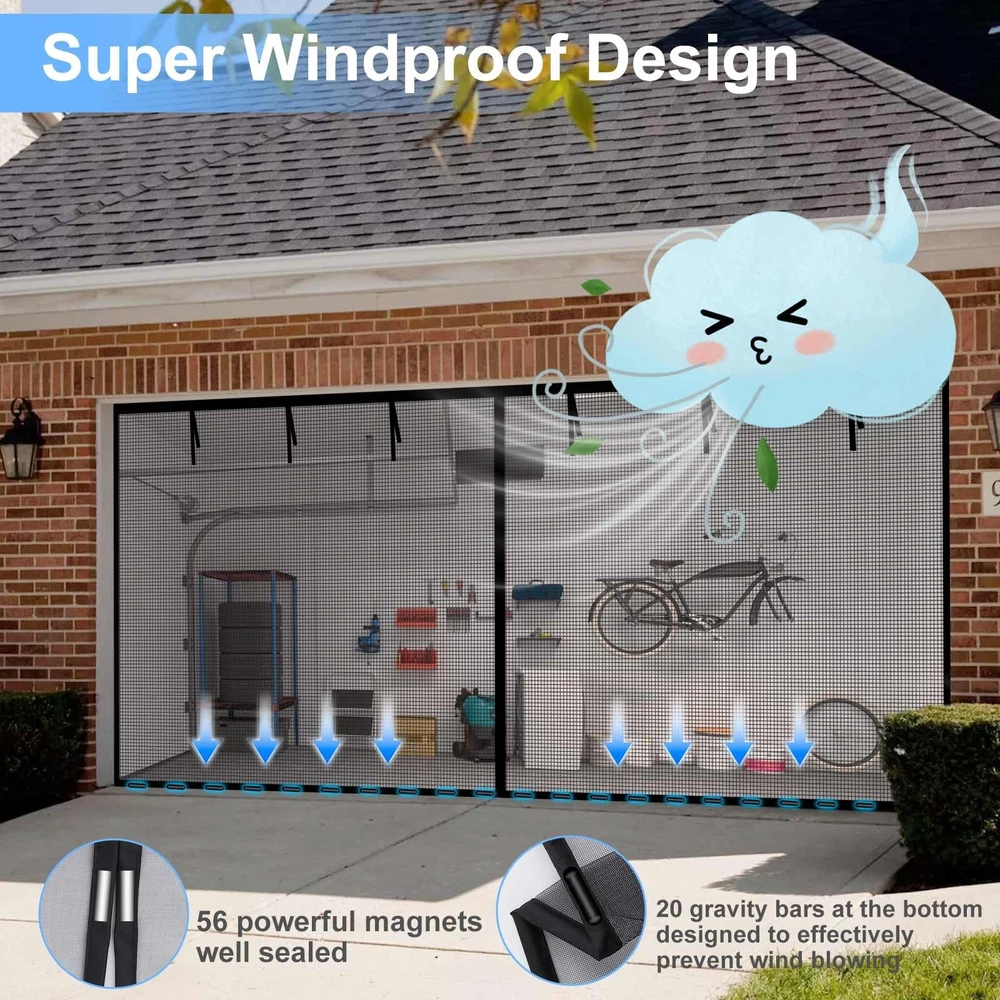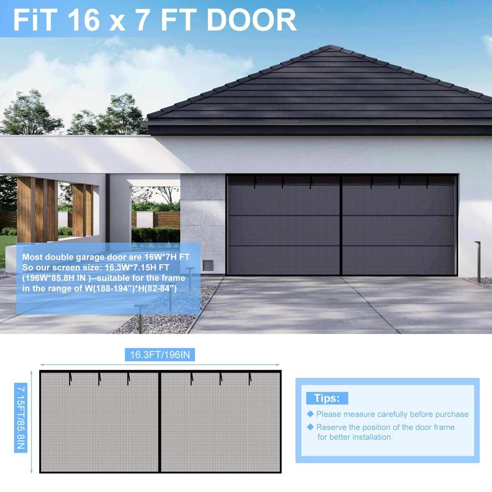 Introducing our innovative Garage Door Screen, the perfect addition to your garage accessories collection! This retractable garage screen door is designed specifically for 2 car garages, with a heavy-duty mesh screen that is perfect for keeping bugs out while allowing fresh air to flow through. Our garage screen doors for 2 car garage feature 20 extra gravity sticks added to the bottom sides, ensuring that the screen stays securely in place. The built-in 28 pairs of strong magnetic points make it easy to open and close the door, while the widened Magic Tape at the top provides added stability. With 6 strapping tapes directly sewn onto the screen, this garage door screen is tear-resistant,breathable, and wear-resistant. The black color and heavy-duty upgraded diamond yarn material give it a sleek and modern look that will complement any garage door. This garage mesh screen door 2 car is not only functional, but also convenient for kids, dogs, and cats to go in and out of the house with ease. The extra-large magnetic screen door is perfect for providing privacy in your garage, while the magnetic porch screen adds to the overall aesthetic of your space. Don't settle for just any bug screen for garage doors - choose our garage net screen 2 car heavy duty for a high-quality, durable solution. Say goodbye to unwanted pests and hello to fresh air with our innovative screen doors with magnets for garage. Upgrade your garage equipment today with our top-of-the-line garage door screen! EASY INSTALLATION & DURABILITY: This garage door screen is designed for quick setup, making it one of the most convenient garage accessories. Built with heavy duty upgraded diamond yarn material, it ensures long-lasting performance for your garage screen doors for 2 car garage. ENJOY FRESH AIR & PRIVACY: Transform your garage into a comfortable space with this bug screen for garage. The screen garage door mesh 16 x 7 ft keeps bugs, debris, and leaves out while allowing fresh air in, perfect for garage door privacy and relaxation. HEAVY DUTY MAGNETIC DESIGN: Featuring built with 28 pairs strong magnetic points and extra 20 gravity sticks, this extra large magnetic screen door offers superior wind resistance and easy walk-through access for kids, pets, and adults. UPGRADED RETRACTABLE FUNCTIONALITY: The retractable garage screen door includes 6 strapping tapes and a 4 cm widened top Magic Tape for secure rolling and storage. Perfect for garage doors 16'x7, it’s detachable and foldable for off-season use. PREMIUM QUALITY & VERSATILITY: Crafted with tearing resistance and breathable materials, this garage mesh screen door 2 car is ideal for garage door dog barrier or magnetic porch screen. Measure your garage twice to ensure a perfect fit!