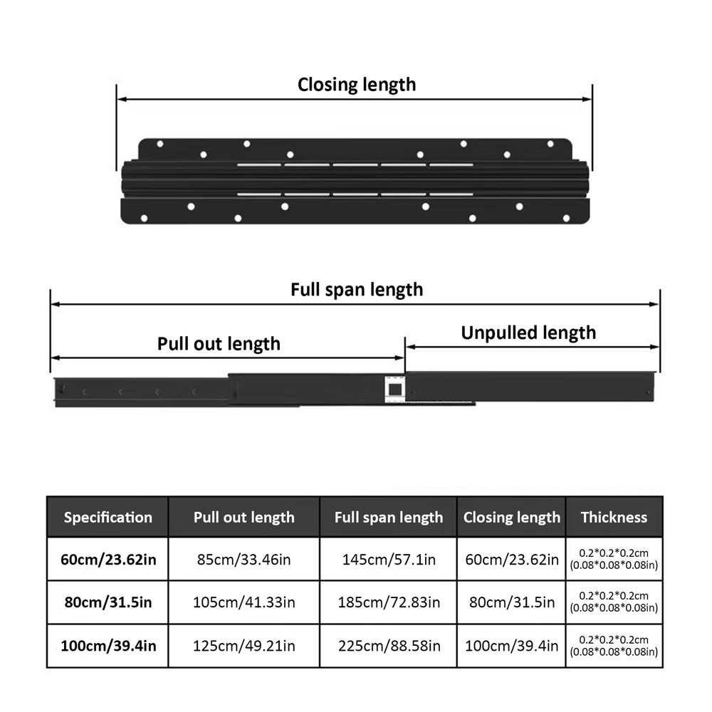 Store category Sign Up Now ! You may also like Product Description Bullet Points: Wonderful Resilience: Constructed from high-density, high-strength 2mm thick cold-rolled steel, these drawer slides boast wonderful durability. The industrial-grade solid steel balls provide heavy load capacity, ensuring a long service life for any heavy-duty industrial application. Smooth and Silent Operating: Treated with electrophoretic coating to resist rust and minimize friction, our heavy duty drawer slides are equipped with industrial-grade steel balls for a silent and smoother sliding experience. Featuring excellent load-bearing capacity, these slides are made of solid steel for lasting durability. Effortless Accessibility: With full-extension, these heavy duty drawer slides allow you to efficiently expand your storage space, providing ample room to screw in stairs during installation and access items easily on a daily basis. Effortless Glide: By adding 12 more steel balls on the same track length, our heavy-duty drawer slides enable gently sliding and labor-saving operating. The anti-collision silencers prevent sticking and noise when opening or closing, making it a strong and stable product. Versatile Mounting: Our heavy-duty drawer slides provide enhanced stability and support for any tall and heavy cabinet, making them ideal for bottom mounting in sundry cabinets, wine cabinets, stair cabinets, and storage units. Don't compromise on stability. Our bottom mounted drawer slides are made of high-density, high-strength 2mm thick cold-rolled steel. They improve the load-bearing capacity of the slide and can be extended efficiently. Our slides are more labor-saving and perfect for your storage cabinets. Specifications: Product name: Heavy Duty Drawer Slides (screws included) Product size: 600/800/1000 mm A about 600 mm/23.62 inches B about 800 mm/31.5 inches C about 1000 mm/39.37 inches Stretching range: 600-1450/800-1850/1000-2250 mm Maximum load: about 120 kg Packing quantity: 1 pair Color: Black Track width: about 94mm/3.7 inches Packing List: 2* Cabinet Drawer Slides Note: Due to different lighting and screen settings, the item color may be slightly different from the picture. Due to different manual measurements, please allow a 1-2cm difference in size. Payment Delivery details Terms of sales About us Feedback & DSRs Payment Before you palce an order, please kindly make sure that you have a paypal account. We accept PAYPAL payment only. Payment should be completed within 2 days after auction closed, or unpaid dispute will be filed for an closing auction. An unpaid case will be filled after 4 days. Delivery details We ship to your eBay address. Each package will be shipped to US by UPS Regular Parcel with tracking number. Please check your shipping address carefully before checkout, it can't be changed if order completed. All items will be shipped within 1-2 business day upon receipt of payment.Orders placed on weekend will be shipped within 3 days. If you do not receive your item in 7-10 business days.please contact us immediately for further assistance. We will be responsible for any damages or losses incurred in the shipping process. About us We maintain high standards of excellence FIVE STAR and strive for 100% customer satisfaction! Positive Feedback is very important to us. We hope that you contact us immediately Before you give us neutral or negative feedback, so that we can satisfactorily address your concerns. We promise to offer the lowest price and high quality produce. Our working time: From Monday to Friday(9:30 am to 18:00pm), we don't working on holidays ,hope you can understand and know that , thank you. Please always talk to us via ebay Message. We appreciate your business and look forward to growing our e-Bay sales with satisfied customers. Feedback Contact us If you have any questions, please feel free to contact with us by ebay Message during our business hours ( 9:30a.m. to 5:30 p.m.), or email us through eBay, we will try our best to help you to resolve it. For any presale or after-sale questions,please do feel free to email us! Due to the time difference, each email will be replied within 1 working day,and weekend will be delayed a bit. Feedback