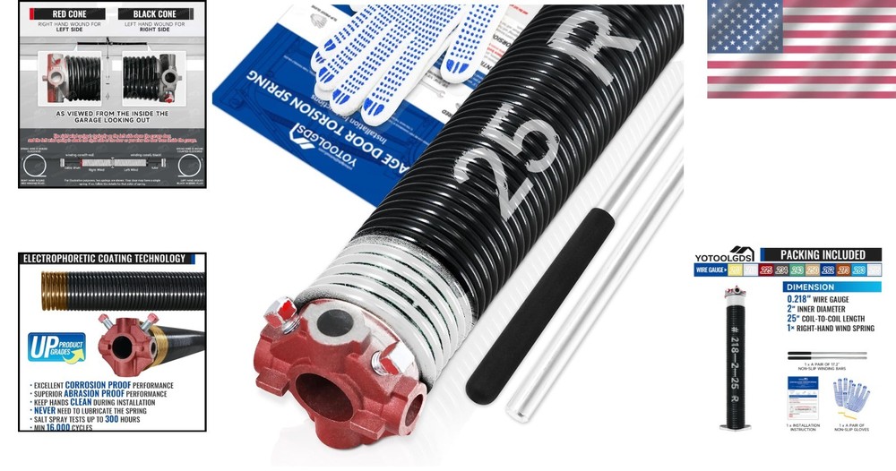 Heavy Duty 2" Garage Door Torsion Spring with Non-Slip Bars & Gloves Included ‹ › ‹ › ‹ › ‹ › ‹ › ‹ › ‹ › ‹ › ‹ › Heavy Duty Garage Door Torsion Spring Your trusted garage door solution features a powerful combination of strength, safety, and ease of installation. Ideal for those looking to enhance their garage experience with a top-tier replacement spring. Product Specifications: Type: Right Hand Wound Replacement for Left Side (Red Cone) Dimensions: 0.218” wire size x 2” inside dimension x 25” length Packaging: Single Pack Included in the Package: 1 x Heavy Duty Garage Door Torsion Spring A pair of 17.2’’ Non-Slip Winding Bars Protective Gloves for safe handling Comprehensive Installation Instructions Key Features: Constructed from heat-treated professional spring steel coils for extreme durability. Aluminum cones provide added strength and longevity. Advanced electrophoretic coating ensures excellent corrosion and abrasion resistance. Tested for salt spray resilience up to 300 hours and a minimum lifespan of 16,000 cycles. No need for lubrication, keeping your hands clean during installation. Benefits: Heavy-duty construction guarantees reliable performance and longevity. Simple and quick installation process saves both time and money. Comprehensive package ensures you have everything needed to get started. Enhanced safety features make handling easier and safer. Why Choose This Torsion Spring? Investing in a Heavy Duty Garage Door Torsion Spring means choosing peace of mind and reliability for your garage. This meticulously engineered product is designed for those who value strength and safety. With immediate benefits from a simple installation process, you can ensure your garage door operates smoothly for to come. Don’t compromise on quality - equip your garage with our Heavy Duty Torsion Spring today and experience a seamless upgrade! Shipping Free & Fast Shipping - We offer free shipping to most of the USA with a normal delivery time of 3-7 days. However, due to the current situation, additional delivery time (up to 3 weeks) may be required for some items. Alternative Carriers - We may use alternative carriers (e.g. USPS, FedEx, UPS, etc.) to ensure your package arrives safely and on time. Due to the use of multiple carriers, we are unable to provide a tracking number automatically. Handling Time - Orders are processed and shipped within 1-2 business days of receiving cleared payment. Shipping Restrictions - Shipping to Alaska, Hawaii, Puerto Rico, Guam, and other US territories may incur shipping charges or delivery restrictions. Please contact us before ordering, or your order can be refunded/cancelled. State Restrictions - There may be restrictions based on your state of purchase. For example, certain items may not be shipped to California due to state regulations. Contact for Tracking Updates - If you require tracking updates or have any concerns about the delivery of your order, please feel free to contact us, and we will be happy to assist you. Return 30-Day Hassle-Free Returns - We want you to be completely satisfied with your purchase. If you are not, you can return the item within 30 days of receiving it for a full refund or exchange. Easy Return Process - To start a return, simply contact us and we will provide you with a prepaid return shipping label and detailed instructions. Restocking Fee - There are no restocking fees for returns. However, the buyer is responsible for return shipping costs if the return is not due to a seller's error. Refund Processing Time - Refunds will be processed within 5 business days of receiving the returned item in its condition. Payment We accept all major credit cards, PayPal, and Apple Pay for your convenience. Your payment information is secure and encrypted to ensure a safe and seamless transaction. Please complete your payment within 3 days of purchase to avoid any delays in shipping. Feedback Your feedback is extremely important to us. We strive to provide the best products and customer service possible. If you are satisfied with your purchase, please take a moment to leave us a positive review. If you have any concerns or issues with your order, please contact us before leaving negative feedback. We are committed to resolving any problems and ensuring your satisfaction. Contact Us If you have any questions or concerns, please feel free to out to our customer support team. You can contact us through the eBay messaging system. We are available Monday to Friday, 9:00 am to 5:00 pm EST, and we will do our best to respond to your inquiry within 24 hours. Buy it now and enjoy a pleasant shopping experience! Item Depth: 3.32 inches Item Weight: 11.86 pounds Unit Quantity: 1 Material: Aluminum,Steel Features: Corrosion Proof,Abrasion Proof,Heavy Duty,Non-Slip Winding Bars,Easy Installation Required Tools: No Tools Required Color: Black Type: Torsion Spring Operation: Manual Finish: Electrophoresis Coated Unit Type: lb