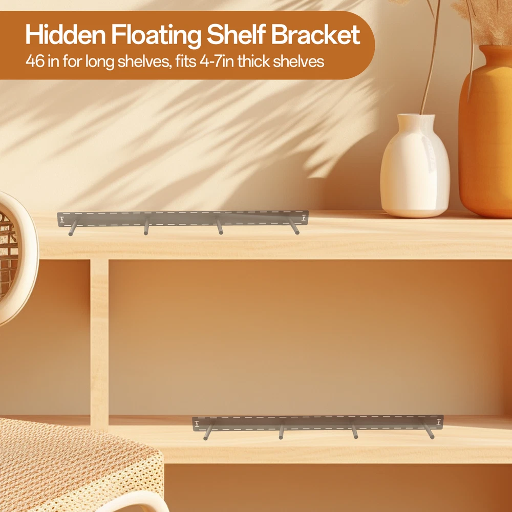 These floating shelf brackets are a game-changer! The heavy-duty steel construction feels incredibly sturdy, and the invisible design gives shelves a sleek, floating look. Installation was a breeze—no complicated tools needed. Perfect for books, decor, or even heavier items. Love that they come in a set of two, making them great for symmetrical setups. The 46" length offers plenty of support, and the welded joints feel super durable. Blends seamlessly into any room style—highly recommend for an upgrade that’s both functional and stylish!