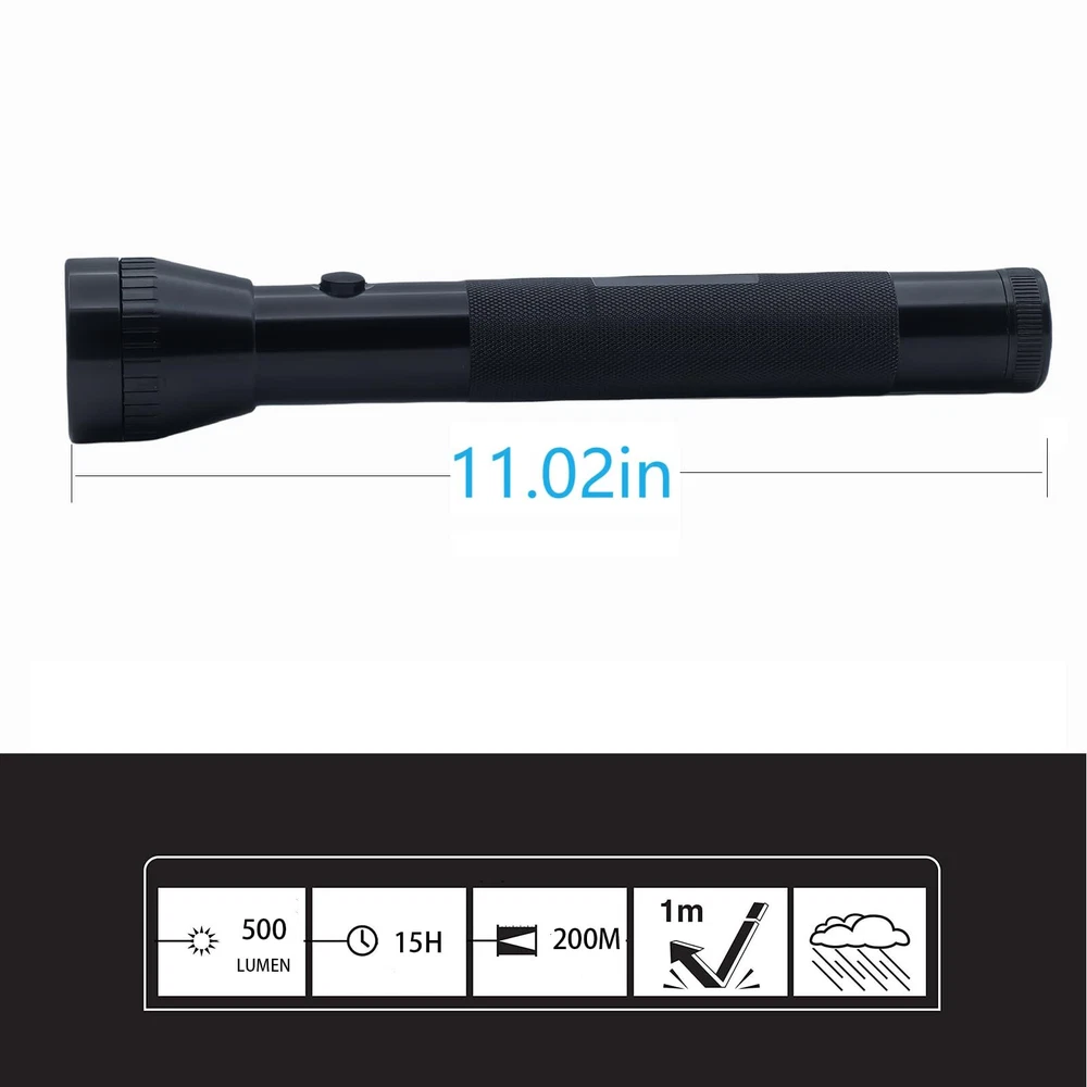 Single Mode:Just only single mode operation,easy to use。Simply turn it on and enjoy a powerful beam of light. No complicated settings or modes required. BRIGHT:Our heavy-duty 3 D LED flashlight provides an impressive 500 lumens of bright light.Whether you are outdoors or experiencing a power outage at home, this flashlight will be your reliable companion. Long Endurance:3 PCS high quality D cell batteries can providing Max 10 hours of lighting time.(Battery not included) Sturdy: Aluminum alloy case is very sturdy, drop-proof and waterproof TRUSTWORTHY: This heavy duty flashlight is built to last with our commitment to quality. We offer a satisfaction to ensure that you can count on the performance and durability of this important tool.