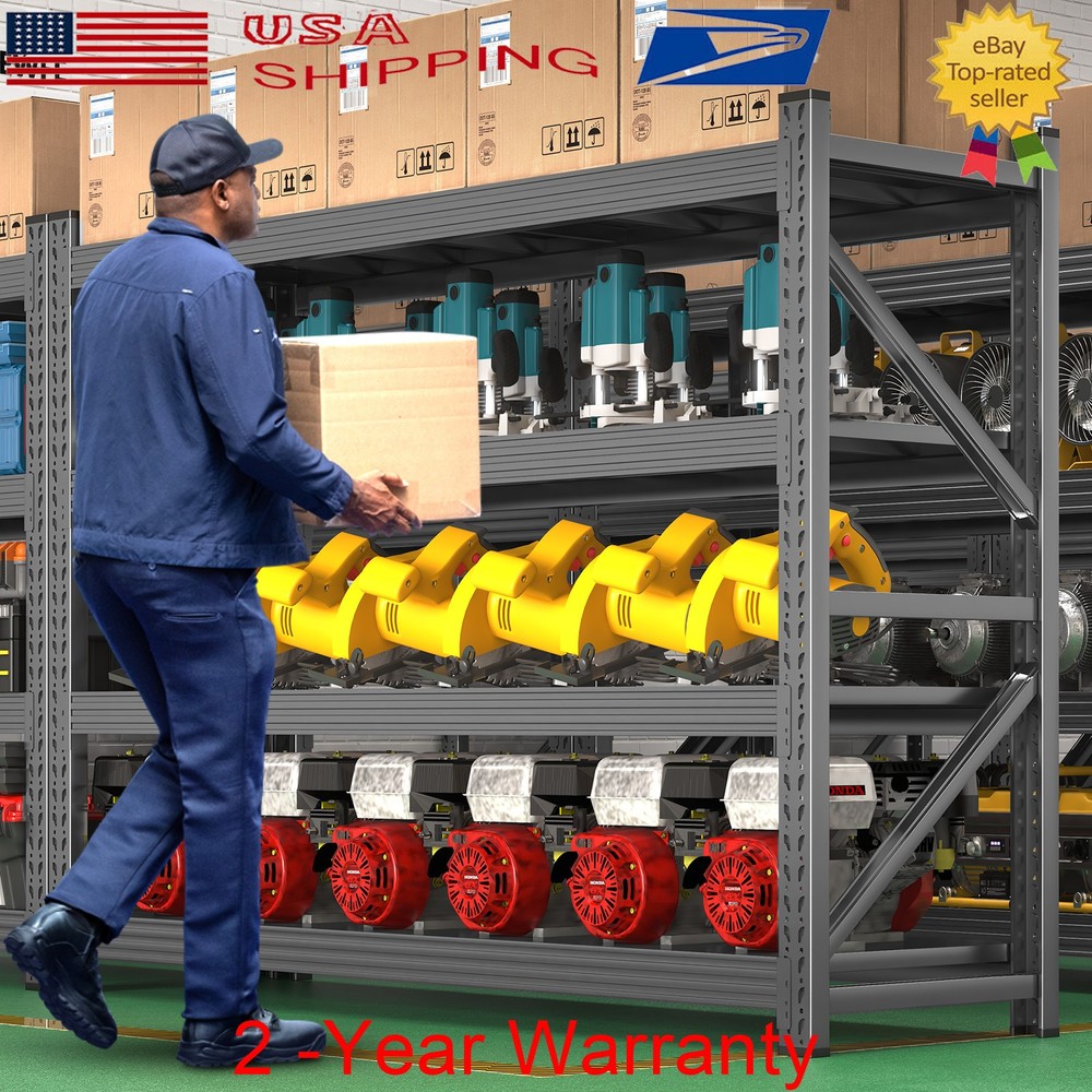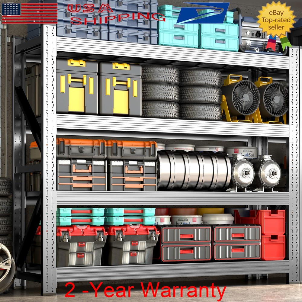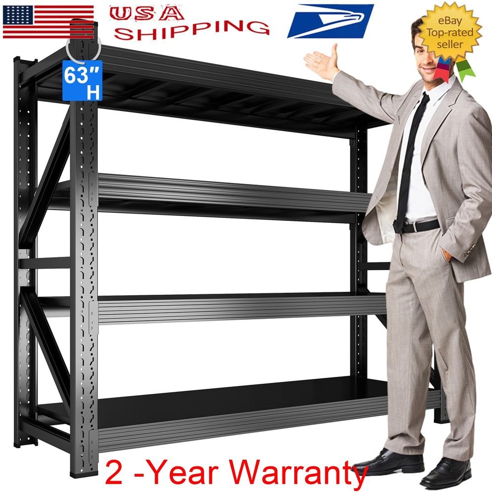 Heavy Duty 4 Tier Adjustable Metal Shelves Storage Garage Rack 63" For Warehouse Product Description Say goodbye to wobbling shelves and weak joints. Our Garage Shelving features four one-piece steel columns, thick steel shelves reinforced with ribs, and extra-wide beams for superior durability and strength. It’s perfect for storing tires, generators, tools, and more. Adjustable shelf heights let you create the setup you need, while the quick, 10-minute installation makes organization effortless. About this item 【Heavy Duty Garage Shelving Load 6000LBS 】 Designed to handle even the toughest storage challenges. With a total weight capacity of 6000 lbs and 1500 lbs per shelf, this shelving unit is built to withstand heavy-duty use. Featuring one-piece columns, dual Reinforcing Diagonal Supports, reinforced Steel shelves with three support ribs, and extra-wide beams, it offers unparalleled strength and durability. 【One-Piece Columns with Diagonal Supports 】 No seams, no weak spots. Our four one-piece columns, reinforced with diagonal supports, are the key to a sturdier, more reliable garage shelves. The seamless design, combined with the diagonal braces, eliminates wobbling and sagging, offering enhanced stability and durability for heavy-duty storage., unlike split column garage shelf that can suffer from weak joints and instability. 【Thick Steel Shelving with Reinforcement Rib】 Our shelf’s thick steel shelves, reinforced with ribs and supported by extra-wide beams, provide unmatched durability for all your storage needs. The reinforced ribs help spread the weight evenly across each shelf, while the extra-wide beams ensure maximum load-bearing capacity, preventing any bending or sagging over time. 【Adjustable Metal Shelf】 Our heavy duty shelving features adjustable shelves, allowing you to create the perfect storage system for your unique needs. Adjust the height of each shelf to fit everything from large appliances to smaller tools, and enjoy a customizable storage experience. Whether it’s for home or commercial use, this shelving unit is versatile and practical. 【Garage Shevleing with Monster Storage Space】 This extra-wide garage shelving is perfect for garages, warehouses, basements, and shops. It’s not just for home use – this shelving unit is also ideal for industrial and commercial applications. Perfect for storing heavy-duty items like tires, generators, and motor oil crates, it's built for mechanics, warehouse professionals, and anyone who needs reliable, heavy-duty storage. 【10-Minute Solo Assembly】 We’ve simplified assembly with a comprehensive installation guide and clearly labeled parts for each step. And if you run into any issues, our professional customer service is always ready to offer guidance and support, ensuring a flawless experience. Product Sizes 1PCS --- 4 Tier - 63" W x 24" D x 63" H