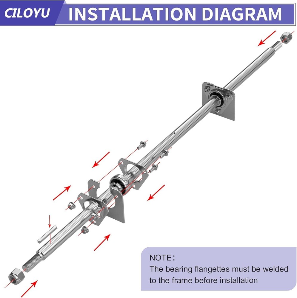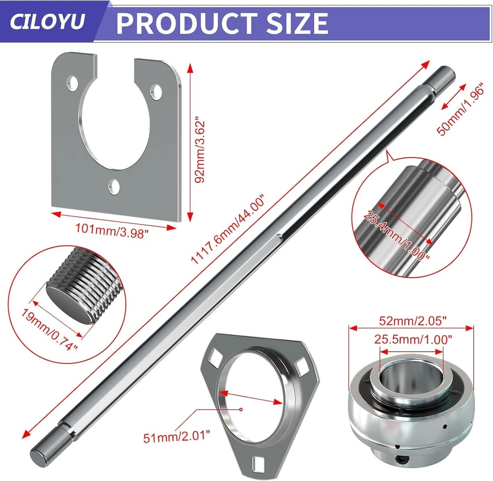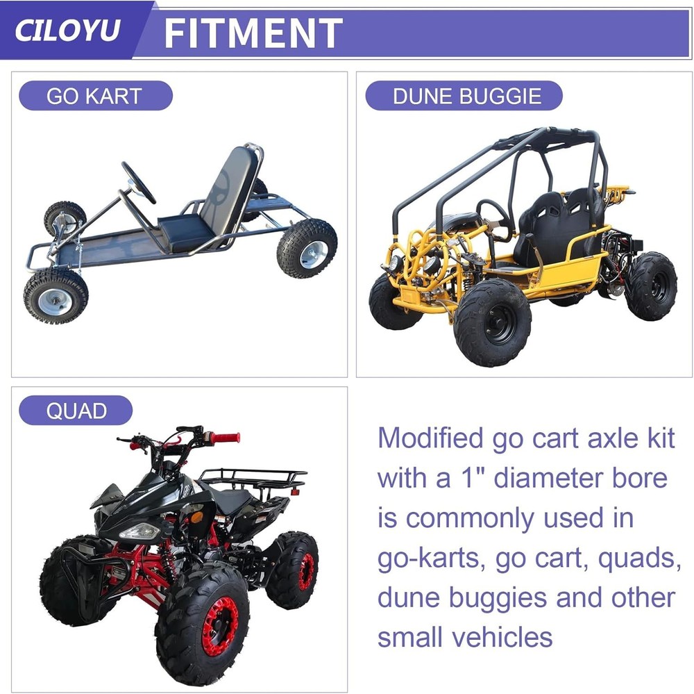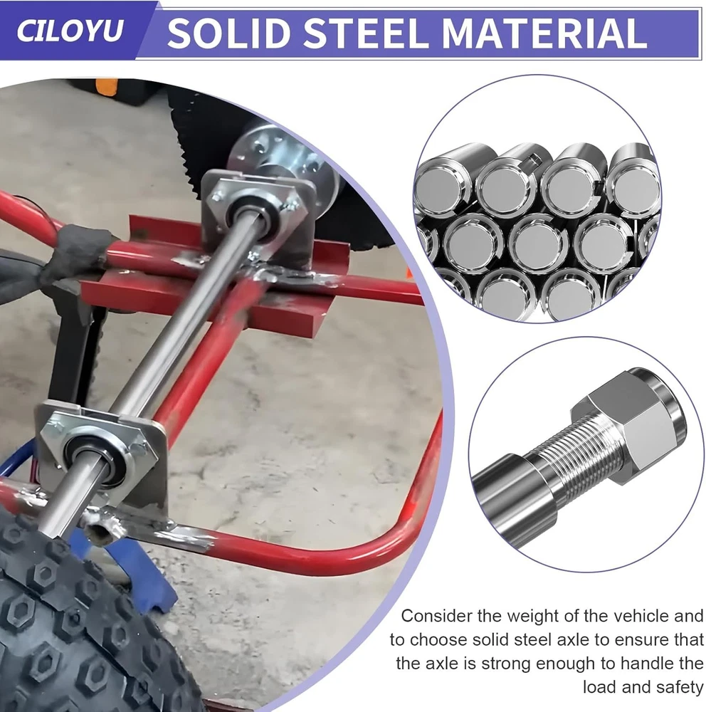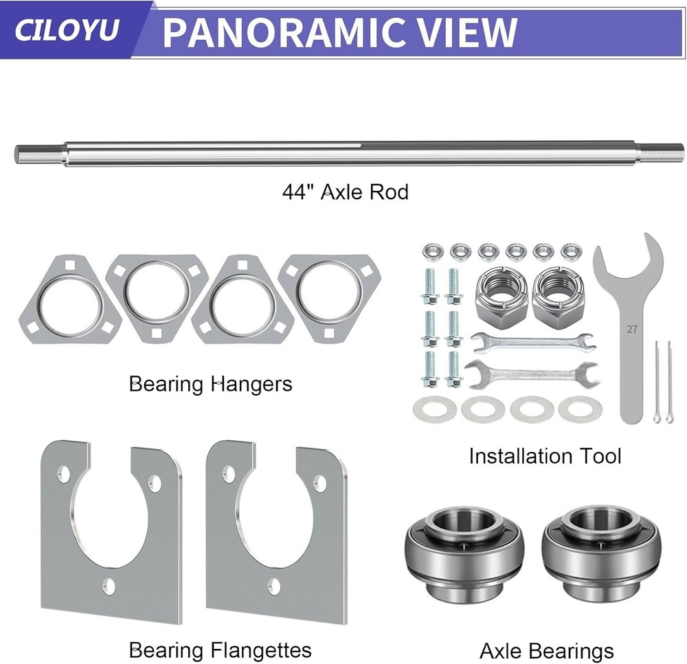 Fitment: Modified go cart axle kit with a 1" diameter and 1" live axle bearing kit is commonly used in go-karts, go cart, quads, dune buggies and other small vehicles Solid Steel Material: Made from solid materials, it is designed to withstand heavy loads and resist wear and tear, it is important to consider the weight of the vehicle and to choose solid steel axle to ensure that the axle is strong enough to handle the load and safety Enhance Efficiency: The precision ground and hardened ball bearings are a self-aligning type, which compensates for any slight misalignment of the axle to the frame mount, provides more efficient power transfer and enables faster acceleration, especially out of corners and chicanes, enjoying the racing to the fullest Size: Overall length of rear axle: 44"/ 1117.6 mm, 2" thread length on both sides, 1/4" keyway, 3/4-16" fine thread ends Package List: 1 * 1 inch axle, 2 * 1" live axle bearings, 2 * 1" 3-hole bearing flangettes, 4 * 1" bearing hangers, 1 * hardware kit, 3 * wrenches The Heavy Duty 44" Go Kart Live Axle Kit with Bearings is a high-quality product manufactured in the United States, designed for DIY projects involving go-karts. The kit includes a 44" live axle with bearings, making it easy to upgrade or repair your go-kart with durable and reliable parts. The machined exterior ensures smooth operation, while the weight of 11.97 pounds provides stability and strength for outdoor sports and recreational activities. Perfect for enthusiasts looking to customize and improve their go-kart experience.