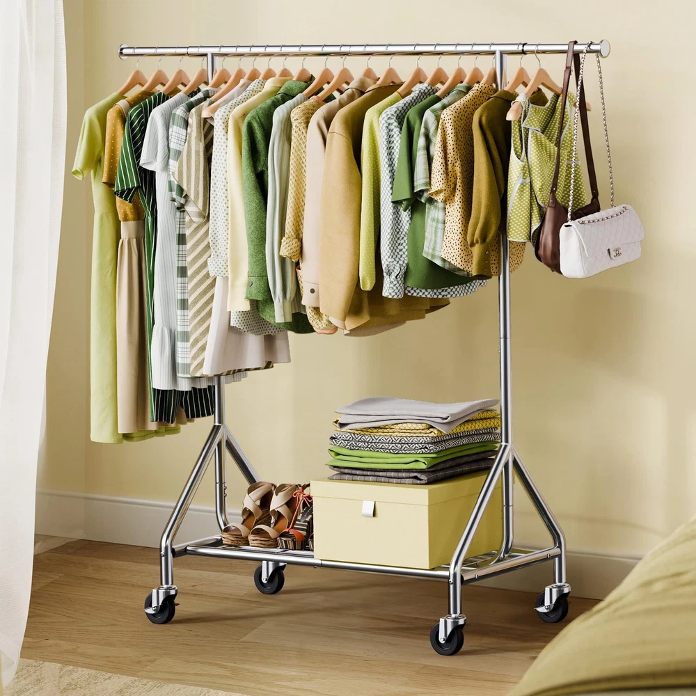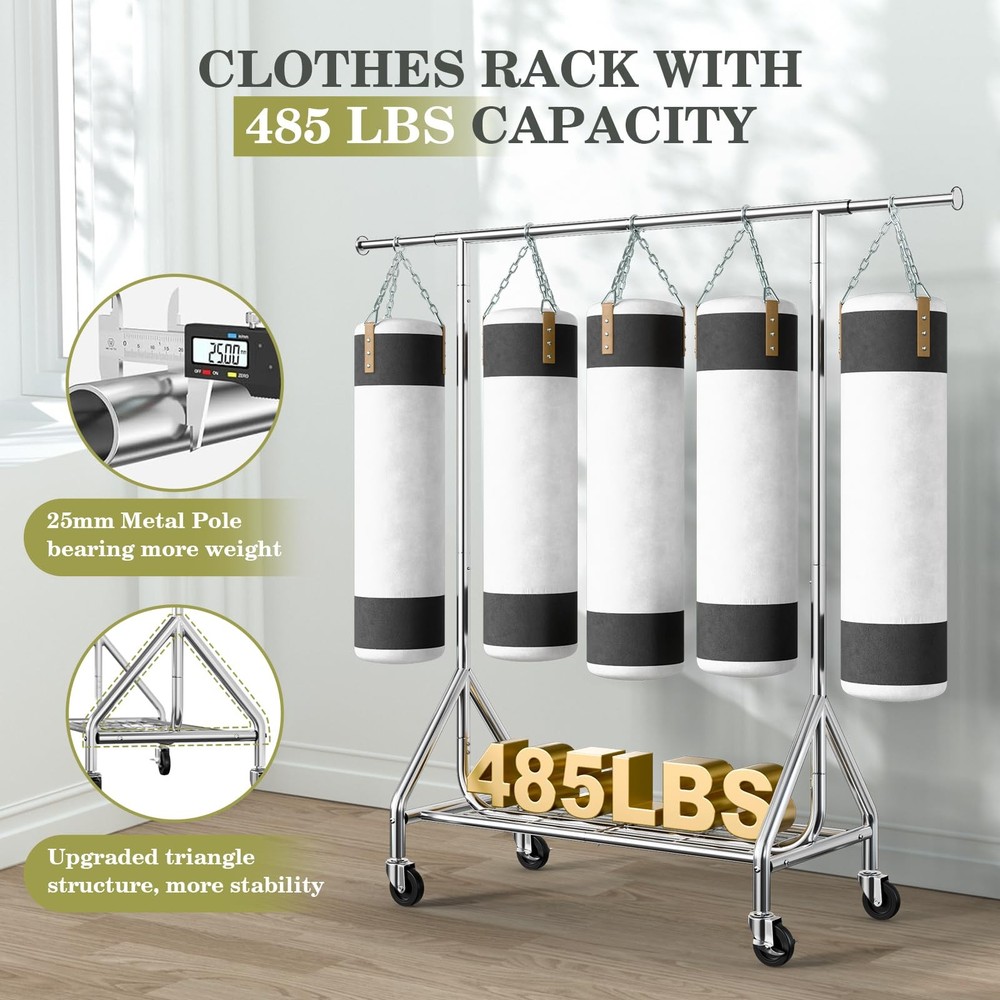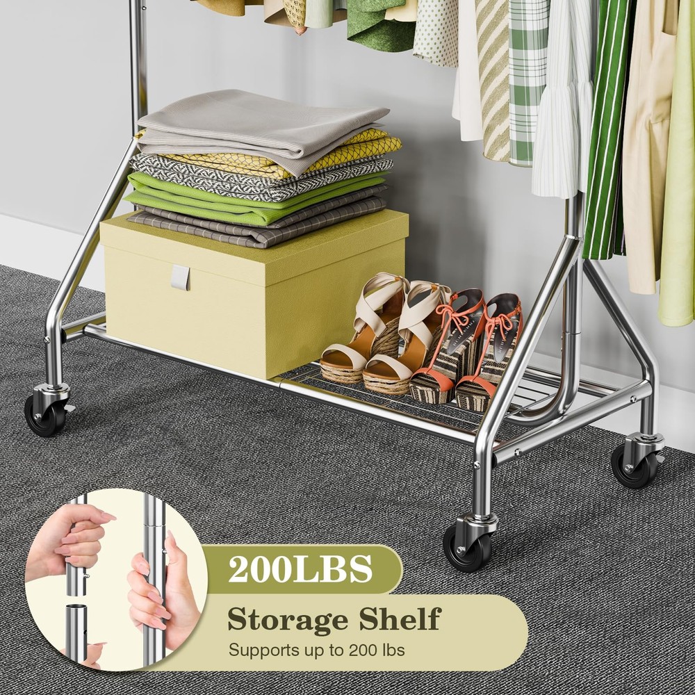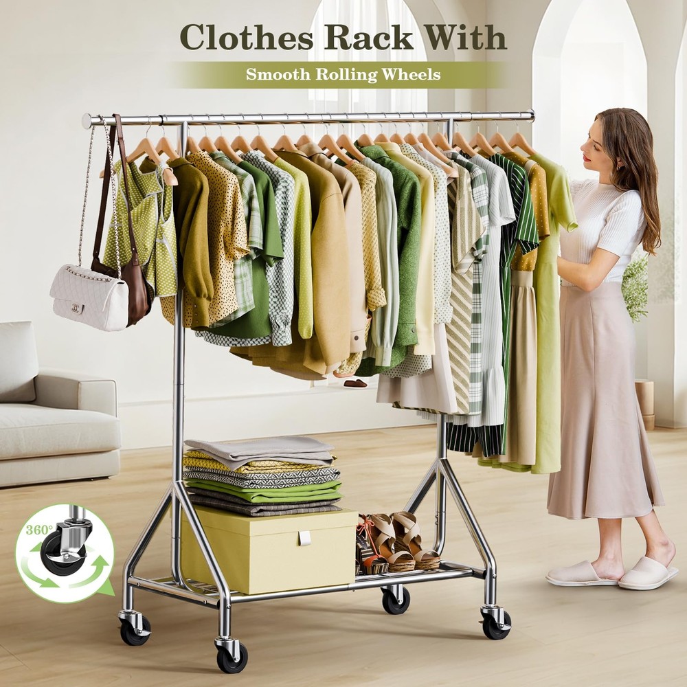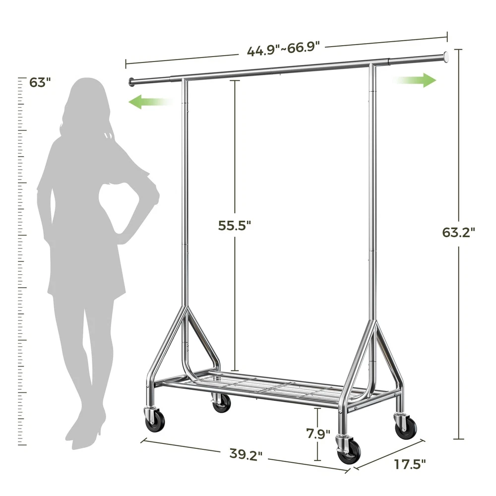Elevate your storage and display solutions with our Heavy-Duty Garment Rack on Wheels—a robust, mobile organizational powerhouse designed for both commercial and residential use. Built with industrial-grade steel and reinforced crossbars, this rack effortlessly supports up to 500 lbs, making it ideal for hanging bulky winter coats, designer garments, retail inventory. The 4 smooth-swivel casters ensure seamless mobility across any floor type, allowing you to rearrange spaces in seconds—perfect for busy boutiques, event setups, warehouses, or cluttered home closets. Heavy-Duty & Sturdy: Made from premium-grade steel, this clothing rack supports up to 450 lbs. Ultra-Stable Triangle Design, Engineered with a 1-inch metal rod and triangular bracing, securely holding your heaviest garments without bending or wobbling, ensuring your clothes stay organized and the rack remains sturdy even under heavy loads. Versatile Retractable Clothing Rack: The horizontal rod of the Holiwei adjustable clothes rack can be extended from 45 inches to 67 inches, providing enough space for your clothes, and sturdy mesh shelves provide you with larger storage space, ensuring a perfect fit for any space. Lockable Wheels Enhanced Mobility: The Holiwei rolling clothing rack features premium lockable wheels for enhanced mobility, constructed from durable materials for silent, smooth rolling. Two of the wheels have convenient foot-operated locks, letting you easily secure your rack in place with just a step, then release it instantly when you need to move it. The sturdy wheel design ensures long-lasting performance while protecting your floors. Quick & Tool-free Assembly: Our metal clothing rack features innovative snap-together design that eliminates frustrating bolts, screws or nuts. With clear step-by-step instructions, you'll have it fully set up in under 5 minutes with no tools required. Multi-Purpose Versatility: From home closets to industrial workshops, this all-in-one organizer excels in any setting! Use it as a rolling clothing rack, trade show display, garage tool station, or event decor hub. Compact yet rugged, it seamlessly adapts to residential, commercial, or industrial needs!