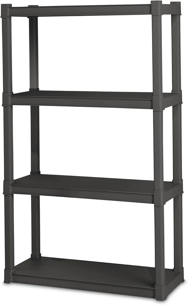 Product details: Stable Shelving Unit: Durable, 4-shelf solid surface shelving unit is great for indoor and outdoor organizing Versatile Use: Works well in playrooms, laundry areas, basements, and garages, giving you the needed versatility to conform to your unique storage and organization needs Easy to Build: Quick assembly, just snap parts together, allowing you to completely build this storage essential in no time; Dimensions (D x W x H): 14.38 x 34.5 x 57 inches Safe Organization: Ideal for organizing and storing various Sterilite containers, while the BPA-free plastic is safe for storing food Industrial Look: Rugged tubular construction for an industrial look, allowing this unit to look great in either an office, warehouse, or at home; 50-pound capacity per shelf Room Type Bedroom Number of Shelves 4 Special Feature Heavy Duty Product Dimensions 14.38"D x 34.5"W x 57"H Style 1 Pack Age Range (Description) Big Kid Finish Type matte Brand Sterilite Product Care Instructions Wipe with Dry Cloth Size 1 Pack Material Plastic Mounting Type Floor Mount Shelf Type Plastic Shape Rectangular