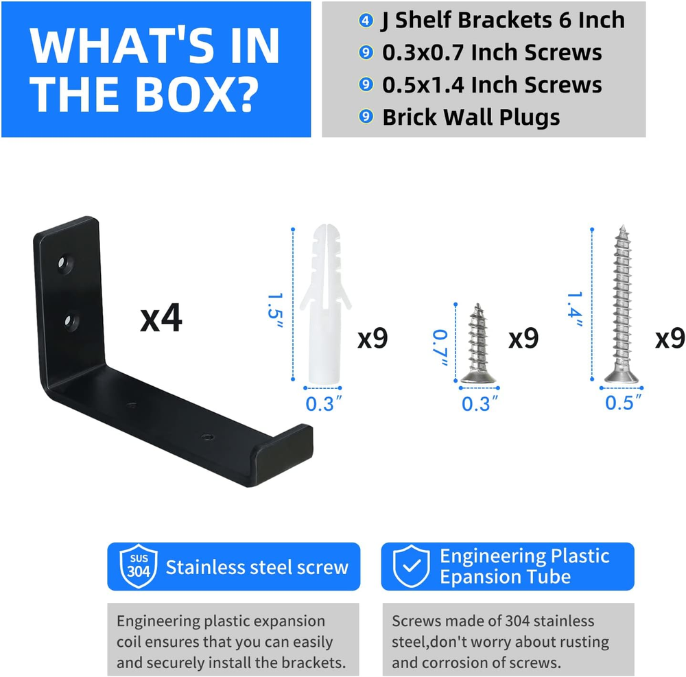 Store New Arrivals Add to Favorite View Feedback Contact Black Shelf Bracket 6 Inch, J Metal Heavy Duty Shelf Support Brackets 4 Pack,6.3"L×4.8"H×1.2"W Description Item model number J-bracket-6in Item Package Quantity 1 Style Black-4Pack Finish Powder Coated Mounting Type Wall Mount Color Black Item Depth 1.2 inches Product Dimensions 6.3 x 4.8 x 1.2 inches Material steel Country of Origin China Item dimensions L x W x H 6.3 x 4.8 x 1.2 inches Included Components Large Screw, J Shelf Brackets, Expansion Screw Item Weight 2.57 pounds Shape J Batteries Included? No Batteries Required? No Warranty Description If the product has any quality problems, free replacement service is provided. Size 6inch Finish Type Powder Coated Material: Cold-rolled steel forgings, not easy to deform and rust, with stainless steel screws, better bearing capacity. Size: The exact outside dimensions are: 6.3''Lx4.8''Hx1.2''W, suitable for a variety of 6" width shelves. Feature: Embedded screw holes are reserved on the bracket, after the installation is completed, the surface is flat without protrusions, which is more beautiful. Load Bearing: The load-bearing capacity of the bracket is also different depending on the installation of the wall. On concrete or brick walls, the maximum load is 80LBS. On the wooden wall, the maximum load is 45LBS. Design: Easy-to-install design using basic DIY tools Can place decorative items on the shelf to decorate your home Product Description Slanted Hole Design The industrial shelf brackets have been upgraded with bevelled screw holes compared to other brackets, the nuts do not protrude when installed, this gives a smoother and more secure bracket plane. Heavy Duty Design When properly installed on the wall,a pair of 1/4 inch thick heavy duty steel brackets for shelves with upgrade quality screws carry up to 80lbs.If you want to load more,you could use more brackets for floating shelf. Stainless Steel Screws The 304 stainless steel screws make the screws more durable and will not rust and break easily, even when installed outdoors. ABOUT US We offer the best prices around on high quality products. Our E-store includes media such as books, movies, music and games while offering electronics, toys, sporting apparel, clothing, tools, general home, garden items and more. SHIPPING We are always working hard to ensure your package arrives as soon as possible. Please understand that some factors like weather, high postal traffic, and the performance of shipping companies are outside of our control. We offer free shipping to the lower 48 states and ship within 2 business days of payment, usually sooner. We do not accept P.O. Boxes. Please provide a physical address. For shipping outside of the continental USA, we only use eBay's Global Shipping Program.The item is shipped to KY and then sent to the rest of the world. International customers are responsible for all duties and taxes. Continue to check out in order to calculate costs for shipping the item to your country. Messages regarding eBay's Global Shipping Program MUST be directed at eBay EXCLUSIVELY. RETURNS We offer a 30-Day Return Policy on items which you are not completely satisfied with. You have the option for a full-refund or an exchange of the item. No returns are available on items shipped outside of the USA. PAYMENT We accept PayPal. CONTACT US This page content is yet to come Please ad us to your favorite seller and visit again later Thank You CUSTOMER SATISFACTION We try our very best to make sure every customer is completely satisfied. If there's a problem, message us! We're happy to help. WE ACCEPT Copyright © 2021 AutoDS. | All Rights Reserved