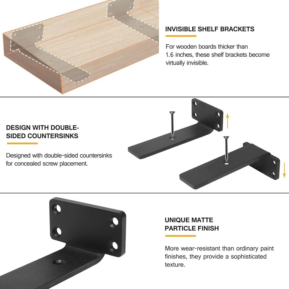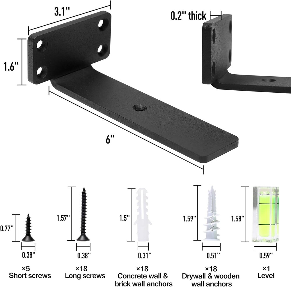 Store New Arrivals Add to Favorite View Feedback Contact Heavy Duty Floating Shelf Brackets, 6-Inch (1/5'' Thick) Hidden Shelves Hardware, Cast Iron L Brackets, Rustic Industrial Black Metal Wall Shelving Supports, 4 Pack Description Item model number ZJ-01 Part Number ZJ-01 Style 4 Pack Mounting Type Wall Mount Color Black Material Cast Iron Country of Origin China Item Weight 4.93 pounds Batteries Included? No Batteries Required? No Size 6 Inch Included Components not_applicable 【Heavy-Duty & 90° Angle】Each pair of the 1/5-inch thick brackets, crafted from high-quality steel, can support up to 150 lbs when used with the included high-strength screws. The precise bend ensures a perfect 90° angle, preventing any tilt. 【Hidden & Countersunk Design】With a height of just 1.6 inches, the bracket can be easily hidden between the wall and shelf. It's designed for both upward & downward use, while the countersunk feature guarantees smooth drilling and invisible screws. 【Matte Finish】The matte black finish on these cast iron shelf brackets mixes modern sleekness with industrial aesthetic. Serving as blind shelf supports, these mounting brackets offer a textured surface for rust resistance and lasting performance. 【DIY Storage Rack】This set includes 4 decorative L brackets for wood, perfect as holders for DIY wall-mounted open shelves. Versatile in application, they're suitable for kitchens, bathrooms, bedrooms, offices, garages, studies, and powder rooms. Step-by-Step Installation Guide 1.Mark Points: Identify where the holes will go and mark them accurately. 2.Insert Anchors: Use a screwdriver to secure the anchors in the drywall easily. 3.Attach Brackets: Use the long screws included to fasten the shelf brackets to the wall. 4.Repeat for Other Brackets: Follow the same steps to install any additional brackets. 5.Secure Planks: Finally, use the short screws to attach your shelf to the installed brackets. ABOUT US We offer the best prices around on high quality products. Our E-store includes media such as books, movies, music and games while offering electronics, toys, sporting apparel, clothing, tools, general home, garden items and more. SHIPPING We are always working hard to ensure your package arrives as soon as possible. Please understand that some factors like weather, high postal traffic, and the performance of shipping companies are outside of our control. We offer free shipping to the lower 48 states and ship within 2 business days of payment, usually sooner. We do not accept P.O. Boxes. Please provide a physical address. RETURNS We offer a 30-Day Return Policy on items which you are not completely satisfied with. You have the option for a full-refund or an exchange of the item. No returns are available on items shipped outside of the USA. PAYMENT We accept PayPal. CONTACT US This page content is yet to come Please ad us to your favorite seller and visit again later Thank You CUSTOMER SATISFACTION We try our very best to make sure every customer is completely satisfied. If there's a problem, message us! We're happy to help.