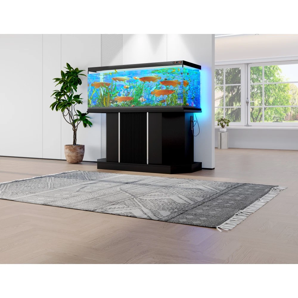 Modern 55-75 Gallon Fish Tank Stand with Power Outlet (4 AC 2 USB Ports), Heavy Duty Aquarium Stand with Cabinet Storage Upgrade your aquarium setup with this heavy-duty fish tank stand, designed to support 55-75 gallon tanks and elevate your space with both functionality and style. Perfect for fish tanks, turtle tanks, and reptile terrariums, this stand combines robust construction, convenient features, and ample storage to meet all your aquatic needs. Key Specifications Assembled Dimensions: 47.64 inches (L) × 14.17 inches (W) × 28.70 inches (H) | Assembled Weight: 57.43 lbs Packaging Dimensions: 58.19 inches (L) × 19.29 inches (W) × 6.69 inches (H) | Packaging Weight: 64.82 lbs Weight Capacity: 880 lbs | Color: Black | Material: MDF Premium Features 880LBS Heavy-Duty Support: Built to safely hold 55-75 gallon aquariums, with a sturdy MDF construction that ensures long-lasting stability. The 47.64×14.17 inch desktop provides ample space for your tank setup—please measure your tank before purchasing to ensure a perfect fit. Built-in Charging Station: Never run out of power for your aquarium equipment! Features 4 standard AC outlets and 2 USB ports, making it easy to connect heaters, filters, LED lights, and other essential devices in one convenient, organized spot. Spacious Storage Solution: Equipped with a built-in cabinet and shelf, this stand offers plenty of space to store fish food, cleaning tools, and all your aquarium supplies. Keep your setup neat, tidy, and everything within easy reach. Moisture-Resistant Finish: The sleek black laminated surface adds a modern touch to any room while protecting against moisture damage—preventing warping, swelling, or discoloration over time, so your stand stays durable and looks great for years. Hassle-Free Assembly: No complex tools or advanced skills required! Clear instructions and simple steps allow for quick and easy assembly, so you can set up your stand and enjoy your aquarium sooner. Important Notes This product includes the aquarium stand ONLY. The fish tank and any accessories shown in product images are not included. Customer Guarantee We stand behind our product with a 1-Year Quality Warranty —providing you with peace of mind against any manufacturing defects. Additionally, enjoy a 30-Day Free Return & Exchange Policy : if you’re not completely satisfied with your purchase, you can return or exchange it within 30 days, no questions asked.