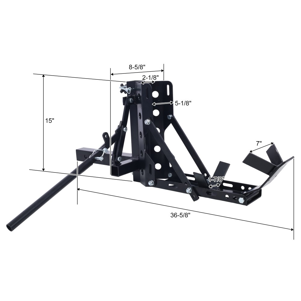 🌟 Key Features & Why You’ll Love It Broad Compatibility with 2" Hitch Receivers Designed to fit most motorcycles/scooters, attaching securely to standard 2" hitch receivers. It holds the front wheel firmly, making it versatile for various vehicle models. 800 LBS Capacity & Secure Tire Hold Supports up to 800 lbs and accommodates tires up to 4-3/8" wide—no trailer needed! Included locking straps fasten the front wheel tightly, ensuring stable, safe towing. Adjustable Crank Handle for Custom Fit The crank handle lets you raise/lower the stand height to fit different front wheel sizes. Tailor the rack to your motorcycle for a snug, secure hold every time. Durable Rust-Resistant Steel Build Crafted from heavy-duty steel with a black powder coat finish—resists rust, scratches, and wear for long-lasting reliability, even with frequent use. Complete Kit with Easy Storage Includes the hitch rack, locking straps, and all installation hardware. Assembly is simple, and the rack detaches easily to store in your trunk when not in use. 📐 Product & Package Details Assembled Dimensions : 36.60” L x 8.60” W x 15.00” H Product Weight : 30.80 lbs (sturdy, heavy-duty build) Package Dimensions : 16.90” L x 14.60” W x 7.90” H Package Weight : 33.00 lbs (securely packed for transit) Color : Black (sleek, durable finish) Material : Steel (industrial-grade, long-lasting construction) ✨ Hassle-Free Shopping Guarantees 1-Year Warranty : We stand behind our product! Enjoy a 1-year warranty against manufacturing defects—we’ll repair or replace if anything goes wrong. 30-Day Free Return & Exchange : Not satisfied? Return or exchange within 30 days for free (just keep the product in original condition—no questions asked). 🎁 Perfect for Motorcycle Owners, Riders, & Outdoor Enthusiasts This hitch rack is a must-have for anyone needing to haul their motorcycle/scooter—ideal for road trips, moving, or as a practical gift for fellow riders. Order now and transform your beauty space-with our warranty and free return policy, you have nothing to lose!
