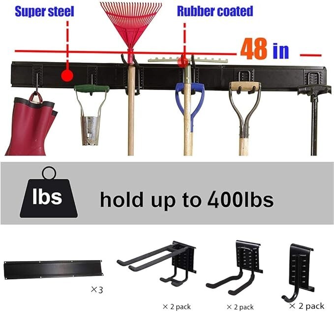 WIDE APPLICATIONS—Suitable for organizing garage tools or garden tools and all kinds of tools. Such as rakes, shovels, push brooms, bikes, bags, towels, robes, rain boots and other hand tools, etc. SUPER MATERIAL FOR DURABILITY—Garage storage rack is powder-coated steel for durability-resists of rusting, chipping and cracking. Rubber-coated sleeves are scratch-resistant. Steel construction epoxy finish. Heavy Duty. Holds up to 400 lbs. MULTIFUNCTIONAL & HANDY—This 9PC garage system storage includes 3pc - 16"Steel rail, 2pc - small J hook, 2pc - short multi-purpose hook, 2pc -ski hook. Different styles of hooks meet your diverse needs. EASY TO INSTALL—The garage wall organizer is easy to attach and move around on the rail. Heavy Duty Mounting Hardware (12*Screw, 12*Expansion tube). NOTE— We have a professional Service Team that is ready to solve any problem for you. Hardware with the kit only for wood stud and drywall!for concrete or brick wall,please use the approriate hardware.