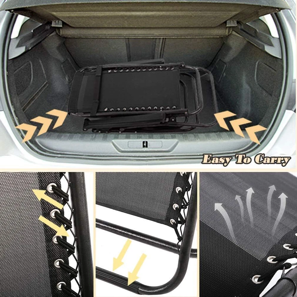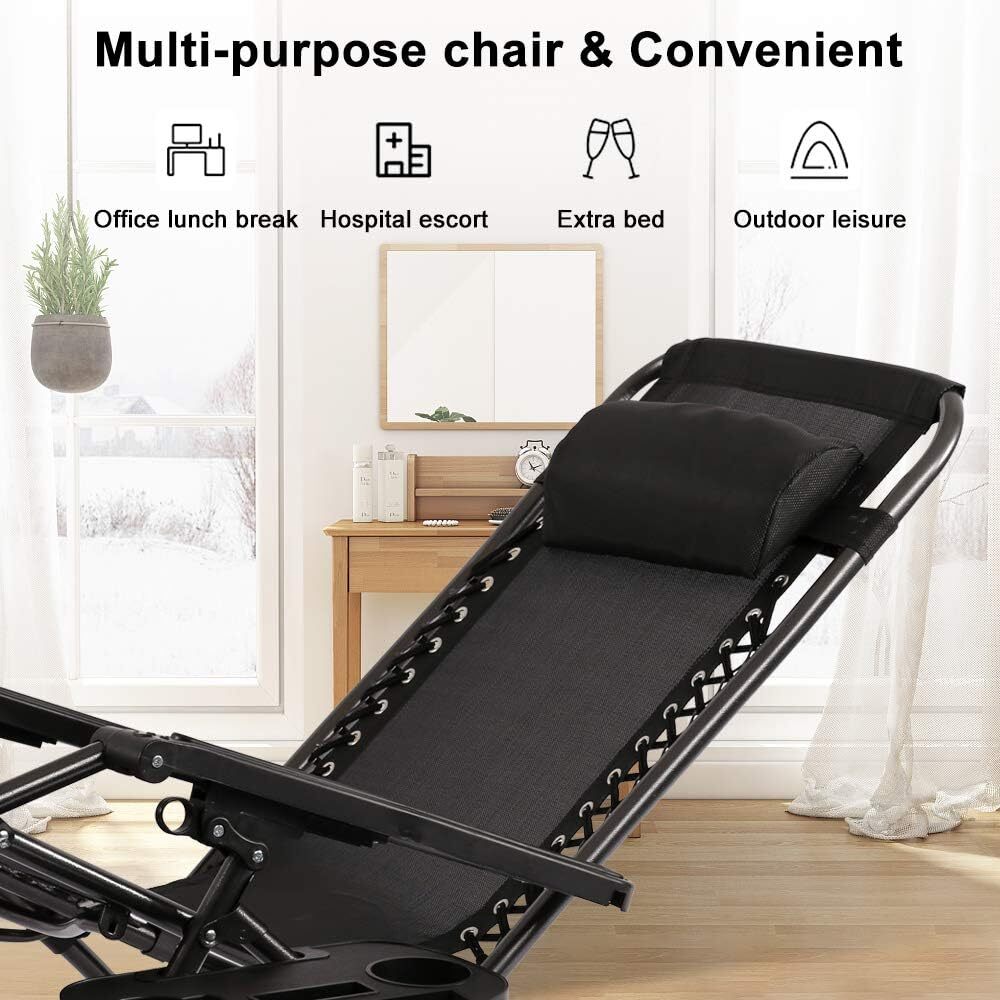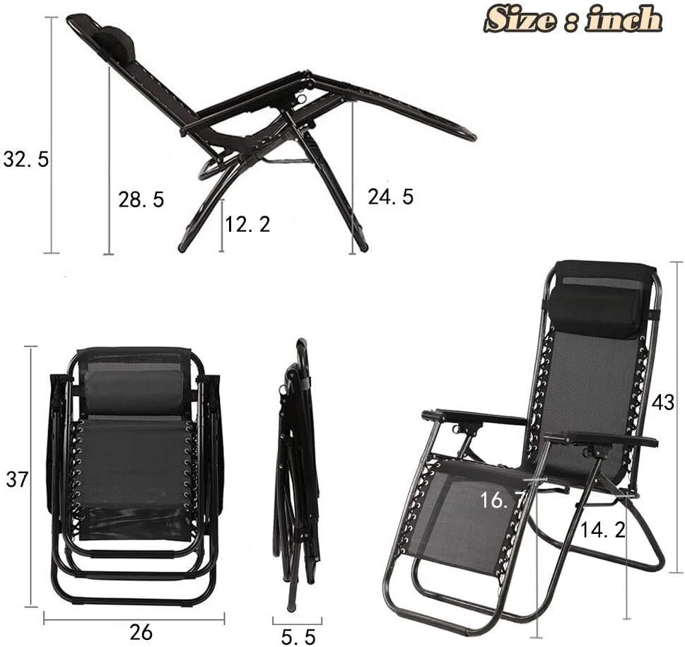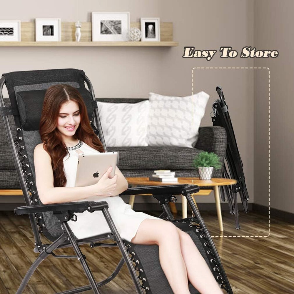 Product Description Patio Lounge Chair Chaise Recliner Outdoor Folding Adjustable Heavy Duty Zero Gravity Chair with Cup Holder and Pillows for Patio, Pool, Beach, Lawn, Deck, Yard - Black ☀【Comfortable and with Cup holder 】very comfortable reclined position of the Zero Gravity chairs and the headrest of the Zero Gravity recliner is easy to adjust. Each patio chair come with Cup holder trays to place drinks, magazines, phones/tablets, or other small items for convenient accessibility. ☀【No Assemble Required】The zero gravity chairs come fully assembled and folded of the zero gravity recliner. just need to open the package and take out the lounge chairs to use it.Then you can use them and will have a nice nap. ☀【Durable and High-Quality】This Zero Gravity Recliner is very sturdy enough to hold people up to 250lbs. Strong double bungee rope and steel tube frame are durable for using a long time. The lounge chairs made of high quality UV-resistant texteline mesh can prevent fading. The recliner chair offer a comfortable and cool experience in a hot summer day. ☀【Easy to Fold up and Stored】This folding gravity patio chair is designed for easy storage, save space when not in use. And you can put the lounge chairs into the trunk of the car, it is the best ideal for camping and travel. ☀【Adjustable & Lockable Recliner System】The zero gravity chair can be adjusted at any angle from 0 to 180 degrees. Smoothly glides to an ergonomic zero-gravity position. The lounge chaise help you release all the pressure and let your body fully relax without any pressure on your spine. About Us We are a reputable seller with many years of experience selling on eBay. Our goal is to provide high-quality products and excellent customer service. Shipping Items will be shipped within 1-3 business days when we received payment. (Orders are not processed on weekends & holidays) Tracking information will be sent once item is shipped. Delivery time depends on destination and other factors Item is shipped to ebay address. Leaving correct address can minimize delay. For international shipping and shipping to Guam, Hawaii and Alaska, Please contact us before placing the order. International buyers please note: Import duties, taxes and charges are not included in the item price or shipping charges. These charges are buyer’s responsibility. We will try our best to reduce the risk of the custom duties. Local pick-up is unavailable at the moment. Contact Us We reply any email messages within 1 business / working days(off-duty at weekend). If you do not get a response from us, then please check your junk or spam mailbox. Our Business hours: Mon-Fri 9:00-18:00, UTC/GMT +8 hours. Please contact us either by clicking "contact seller" in the "purchase history" section or simply click "ask a question" at the bottom of this page. If you are unsatisfied with our item or service, please contact us before leaving any feedback. We are committed to resolve all issues in a friendly and satisfactory manner.