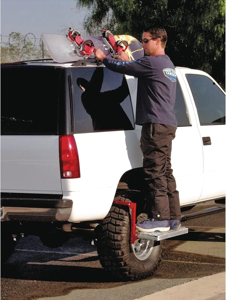 EASY TO USE: Slip this Heavy-Duty Truck Step over your vehicle tire, then reach your roof rack, engine bay, truck box, lumber rack, luggage, and bike without overreaching VERSATILE: The universal and height-adjustable design means it will fit car tires, truck tires, RV tires, even semi-truck tires (we tested it, it fits perfectly!) with a cross width of 13 inches or less at the tread SAFETY: The open design lets mud, slush, and debris pass through and the metal cheese grater surface with anti-slip tape strips offer incredible grip in the best and worst conditions EASY STORAGE: The folding design makes it easy to stow behind a seat, in a truck box, or RV storage bin SIZE AND CAPACITY: Platform is 8-3/4 inches x 21-3/4 inches with a 300-pound weight capacity Great for washing and waxing, loading roof racks, engine service and more Fits any diameter tire up to 12" deep Folds flat for compact storage 300 pound capacity Product Description The dependable step adjusts to four positions and features a strong no-slip surface. Rubber bumpers protect your tire from damage. When you are done, the truck service step folds flat for easy storage. From the Manufacturer Powerbuilt? Truck & RV Service Step