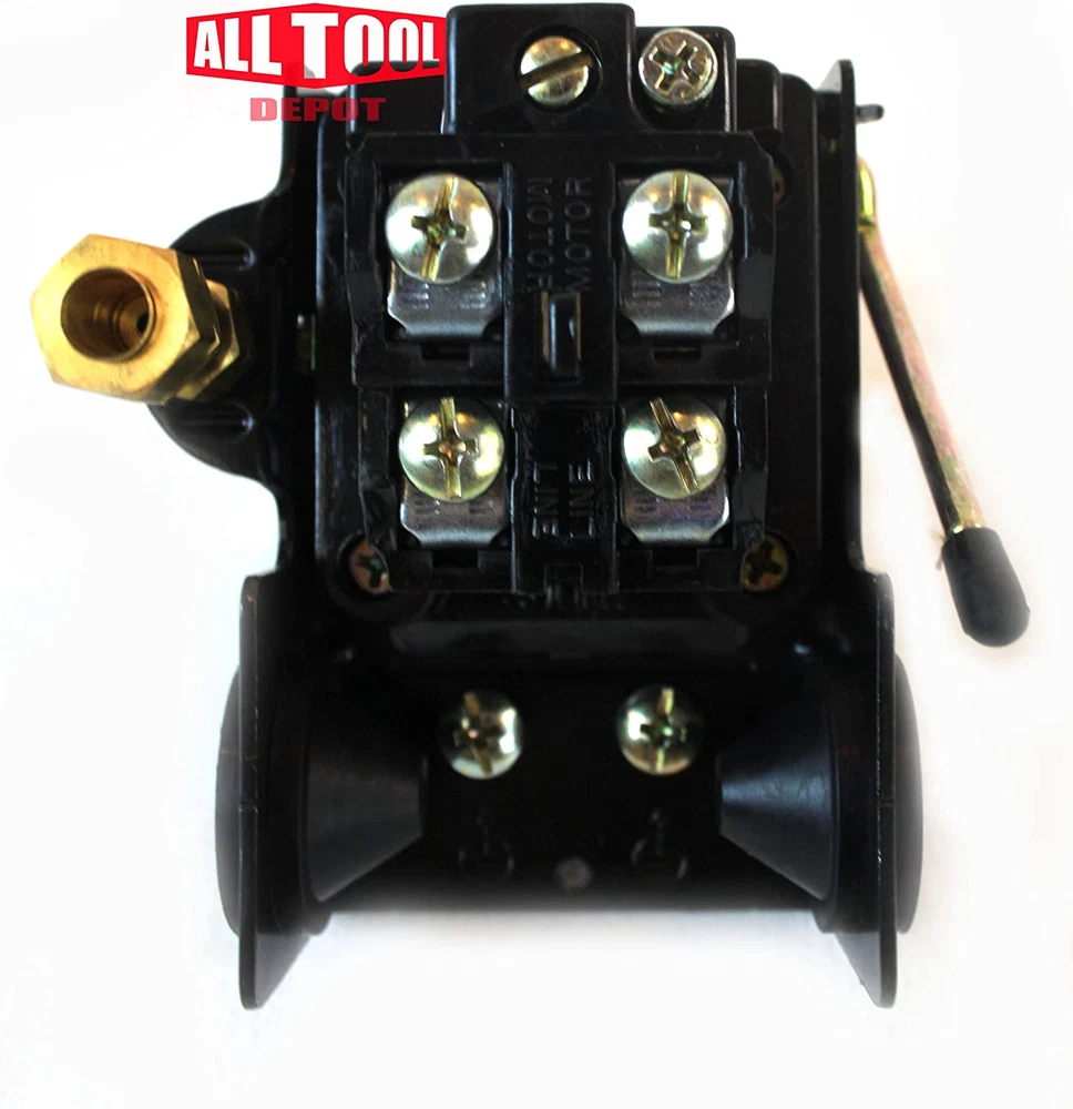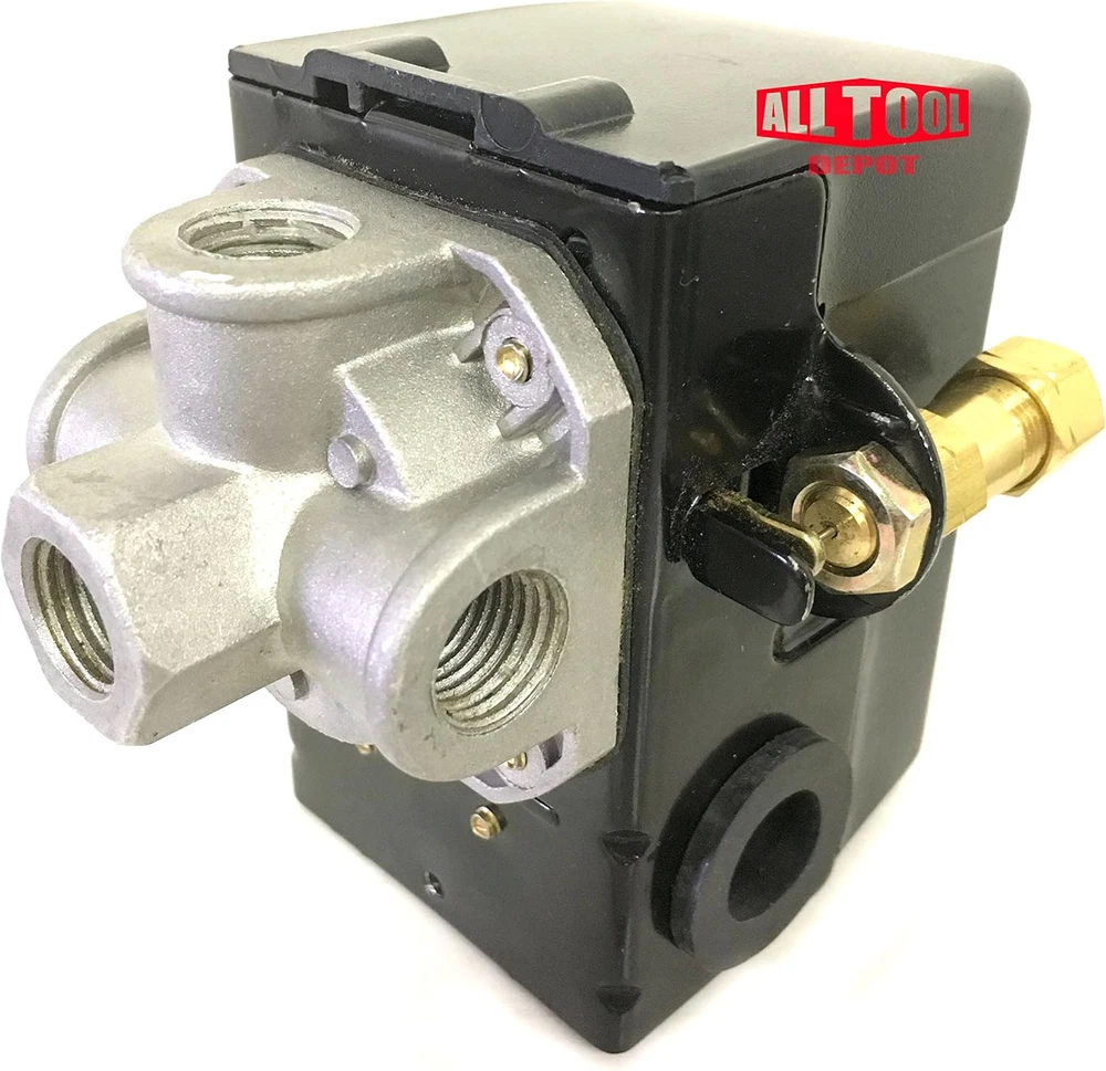 Heavy Duty SUNNY 95-125 PSI air compressor pressure switch, 4 Ports. MAX PRESSURE: 200 PSI MIN CLOSE: 60 PSI, 25AMP DIFFERENTIAL: 28-40 PSI 1/4" COMPRESSION UNLOADER VALVE CONNECTION, 1/4" FEMALE NPT TANK CONNECTION. 1PH: 115v,230v; 3PH: 230V,575V; DC: 32V,115V,230V This Sunny SU-L4 air-compressor pressure switch controls an electrically driven air compressor in a power circuit when the adjustable threshold upon falling is reached and is set to turn off at 125 psi. The switch have four 1/4" NPSF internal fluid connection. The adjustable cut-out range is 60-200 psi. The switch is diaphragm actuated and has a fixed differential. The threshold, or setting point, upon rising adjusts with a screw nut. The switch has screw terminal electrical connections. The maintained manual cut-out lever has auto and off positions.
