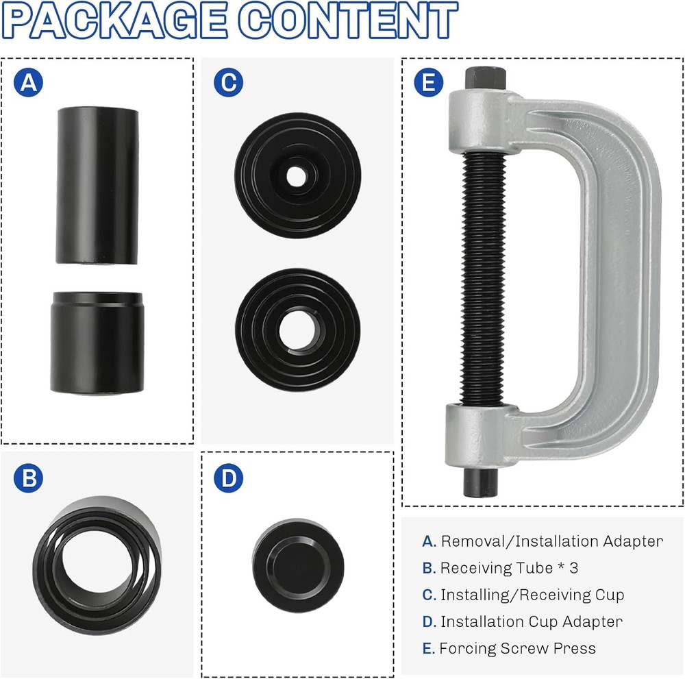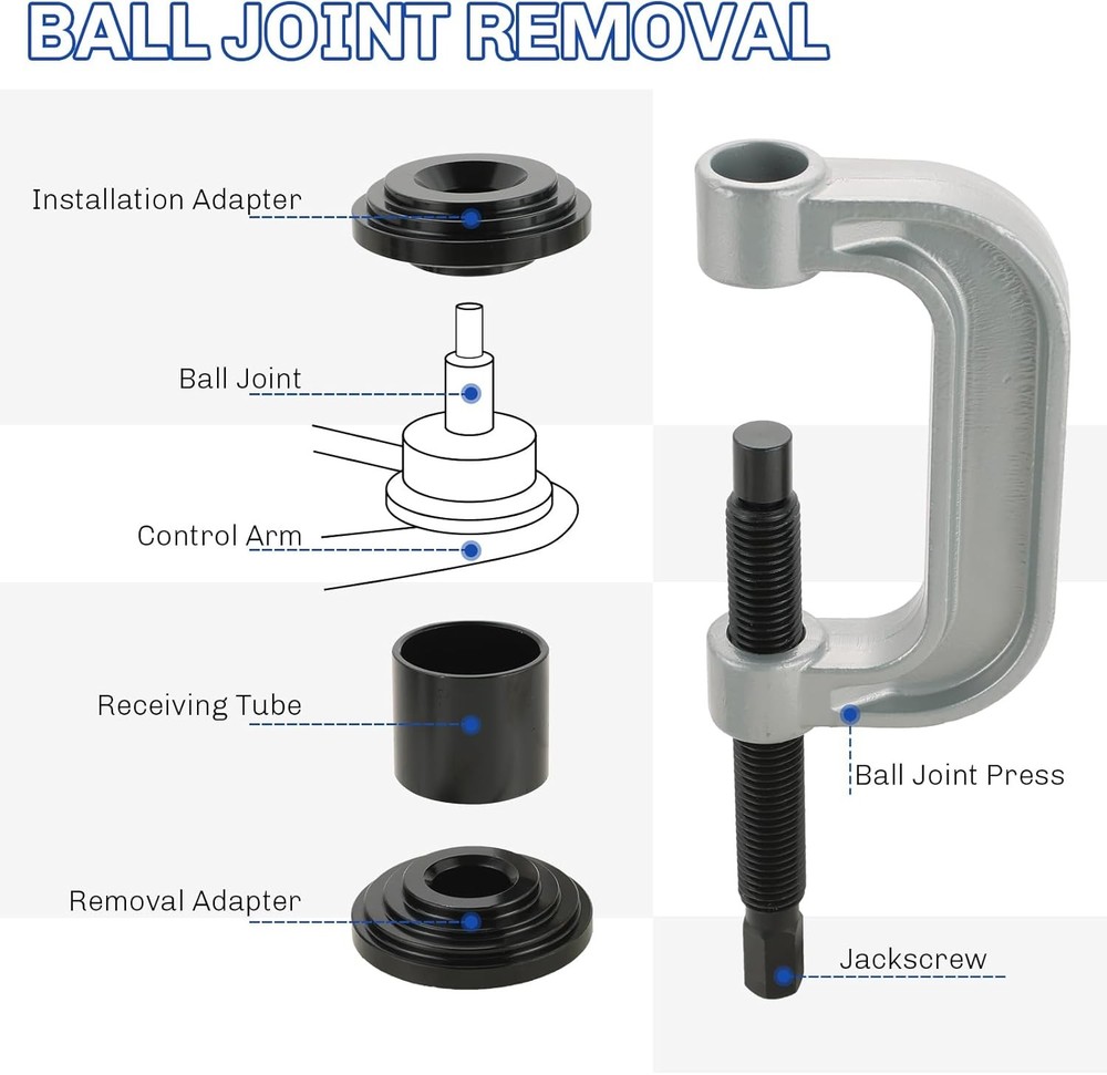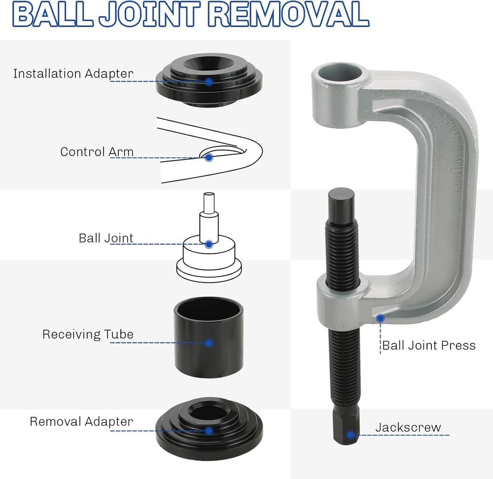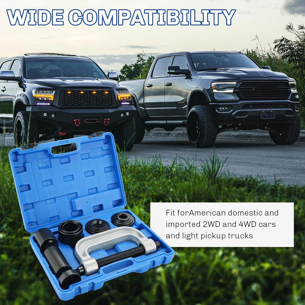 Free eBay listing template designed by dewiso.com Heavy Duty Ball Joint Press and U Joint Removal Tool Kit | Ball Joint Separator Tool for U Joint and Brake Anchor Pin Tools, for 2WD and 4WD Cars and Light Trucks FREE AND FAST SHIPPING! 【Essential Tool for Ball Joint Service】 weyleity's ball joint press kit is an indispensable tool for your garage, designed to effortlessly remove press-fit components like ball joints, U-joints, and brake anchor pins without the need to disassemble your vehicle's control arm. 【Professional Grade Quality】 Trust in weyleity's commitment to quality and durability. Crafted from heavy-duty forged steel with a corrosion-resistant black-oxide finish on adapters, this ball joint press kit is built to last, resisting rust and corrosion, making it the choice of off-road enthusiasts, novices, and professional mechanics alike. 【Universal Compatibility】 This versatile ball joint removal tool kit is universally compatible with a wide range of American domestic and imported 2-wheel drive (2WD) and 4-wheel drive (4WD) cars and light pickup trucks. It even includes a 4WD adapter for servicing 1/2 and 3/4 ton 4WD vehicles equipped with Dana 30 or 44 front axles, found in popular brands like Ford, GM, Dodge, IHC, and Jeep, dating back to 1967. 【Package Content】 The ball joint press kit includes 3x Receiving Tubes, 1x Removal Adapter, 1x Installation Adapter, 1x Screw, 1x Install Cup Adapter, 1x Forcing-screw Press, 1x Receiving Cup, and 1x Installing Cup. 【Storage Case】 This ball joint separator tool set is housed in a durable storage case featuring meticulously-sized compartments for each component. This not only simplifies storage and transportation but also extends the longevity of the tool set. Product We offer a 30-Day Return Policy on items which you are not completely satisfied with. You have the option for a full-refund or an exchange of the item. No returns are available on items shipped outside of the US . Shipping We offer Free Shipping to the US and ship within 2 business days of payment, usually sooner. We use UPS express shipping. That's why your products are usually delivered within 3 days . Contact We try our very best to make sure every customer is completely satisfied. If there's a problem , message us! We're happy to help. 24/7 live chat available.