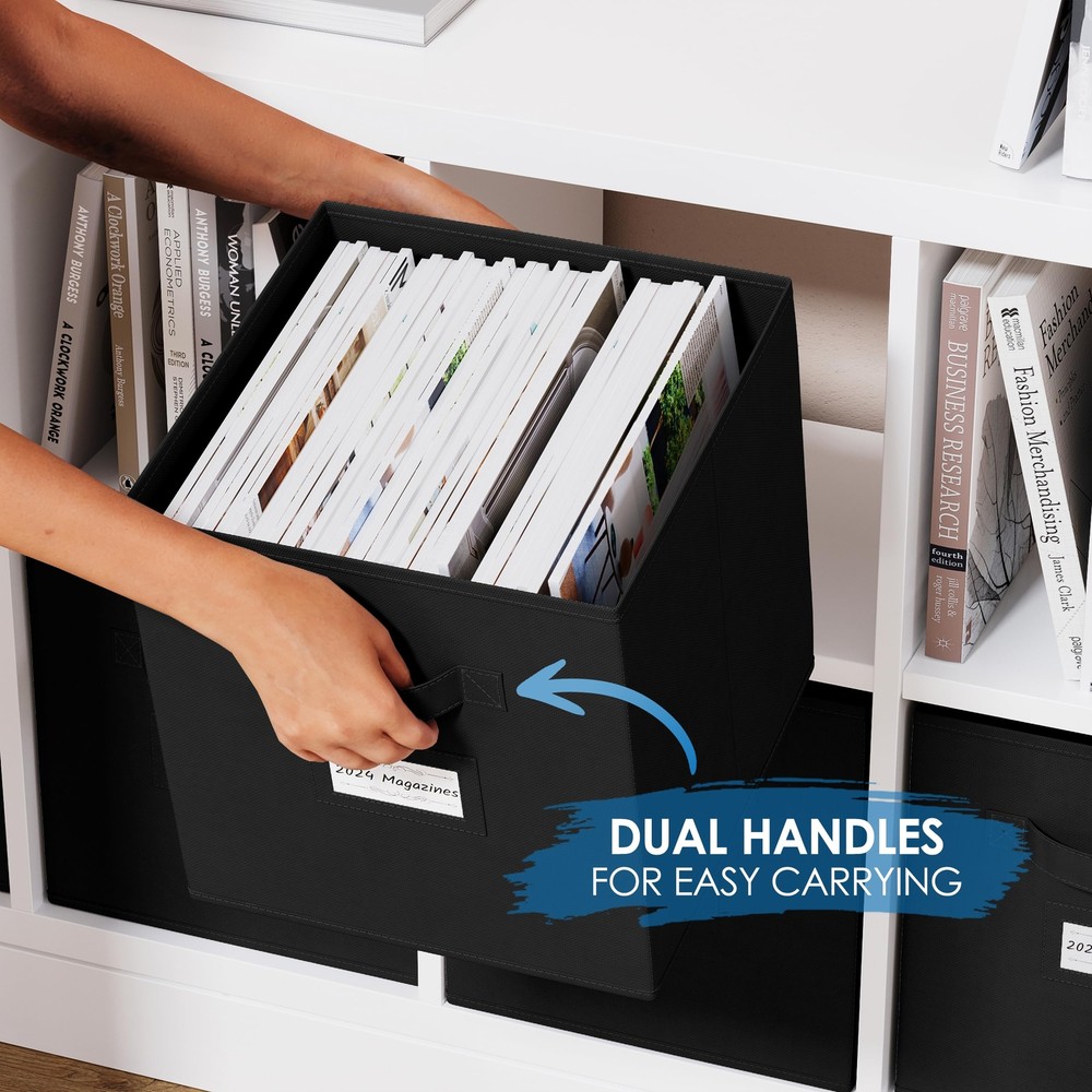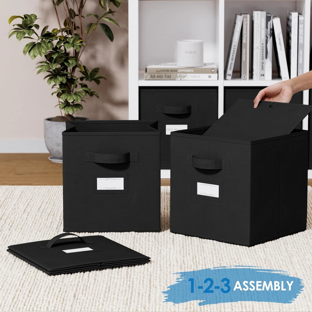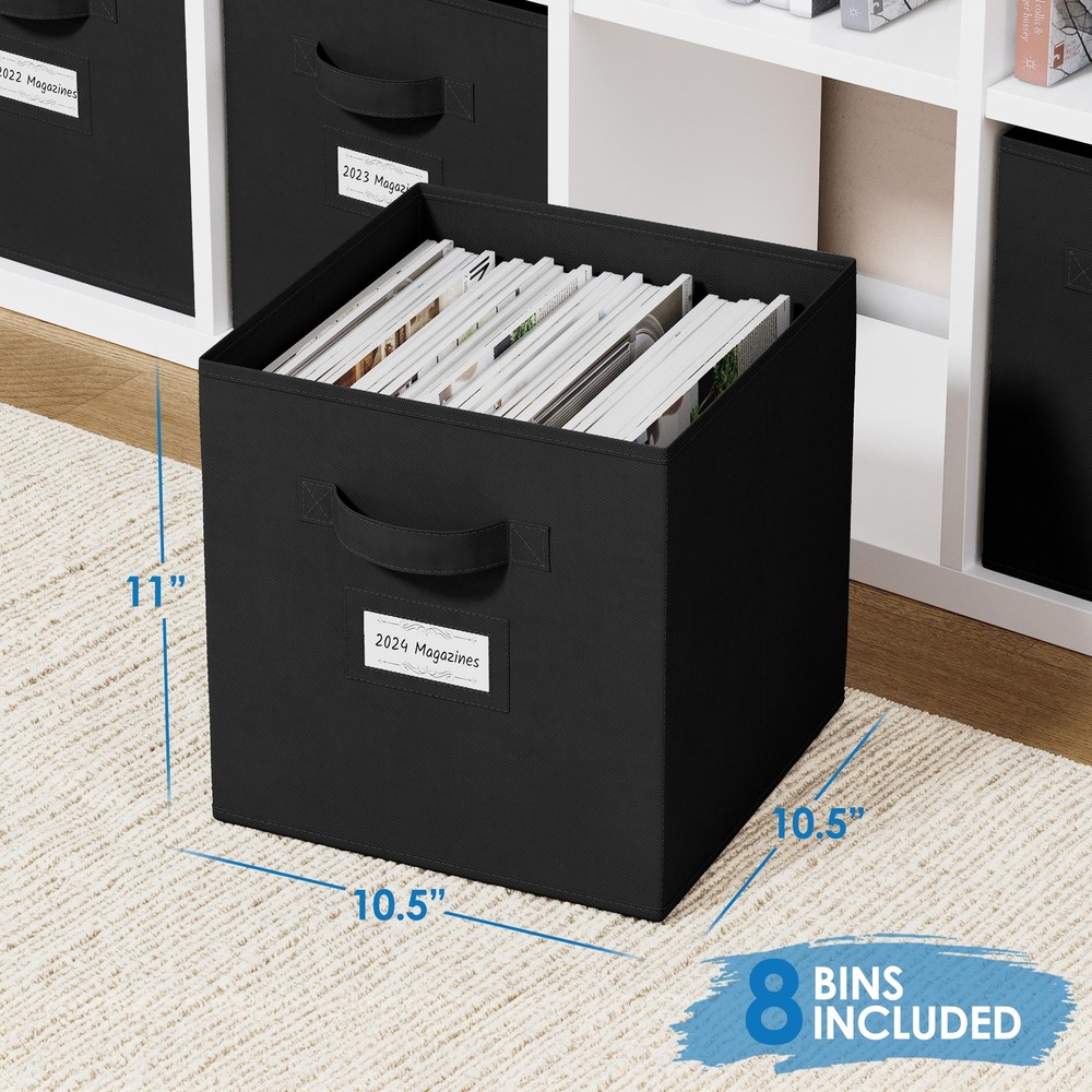 Fabric Storage Cubes for Cube Storage Organizer - 8 Pack Heavy Duty Storage Bins With Labels - 11 Inch Cube Storage Bin (Black) SUPERIOR STURDY DESIGN: The cube storage organizer bins will exceed your expectations for quality, durability, and style. Reinforced handles on both sides enable quick and easy carrying. DIMENSIONS: 10.5(W) x 10.5(D) x 11(H) inches (26.5 x 26.5 x 28 cm). MULTI-PURPOSE ORGANIZERS: Achieve organizational bliss with these chic, functional fabric cube drawers! Designed to perfectly fit most cubby storage organizer. Use in your linen closet, wardrobe, nursery, playroom, laundry room, office and much more. LABEL CARDS: is here to help you categorize your belongings more efficiently! Included are 10 Bonus Label Cards that'll neatly fit into the transparent slots on the drawer baskets. Mark the contents in each container for your ultimate closet set-up. COLLAPSIBLE DESIGN: These versatile storage baskets are super easy to fold and store when not in use. When you need 'em, they'll pop up in a flash, ready to store a variety of belongings such as underwear, socks, toys, crafts, cleaning supplies and what not. ENVIRONMENTALLY FRIENDLY: Just like you, we care deeply about our environment and it's protection. Our collapsible storage bins are made with eco-friendly materials that is sturdy yet breathable - easy on your hands, your belongings and the environment. SHIPPING Domestic Buyers - We have confidence in our products, but if you are not fully satisfied please contact us within 30 days of purchase and you will get full refund. - We ship within 3 business days of payment, usually sooner - We offer FREE shipping on all orders! - We only ship to the lower 48 states, no APO/FPO addresses or PO Boxes allowed International buyers – please note: Import duties, taxes, and charges aren't included in the item price or postage cost. These charges are the buyer's responsibility. - Please check with your country's customs office to determine what these additional costs will be prior to bidding or buying. * Order Cancellation Policy ** You can return a product for up to 30 days from the date you purchased it. 1. The seller reserves the right to cancel the special case only due to eBay cancellation fee. 2. The decision of seller is the final. 3. The seller will respond to the cancellation request within 2 business days. Please wait for the result of cancellation. 4. In case the cancellation is not completed by some reasons, the buyer can follow the options below to get the refund. 4.1 The buyer can reject the item when it arrives. 4.2 The buyer can send the item back to the seller within 30 days If the buyer receives item (USA Shipment ONLY). The seller will provide the FREE return label to the buyer when the buyer opens " Return Item" case on eBay by using the reason as "Change my mind" ONLY. 5. When buyer has placed the order. The order will be processed and completed by automatic warehouse system within 5 minutes. In case that buyer sends the cancellation request after 5 minutes of placing the order, the request will be rejected. **Sending direct message to cancel the order is not allowed for every case.* Return Policy For the return case - If buyer would like to return the items for refund or replacement, please CONTACT SELLER to receive the free return label from seller. The refund or replacement will be processed with the tracking number of return label which is provided by seller only. The other ways of return which are not approved by seller will not be processed for the refund or replacement.