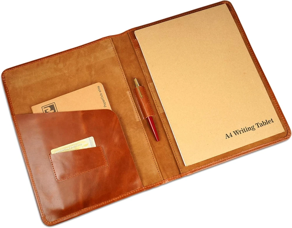 Heavy Duty Buffalo Leather Legal Pad Portfolio | Handmade Executive Notebook Binder Portfolio | Professional Padfolio Organizer | Business Gift for Men and Women : Brown PROFESSIONAL PADFOLIO - CestAntiQ leather portfolio to fit your style whether you are a professional or an entrepreneur with its sleek design STYLISH FUNCTIONAL GIFT - Entrepreneurs who wants to organize their business or fresh graduates looking for their first job or even professionals who travel a lot. UNPARALLELED PRACTICALITY – Designed with internal slots for credit and business cards, a convenient loop for your favorite pen, and a dedicated section to hold a standard letter-size legal notepad (not included). This slender padfolio is perfectly suited for any kind of meeting. PERFECT STORAGE - Leather folder with the size of 13” x 10”, give you a plenty of storage. A sleeve holder perfect for the legal pad writing pads and A4 notepads & paper sheet, 1 pen slot, 1 wave-shaped business card holder and 1 side pockets for documents. This wonderful leather notepad construct without annoying zipper will organize your paper stuff very well. And what is more, it will add your confidence and great first impression definitely. 100% GENUINE LEATHER - Leather portfolio/ padfoilo is made of heavy duty finest leather, also be called "CestAntiQ Leather ", which will be more glossy after about half year of using. Vintage inspired design combined with the distressed leather folio gives a rich classy look Product description Handmade Executive Notebook Binder Elevate Your Professional Style The CestAntiQ Heavy Duty Buffalo Leather Legal Pad Portfolio combines sophistication and functionality, crafted with genuine leather for a timeless look that ages beautifully. Stay organized and confident with this versatile padfolio. Heavy Duty Buffalo Leather Padfolio Organizer Embrace sophistication and functionality with the CestAntiQ Heavy Duty Buffalo Leather Legal Pad Portfolio. Crafted with genuine leather, this handmade executive notebook binder offers unparalleled practicality and a timeless design. Elegant Office Accessory for Professionals The CestAntiQ Heavy Duty Buffalo Leather Legal Pad Portfolio is designed for professionals, entrepreneurs, and graduates alike, offering a sleek yet functional style. Crafted with genuine leather, this handmade executive notebook binder exudes sophistication and ages beautifully, acquiring a unique patina over time.This professional padfolio features unparalleled practicality, including a letter-size lined writing pad, internal slots for credit and business card, and a loop for your favorite pen. Its perfect storage capabilities—13” x 10” x 0.5" in size—offer ample room for all your essentials: a sleeve for legal pads and A4 notepads, pen slots, a wave-shaped business card holder, and a side pocket for documents. The lack of a zipper ensures quick access while adding to its classy design. Whether you're attending a business meeting or seeking a stylish functional gift for a loved one, this portfolio makes a lasting impression. Perfect for daily use, it keeps you organized and confident. Embrace elegance with the CestAntiQ Leather Padfolio, a must-have for work, business, and stationery needs. Handmade Executive Notebook Binder Elevate Your Professional Style with CestAntiQ Made from 100% buffalo leather, the CestAntiQ Professional Padfolio combines elegance with practicality. Its thoughtfully designed compartments, including a legal pad holder and card slots, ensure you’re always prepared to make a lasting impression in any business setting. Leather Portfolio Stylish Legal Pad Portfolio for Professionals Embrace sophistication and functionality with the CestAntiQ Heavy Duty Buffalo Leather Legal Pad Portfolio. Crafted with genuine leather, this handmade executive notebook binder offers unparalleled practicality and a timeless design that ages beautifully. Timeless Craftsmanship, Modern Utility Leather folder with the size of 13” x 10”, give you a plenty of storage A4 Document Holder in Premium Buffalo Leather Material: Made from 100% genuine, heavy-duty leather, often referred to as "CestAntiQ Leather," which gains a glossy patina over time, enhancing its vintage-inspired look. Dimensions: Size of the padfolio is 13 inches x 10 inches, designed to accommodate letter-size and A4 notepads and paper sheets Storage Features: 1 sleeve holder for legal writing pads or A4-sized notepads. 1 wave-shaped business card holder. 1 pen loop for secure placement of writing instruments. 1 side pocket for organizing loose documents or papers. Design: Slim and zipper-free design for easy access and a minimalist yet professional appearance. Functionality: Includes an elegant lined writing pad for note-taking during meetings, interviews, or travel. Weight: Lightweight yet robust construction to ensure durability while maintaining portability. Craftsmanship: Expertly handmade using traditional Indian leatherworking techniques to promote artistry and craftsmanship. 10.0 inches x 12.99 inches x 0.04 inches. Weight: 1.1 lb Item model number leather Padfolio Sheet Size 8.5-x-11.75 Inches Capacity 1 Grams Number of Items 1 Color Cognac Brown Material Leather Material Type Leather Manufacturer Part Number FD-22 Item Weight 1.1 pounds Product Dimensions 12.99 x 10 x 0.04 inches Size 13 x 10 inches