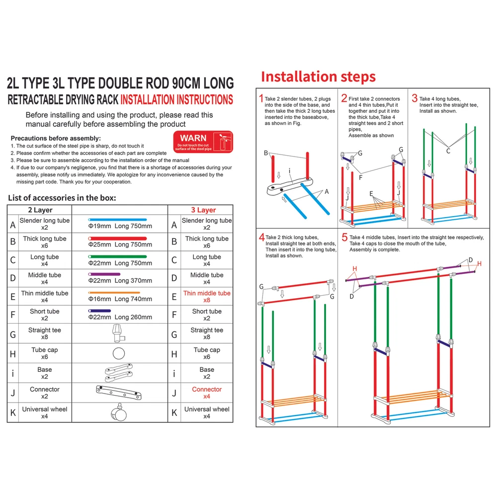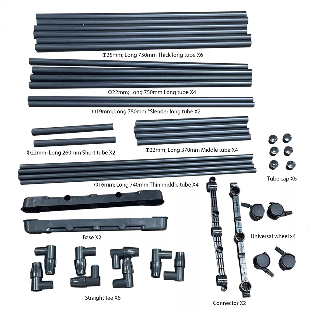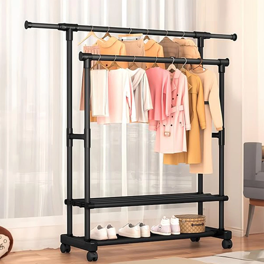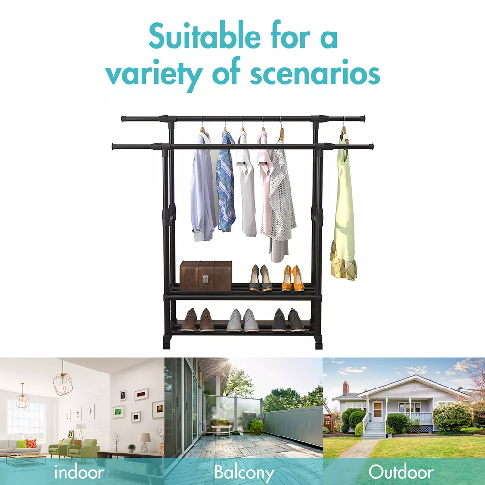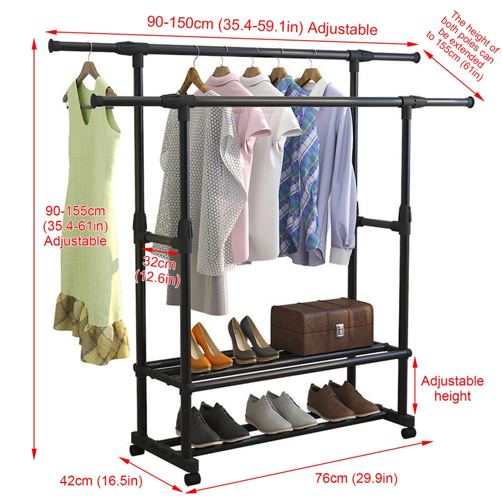 Heavy Duty Clothing Garment Rack Rolling Clothes Organizer Double Rails Hanging Please consider clearly before placing an order, the load-bearing capacity of this product is limited, only suitable for some light clothes, like summer clothes, winter clothes are not recommended to put more This Clothes Rack is made of high-quality material, stable and durable, waterproof and rust-proof. The multi-layer design can help to save space. Equipped with movable pulleys, it is convenient to move the rack, which can be placed indoors and outdoors. This item is also easy to use and simple to install. Tips: *Please read the instruction carefully or refer to the installation method in the video before assembling. *lf the goods are damaged or missing parts, please contact us in time to replace the new products, thank you. *Contact us please for whatever we can help. Specification: Type: 2-layer Garment Hanging Rack Color: Black Material: Steel-plastic composites pipe + ABS joints Size: As Picture Shows Size: *Slender long tube X2: Φ19mm; Long 750mm *Thick long tube X6: Φ25mm; Long 750mm *Long tube X4: Φ22mm; Long 750mm *Middle tube X4: Φ22mm; Long 370mm *Thin middle tube X4: Φ16mm; Long 740mm *Short tube X2: Φ22mm; Long 260mm *Straight tee X8 *Tube cap X6 *Base X2 *Connector X2 *Universal wheel x4 Installation steps: 1. Take 2 slender tubes, 2 plugs into the side of the base, and then take the thick 2 long tubes inserted into the baseabove. 2. First take 2 connectors and 4 thin tubes, put it together and put it into the thick tube, take 4 straight tees and 2 short pipes. 3. Take 4 long tubes, insert into the straight tee. 4. Take 2 thick long tubes, install straight tee at both ends. Then insert it into the long tube. 5. Take 4 middle tubes, insert into the straight tee respectively, take 4 caps to close the mouth of the tube. Assembly is completed. Feature: 【Extra Storage】 Double pole design, there are 2 poles for hanging, and you can adjustable the length and height according to your needs. The bottom shelf provides extra space for putting boxes, shoes, boots, pants, etc. And putting stuff in this area will help stabilize the coat rack. 【Movable Wheels】 The clothes hanger is equipped with 4 wheels making it easy for you to move this garment rack from your bedroom to your coatroom. 2 of the wheels are equipped with brake pads to lock it in place as you need. 【Easy to Assemble and Clean】 Simple installation. The coat rack can be quickly assembled with the parts provided according to the detailed instruction. Simply wipe with a cloth to clean the surface of the rack. 【Wide Range of Uses】 The clothes hanger can not only hang clothes, scarves and dresses, but also place shoes and storage boxes at the bottom. It is suitable for any place in your home without occupying too much space, whether bedroom, balcony, hallway, laundry room, entryway or closet. 【Great Service】 lf you have any questions about the product, please feel free to contact us by email, communication is often easier to solve the problem! -Equipped with removable pulleys, making it easy to move the rack. You can put it anywhere you want. -Made of high-quality material, sturdy composite pipe, which is waterproof, not easy to rust and durable. -With strong bearing capacity, it is eco-friendly, stable and has no odor. -Telescopic design, adjustable length and height, not limited by space, applicable to a variety of scenarios. Package Content: -1*Coat Rack Note: 1. lf you have any idea of return or exchange, please feel free to contact us by email, communication is often easier to solve the problem than return and negative comments! 2. The picture may be a little different from that of real item due to the different display and different light. 3. Due to different producing batches, product details might be a little different. If you mind the difference, please buy with caution. Thank you for your understanding. 4. Please allow minor differs due to manual measurement. Note: This item starts garment rack with 2 layer shoe racks after 2024.6.10,Thank you for your understanding and wish you a satisfying shopping experience.
