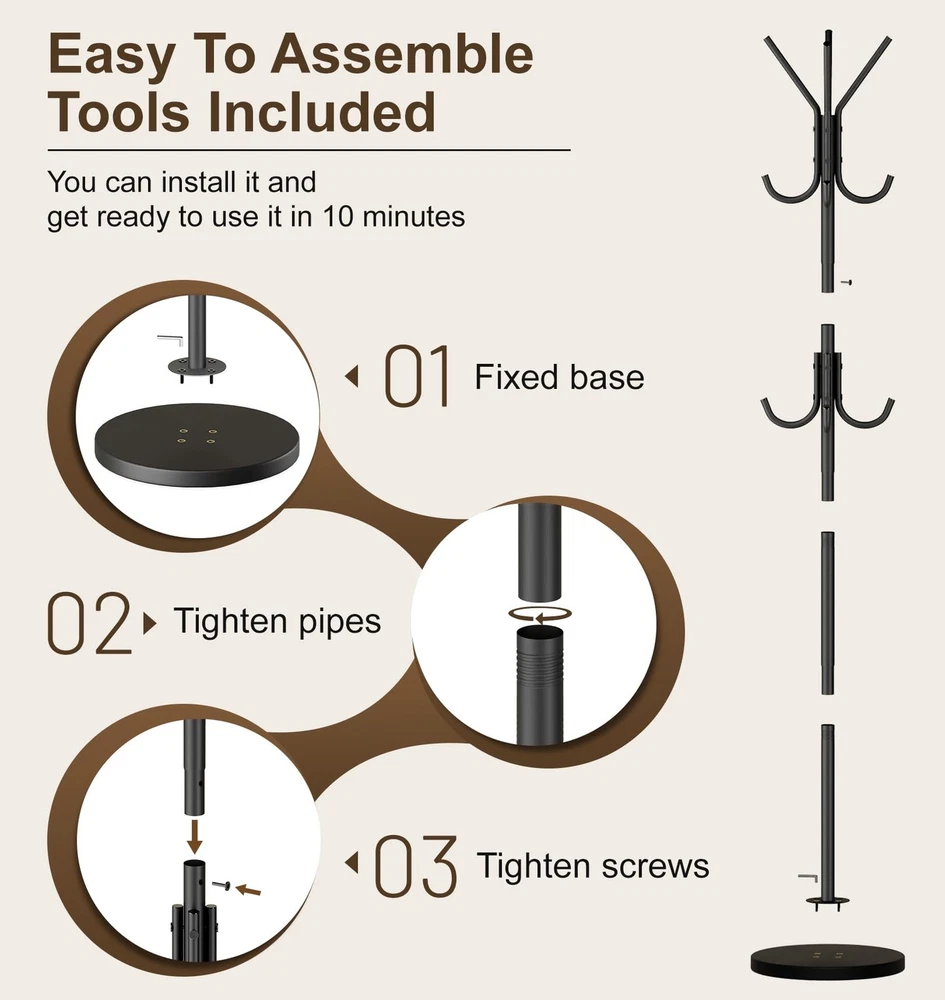 Imagine walking into a home where everything has its place – where coats, hats, and bags are neatly organized on a stunning corner coat rack freestanding modern that complements your decor. That’s the transformation customers describe: "The coat stand made my room look so much tidier and actually stylish!" 1. The luxurious black finish turns practical storage into a decor statement. "This brass coat racks free standing looks so much more expensive than it cost" customers note, appreciating how it enhances spaces from bedrooms to entryways without looking utilitarian. 2. The weighted wood base with a marble-patterned surface keeps everything secure, even when holding multiple winter coats – no more worrying about knocked-over purse holders or scattered belongings. Join thousands of satisfied customers who love how this small coat rack "holds so much without tipping" 3. Crafted with a sturdye metal frame, this rack features 12 hooks thoughtfully arranged at 3 heights, making it easy for both adults and children to hang coats, hats, scarves, backpacks, handbag, and purses without a fuss. As one parent shared: "The lower hooks are suitable for my kids to reach themselves – finally no more jackets on the floor!" 4. Start low for the toddler years, raise it for grade school, and set it to full height for teens and adults – "it actually grows with our family," unlike ordinary hall tree. Adjust between different heights in seconds, making it the only hat rack stand that adapts to your family's changing needs without requiring new furniture. Size: 69"H x 12"D x 12"W 5. This jacket holder stand takes only about 10 minutes to assemble – you’re moments away from a cleaner, more beautiful home. Great for apartments, offices, narrow dorm rooms, or even bathrooms to keep your space organized and stylish. Join thousands who’ve found their organization solution: "I wish I’d bought this office purse rack stand sooner – it handles all our family’s coats without crowding our small space." 【Modern & Space-Saving Design】Elevate your home decor with this stylish black coat rack stand. Its sleek design fits perfectly in entryways, bedroom corners, or hall—say goodbye to cluttered chairs or messy floors 【Sturdy & Stable Construction】Built with a solid wood base with a marbled looking surface and a reinforced metal frame, this coat hanger stand holds multiple heavy winter coats without wobbling or tipping over. It stays firmly in place even when fully loaded. This isn’t just storage—it’s peace of mind 【Ample Storage with 12 Hooks】The 3-tier hook design offers plenty of space for coats, hats, bags, and more. It’s perfec for both kids and adults, with lower hooks for little ones and higher ones for longer coats. Finally, everyone has their own spot 【Adjustable Height】The free standing coat rack tree lets you adjust the height to suit your family’s needs, making it easy for everyone to hang and grab their belongings – "so practical for changing seasons and growing kids", to keep your space organized and stylish. Size: 69"H x 12"D x 12"W 【Hassle-Free Setup】This coat tree freestanding heavy duty can be assembled in 10 minutes – simply twist and lock for instant organization. Place it near the door, in a bedroom corner, or even in your bathroom. This coatrack helps declutter your space while adding a touch of elegance
