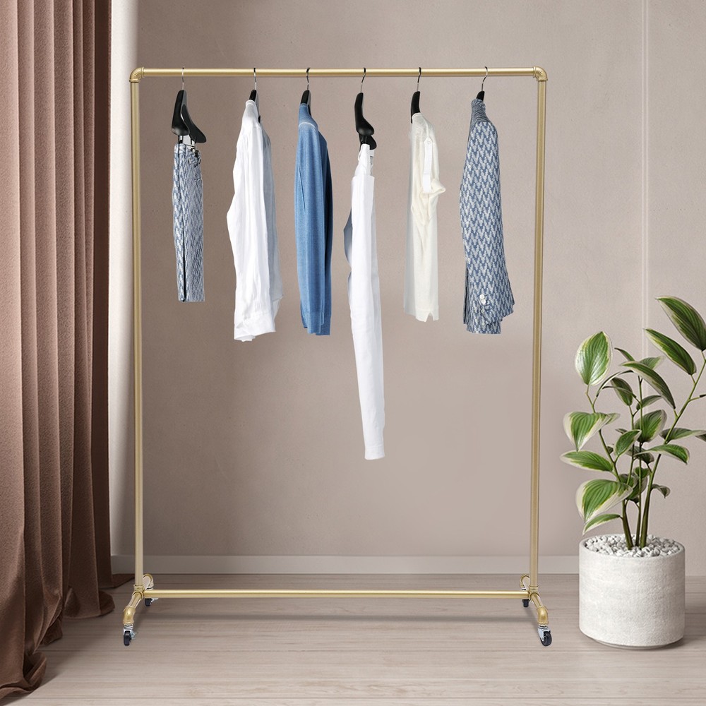 How to Install Unpack and check all accessories. When unpacking, please be careful not to scratch the shelf with sharp tools such as scissors. Put the crossbar on the ground and rotate the vertical bar and crossbar 90 degrees to splice. Rotate and splice the two side feet onto the vertical bar. Connect the vertical bar and the lower crossbar with long screws, and lock it with a wrench(not included). Specification Color: Gold Material: Galvanized Steel Surface Treatment: Baking Varnish Style: Rustic Shape: Rectangular Number of Items: 1 Number of Wheels: 4 Assembly Required: Yes Mount Type: Floor Standing Bearing Capacity: 30-50kg/66.14-110.23lbs Product Size: 120*40*160cm/47.2*15.7*63inch Pipe Diameter: 2.5cm/1inch Wheel Diameter: 3.81cm/1.5inch Gross Weight: 6kg/13.23l Heavy Duty Commercial Garment Rack Metal Rolling Clothing Shelf Retail Store Description Messy clothes affect the beauty and are inconvenient to find. Don't worry. Here comes a helper. Made of high-quality galvanized steel and adopting an exquisite baking varnish technology, this clothing rack lays the foundation for your long-term use. Wide space and 66.14-110.23lbs bearing capacity ensure you can use it safely. With it, your fashionable clothes can be stored orderly and attract customers better. How to Install Unpack and check all accessories. When unpacking, please be careful not to scratch the shelf with sharp tools such as scissors. Put the crossbar on the ground and rotate the vertical bar and crossbar 90 degrees to splice. Rotate and splice the two side feet onto the vertical bar. Connect the vertical bar and the lower crossbar with long screws, and lock it with a wrench(not included). Specification Color: Gold Material: Galvanized Steel Surface Treatment: Baking Varnish Style: Rustic Shape: Rectangular Number of Items: 1 Number of Wheels: 4 Assembly Required: Yes Mount Type: Floor Standing Bearing Capacity: 30-50kg/66.14-110.23lbs Product Size: 120*40*160cm/47.2*15.7*63inch Pipe Diameter: 2.5cm/1inch Wheel Diameter: 3.81cm/1.5inch Gross Weight: 6kg/13.23lbs Net Weight: 5.34kg/11.77lbs Package Size: 150*12*11cm/59.06*4.72*4.33inch Package Included 1* Clothing Rack 4* Wheels All Accessories for Installation Key Features Premium Material: High-quality galvanized steel pipe with a diameter of 1inch makes this product strong and durable, so it can keep beautiful and practical without frequent replacement. Exquisite Technology: The baking varnish process makes the item firmer, brighter, smoother, and more wear-resistant, so its service life can be effectively extended. Strong Bearing Capacity: The stable structure, tight industrial pipe-type interface, and solid material make this product can bear about 66.14-110.23lbs of weight, so you can use it without worrying about collapse. Wide Space: The large size (47.2*15.7in)provides enough space for you to store various clothes, thus creating a clean and tidy environment for you. It is high enough(63in) for your long-style suits. Convenient and Safe: Four universal wheels with brakes allow you to easily move and fix the product anywhere and protect your safety. Beautiful Appearance: The luxurious gold, smooth lines, and rustic industrial style make the whole product modern and fashionable. Wherever it is placed, it will be a beautiful landscape. Simple Installation: The simple structure and detailed video ensure that you can complete the installation and start using it in a short time. Effortless Cleaning: The smooth surface allows you to easily remove dust and residues with a towel and water. Ideal Gift: With good performance, this product can be used as a holiday or housewarming gift for family, friends, and lovers so that they can enjoy a more convenient life. Details Round Corners: Compared with traditional square corners, an arc design can better care for your skin and clothes. Solid Base: The two 15.7inch wide bases increase the stress area, which can better maintain the stability of the product. And it is elevated to avoid moisture and facilitate cleaning. Application This product is very suitable for hanging shirts, coats, suits, pants, or other heavy clothes in cloakrooms, bedrooms, clothing stores, laundry rooms, studios, offices, dance rooms, shopping malls, and other places where additional clothing storage space is required. Notes Please note that four wheels (1.5inch) can be locked. When you need to roll and move, make sure the wheels are unlocked. Please allow the slight color difference caused by the shooting light and 1-3cm error due to manual measurement, and make sure you do not mind before ordering. Payment Delivery details Terms of sales About us Contact us Payment We accept ebay payment 。 Fees such as import duties, taxes are not included in the item price or shipping costs. These charges are the buyer's responsibility. Delivery details Shipping: 2-9 working days to: USA Terms of sales We maintain high standards of excellence and strive for hundred percent customer satisfaction. Feedback is very important to us. We hope that you contact us immediately before you give neutral or negative feedback, so that we can address your concerns. It is impossible to address issues if we do not know about them! About us Your satis faction is our ultimate goal. We work hard to earn your trust and future business. Our certified technicians have tested each item before shipping. The unit comes with 1 year limited warranty on all manufacturing defects. a) If you receive a defective item, you may return it or ask for a discount. Please contact us within 14 days after you receive the package. b) What you returned must be intact and in its original packaging as re? u. Customer is responsible for shipping costs of the returned item. c) We will cover the cost of shipping back t with the shipping rate indicated in the registration page. We will send you a new unit or refund the full payment you paid. Thank you. Contact us Business Hour Business Hour: Monday To Friday: 8:30 A