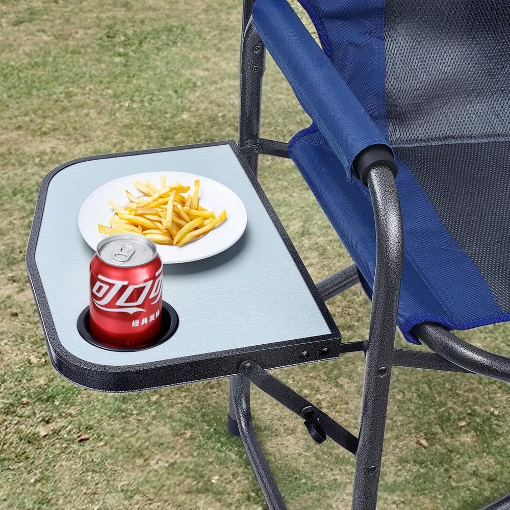 This directors chair is a game-changer for camping and outdoor relaxation! The heavy-duty steel frame and durable 600D Oxford fabric easily support up to 450 lbs while remaining surprisingly lightweight. I love the thoughtful features - comfy armrests, dual cup holders, side pocket for storage, and even a small side table. It folds flat for easy transport but feels rock-solid when set up. The ergonomic design keeps me comfortable for hours, whether I'm at a campsite, backyard BBQ, or kids' sporting event. The dark blue/grey color looks sleek and hides dirt well. Perfect balance of sturdiness and portability!