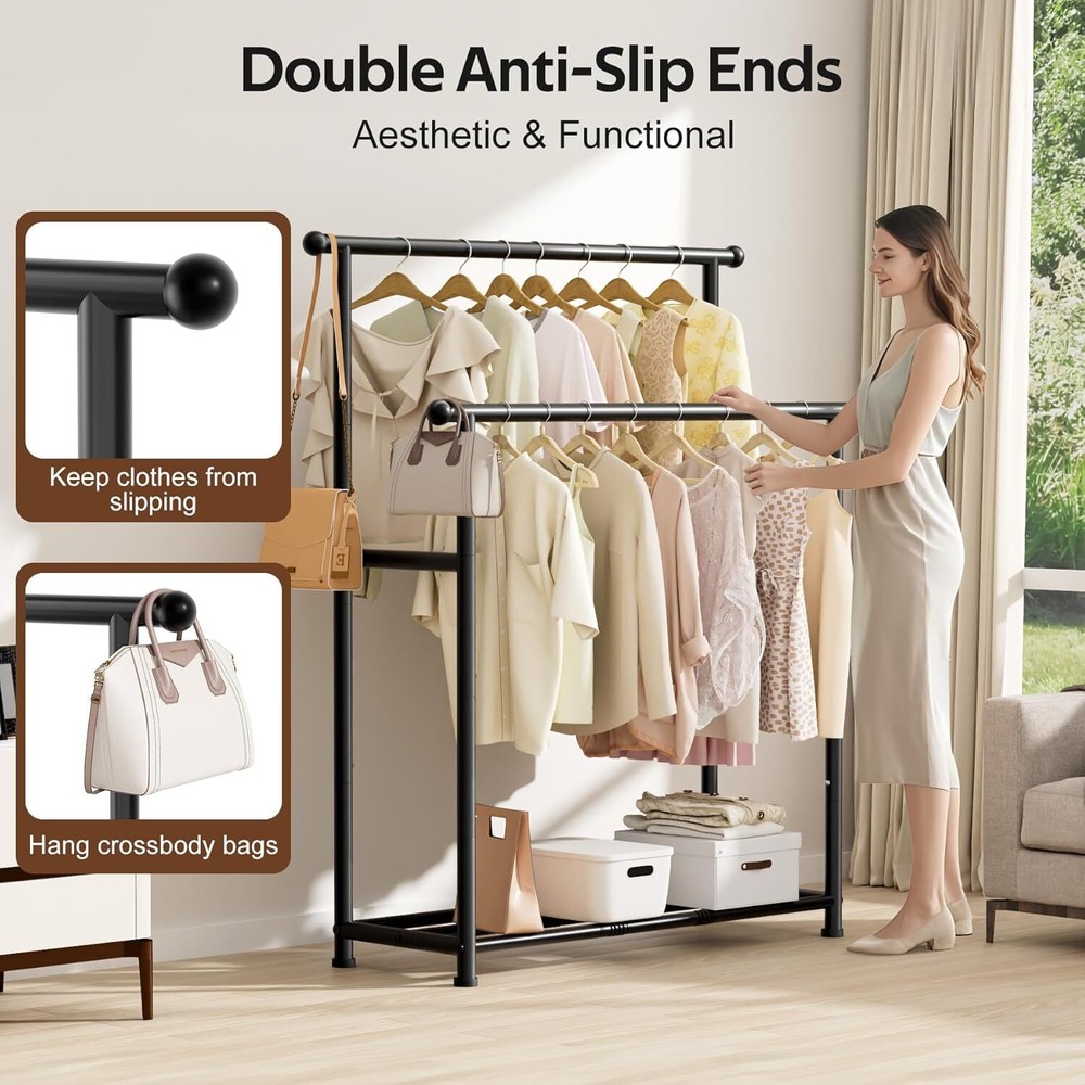 MISSLO Double Rods Garment Rack Heavy Duty Clothing Rack for Hanging Clothes Portable Clothes Organizer for Bedroom, Living Room, Clothing Store (Matte Black) Brand MISSLO Color Matte Black Material Metal Recommended Uses For Product Coats Product Dimensions 16.7"D x 44.2"W x 61.8"H About this item Patent pending Wider Design: 44.2" wide, which is 5" wider than the average clothes racks for hanging clothes. It provides more space for dresses, T-shirts, bags, and shoes while keeping them organized Heavy Duty: Made of thickened, high-quality metal. The closet racks for hanging clothes can hold up to 350 lbs. Easily accommodating heavy winter coats and boots without tipping or warping Stylish Ball: The balls on both sides prevent clothes from falling out while providing extra space for bags.If you're looking for a garment rack for hanging clothes that's both elegant and functional, this is the one for you Bottom Extra Space: The bottom can be used as a shoe rack to hold shoes, or boxes. If you need a closet that doesn't take up a lot of space, or if you have temporary needs for storing clothes, you'll need the heavy duty clothes rack Wider High-low Bars: 16.7" distance, ensuring that the front and back clothes won't be squeezed together. The high-low bar design helps you store and organize clothes of different lengths. The clothing racks for hanging clothes are easy to install as well
