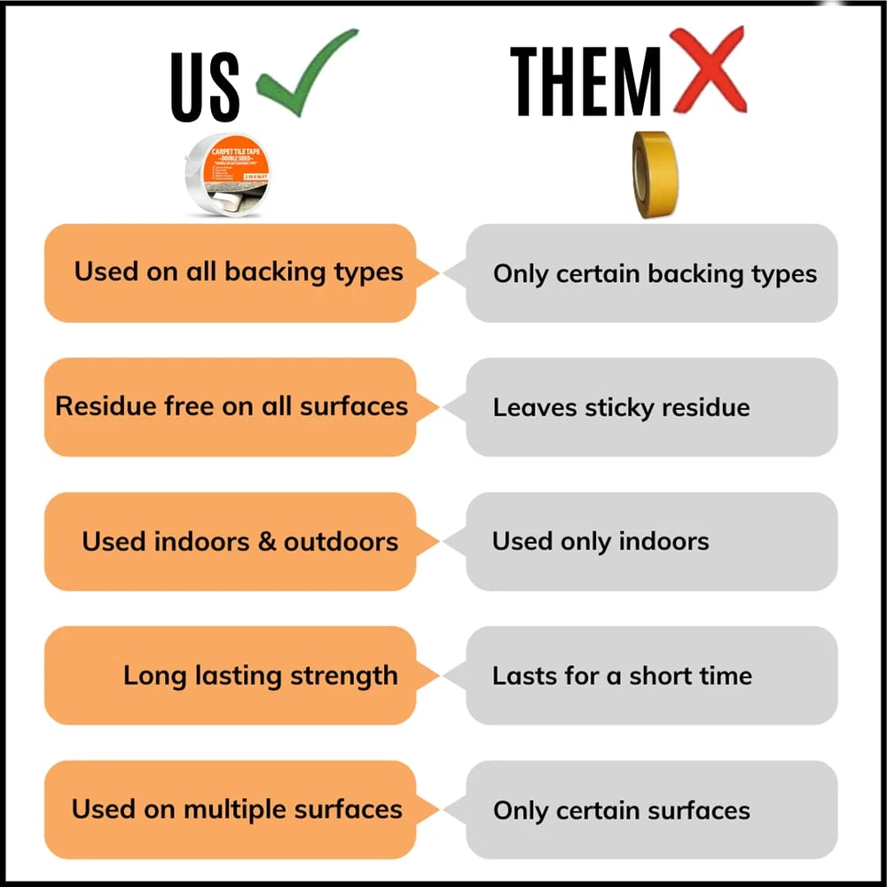Carpet Tape Double Sided Heavy Duty Carpet Tile Tape 2inx90ft Rug Gripper Indoor Outdoor Grip Tapes for Area Rugs on Hardwood Vinyl Concrete Wood Turf Floor Adhesive Two Sided Stick ✅ HIGH-PERFORMANCE! Our double sided tape heavy dutywill ensure your carpet tiles, area rugs, vinyl floor, laminate flooring, turf, indoor outdoor carpeting, rubber or carpet squares will have a long lasting hold. One 2 in x 90 ft roll covers approximately 220 square feet. ✅ RESIDUE-FREE! Use this heavy duty double sided tape on-top of hardwood flooring, vinyl, concrete, carpet, laminate, marble and rubber without damaging or leaving residue when removed. Rug tape hardwood floor no damage underlayment for laminate flooring ✅ EASY INSTALL DIY! Simply roll out two sided tape and press carpet rug tape onto floor peel top layer off. No glue, no nails, no mess floor tape. Rug stickers for wood floor are Non-toxic, VOC and odor free no slip rug grip ✅ EXTREME STRENGTH! Our double sided carpet tape has fibber web mesh for perfect bonding. This double sided rug tape is durable and weather proof for indoor outdoor carpet double sided tape carpet protector double side tape ✅ PROTECT YOUR FAMILY! No injuries from rugs sliding or corners curling thanks to the effectiveness of two sided tape heavy duty rug corners to hold rug down 2 sided tape carpet tape double sided 2 sided tape heavy duty carpet glue Product Description MULTIPLE USES Install Carpet Tiles With Ease You can feel confident that this tape will make your carpet tile installation process go smoothly and hold your flooring secure for years to come. Keep Your Rugs In Place • No Curling Tired of moving your rugs back in place over and over? Keep your rugs secure by placing tape on the corners of each rug. No more rugs moving from the children or pets playing. Securely Install Stair Treads Long lasting, mess free double sided tape works great for installing carpet, vinyl or rubber stair treads. Residue Free & Easy To Remove Our smart adhesive technology allows the tape to be easily removed without leaving a residue on your floor. PROTECT YOUR FAMILY FROM INJURY CREATE A SAFE HOME ENVIRONMENT According to the National Electronic Injury Surveillance System, over 40,000 people are injured by unsecured and curled rugs every year. Protect your family now with this double sided carpet tape now. INDOOR AND OUTDOOR USE The perfect solution for securing both indoor and outdoor rugs and door mats It doesn't matter if you're using this tape to install rugs or doormats inside our outside. This tape is moisture resistant and will hold your flooring in place even in the most severe temperatures. Item model number CTT2x90 Number of Items 1 Color White Product Dimensions 6 x 2 x 6 inches; 1.26 Pounds Material Heavy Duty Double Sided Carpet Tape Country of Origin China Recommended Uses For Product Outdoor, Indoor Size 2 IN x 90 FT 2.0 inches x 6.0 inches x 6.0 inches. Weight: 1.26 lb Shipping from the USA All of our products are shipped from the USA, ensuring quick delivery to your destination. Payment We offer the following payment methods: PayPal, credit card, bank transfer, and eBay's secure payment system. Free Shipping & Free Returns Shipping within the USA is FREE. Additionally, any return is absolutely free for you. Risk-Free Purchase You have the option to return an item within 30 days without any justification. We cover the return shipping costs! Fast Shipping We ship immediately upon receipt of payment. Generally, the package is delivered within 2-3 days in the USA. If it takes longer, we will contact you. Quality and Costs Made in Europe, USA, China No customs fees or additional charges Total satisfaction guarantee Invoice with declared VAT available upon request in .pdf format Feedback Your feedback is very important to us. After you pay for your purchase, you will automatically receive positive feedback from us.