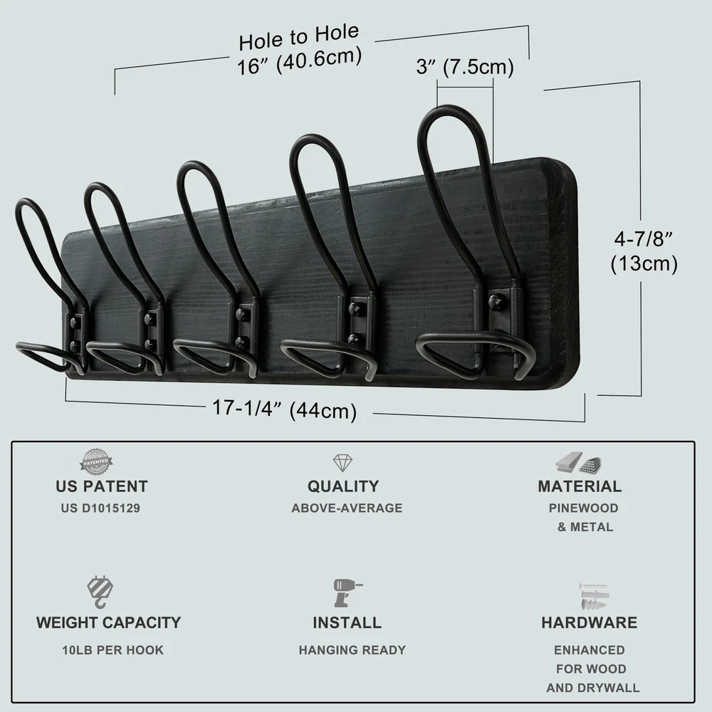 RusticWire Series Wall Mounted Coat Rack with 5 Coat Hooks Material: Solid pine wood backing & metal hooks Dimension: Mounting hole to hole: 16 Inches L*W*T=xxxxxxxxxx Inches; Package Includes: 1* 5-hook Wall Mounted Coat Hook Mounting Hardwares for both drywall and stud or concrete Application Scope: coat hanger wall mount is perfect for hanging your clothes, clothing, jackets, coats, hats, baseball caps, key, scarf, backpack and others. The well-organizing coat and hat rack is a must to your entryway,mudroom, closet, bedroom, kitchen, hallway and more. 【HEAVY DUTY:】Exclusive-molded, patented metal wire hooks and a sturdy pinewood back ensure our wall coat rack's unmatched durability. 【RUSTIC CHARM:】The coat wall hanger, with wire hooks and unique finish, adds a charming country style. 【NO ASSEMBLY NEED:】Easy to install, 16” spacing stud-mountable and improved hardware for increased loading. 【Handpicked Wood Grain:】Each wood hook rack rail is crafted from individually selected wood for optimal beauty. Size: 17-1/4 x 4-7/8 x 3 inches; Material: pinewood & metal; Package: 1x wall mount coat rack with 5 wire hooks; Color: black.