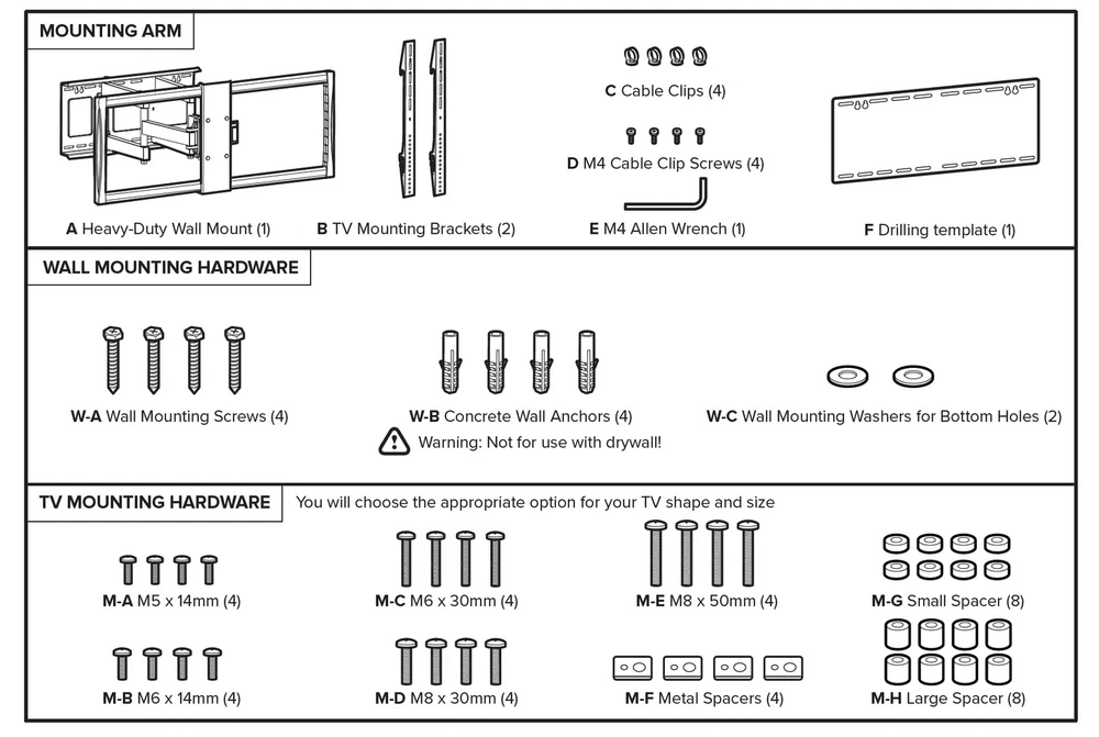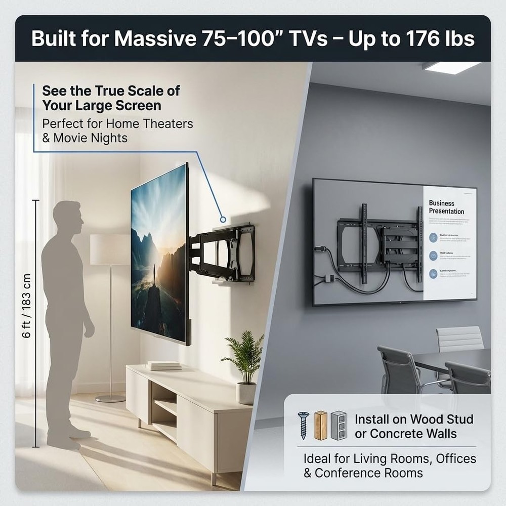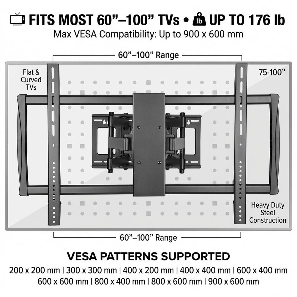 Full motion wall mount: Seamless full motion adjustments allows you to get the ideal viewing angle for you TV - tilts 15 degrees, swivels 45 degrees, extends up to 24.5 inches, and retracts to 2.75 inchesFITS MOST TVS: Supports flat and curved 60” – 100” TVs up to 176 pounds compatible with a variety of VESA mounting hole patterns (check out the photos for the full list of VESA compatibility) INSTALL ON WOOD STUDDED OR CONCRETE WALLS: Includes hardware for installation on either a wood studded wall or a solid concrete wall or concrete block wallCABLE MANAGEMENT SYSTEM: Included cable clips allow you to route unsightly cables through the mount to keep a clean and organized TV and entertainment area Full motion articulating TV wall mount: Easily tilt up to 15°, swivel 45°, extend up to 24.5 inches, and retract to 2.75 inches to get the ideal viewing angle for your 60–100 inch TV. Fits most TVs: Heavy duty TV mount supports flat and curved 60” to 100” TVs up to 176 pounds compatible with a variety of VESA mounting hole patterns. Supported VESA Patterns include 200x200mm, 300x300mm, 400x200mm, 400x400mm, 600x400mm, 600x600mm, 800x400mm, 800x600mm, and 900x600mm. Install on wood studded or concrete walls: Large TV mount full motion Includes hardware for installation on either a wood studded wall or a solid concrete wall or concrete block wall. Built as a TV wall mount 75+ inch TV, this large TV wall mount offers durability and strength, ensuring your investment is well-supported for years to come. Can be installed by homeowners or professional installers. Cable management system: Heavy duty wall mount TV bracket includes cable clips allow you to route unsightly cables through the mount, perfect for those who like to keep a clean, decluttered and organized TV and entertainment area, as well as those who want flexible viewing angles, maximum safety, and a professional-looking setup. Perfect for movie nights, gaming sessions, or enhancing your home theater experience. It's ideal for homeowners, office spaces, and entertainment enthusiasts looking for a secure and adjustable mount placed in living rooms, offices, or conference rooms,