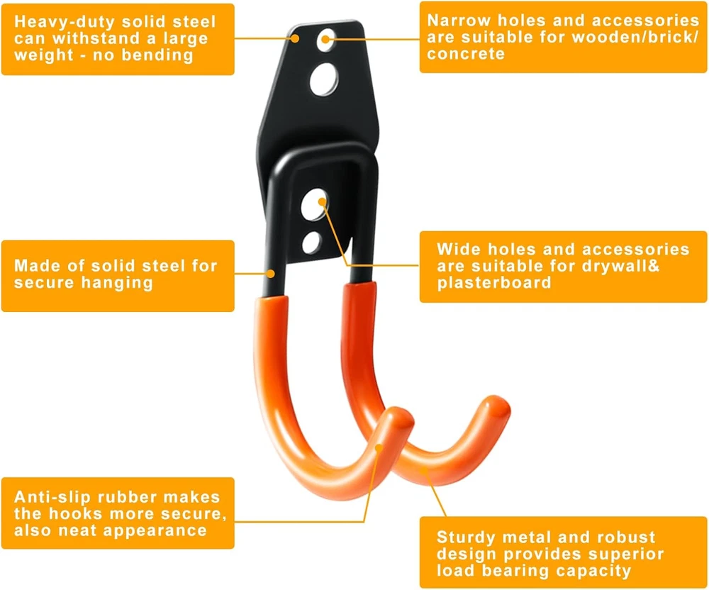 Heavy Duty Garage Hooks For Hanging 2 Pack Metal Garage Organization Hooks New POWERFUL WEIGHT CAPACITY - Our Heavy Duty garage storage hooks are an essential item for anyone looking to maximize their storage space. With a weight capacity that's second to none, you'll be able to hang everything from bikes and ladders to shovels and strollers without worrying about them falling or bending the hooks. These garage hooks heavy duty are perfect for creating a garage storage system and are great garage hangers for wall mount hooks PREMIUM QUALITY MATERIAL - Made of high-strength carbon steel and coated with a rust-resistant finish, our garage hooks heavy duty are built to last. They'll withstand the test of time and keep your garage or garden looking neat and organized for years to come. These storage hooks for garage wall are heavy duty garage hooks that you can rely on. WIDE RANGE OF APPLICATIONS - One of the best things about our heavy duty wall hooks is their versatility. Whether you need to hang a bike, ladder, or gardening tool, these garage wall hooks have got you covered. They're perfect for anyone who wants to keep their space tidy and clutter-free. These heavy duty wall hooks are also great ladder hooks for those who need to store their ladders. EASY INSTALLATION PROCESS - With our garage storage hangers, installation is a breeze. For wooden walls, you can simply screw the hooks in place. For brick or concrete walls, you'll need to use the included wall anchors for added support. Either way, you'll have your hooks up and ready to use in no time. These garage hooks for hanging are perfect for any DIY garage organization project. Product Description Item model number SJH2 Style Utilitarian Country of Origin China Theme Garage Storage and Organization Batteries Included? No Batteries Required? No Finish Powder Coated Material Carbon Steel Number of Hooks 2 Finish Type Powder Coated Included Components Heavy Duty Garage Hooks, wal anchors, screws Item dimensions L x W x H 5.7 x 3.2 x 2 inches Item Weight 10.2 ounces Surface Recommendation Wooden, brick, concrete, plasterboard walls Special Features Heavy Duty Special Feature Heavy Duty Mounting Type Wall Mount Color Orange Recommended Uses For Product Garage Product Dimensions 5.7 x 3.2 x 2 inches Size 2.5 Inch Shipping Fast shipping is very important for us. Our standard US shipping service is FREE. Your order will be shipped within 2-3 business days upon full payment received. Your order will be delivered within 2-3 business days after the handling time. We only ship to the confirmed PayPal address. We reserve the right to cancel any order for any reason at any time. We are not responsible for undeliverable addresses. Returns and payment We offer a 30 days return policy from checkout winning date. We allow only PayPal as payment method FeedBack Your feedback very important to us, after you get your package and you are satisfied with our service please leave us positive feedback If you have any problem with your order / any questions please before leave any type of feedback For any questions, using eBay contact system Please visit our eBay store to check out other items for sale! Thank you for shopping at our store.