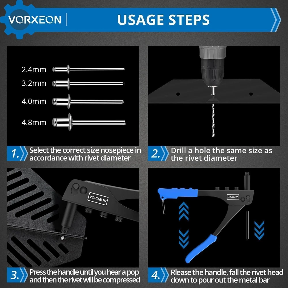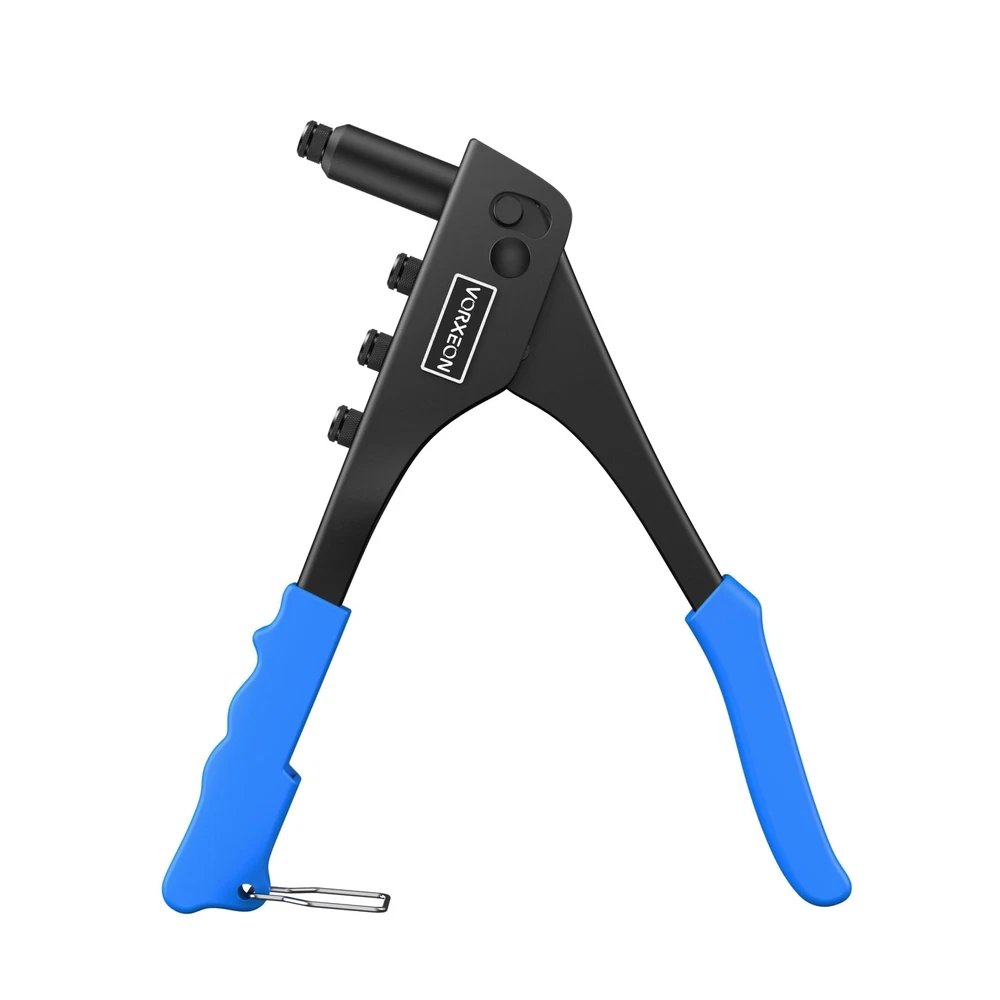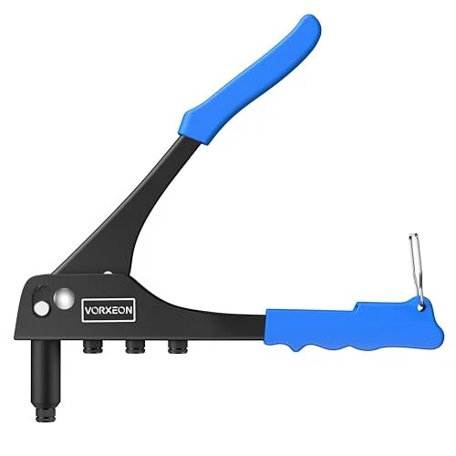 【Sturdy】The Rivet Gun is made of high-quality steel, with high hardness and rust resistance after heat treatment, ensuring a long lifespan. The jaws that grip the rivets are made of Cr-Mo steel, providing enhanced gripping power 【4 Sizes Mandrels】The Rivet Gun is compatible with four different sizes of rivets: 3/32" (2.4mm), 1/8" (3.2mm), 5/32" (4.0mm), and 3/16" (4.8mm). No additional tools are required; you can easily replace the different-sized Rivet Nozzles by hand. The kit also includes 100 pieces of rivets, providing you with a more convenient work experience 【Non-slip Handle】The handle of the heavy duty rivet tool is made of PVC, which is non-slip and easy to grip, making it perfect for repetitive work. With increased power and less vibration during operation and easy operation, our heavy duty hand riveter saves time and energy, and it doesn't fatigue our hands 【Easy Storage】At the bottom of the hand rivet tool, there is a stainless steel buckle. When we are not using the nut tool, you can snap on this safety lock to save space 【Wide Use】rivet insert tool kit is suitable for repair work on cars, boats, furniture and machines, perfect for DIY enthusiasts