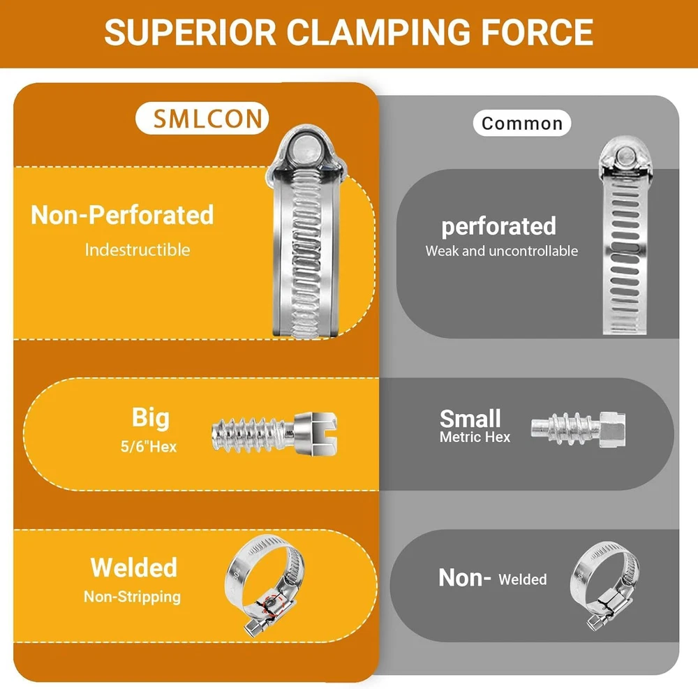 Heavy Duty Hose Clamp Kit - 44PCS,1/4''- 44 Pcs Kit, Silver Product Details Manufacturer: SMLCON Part Number: DSHG Item Weight: 1.37 pounds Product Dimensions: 7.6 x 5.3 x 1.45 inches Item model number: DSHGFT Size: 44 Pcs Hose Clamp Kit Color: Silver Style: Modern Material: Stainless Steel Included Components: hose clamps Batteries Required?: No Material: Stainless Steel Brand: SMLCON Item dimensions L x W x H: 7.6 x 5.3 x 1.45 inches Color: Silver Style: Modern Manufacturer: SMLCON 1. Upgraded Design - Compared to traditional perforated bands, our stainless steel band features a hole-free design, thick and wide, which is hardly affected by over-tightening, deformation, and peeling. This is due to its thicker metal and embossed strap, which can protect the hose from shearing or crushing. Our hose clamp screw is big with deep thread. and the welded worm gear housing can increase the breaking torque by 65%. These hose clamps are high-pressure, providing excellent clamping force and secure sealing. 2. Adjustable Size - The slotted screw is equipped with a hex head. It can be quickly tightened using a screwdriver or a nut driver.The non-perforated hose clamp is flexible and extensible, with adjustable width, and the size range is from 1/4''- 1-1/8''. 3. High Quality Material - Our tubing clamps are made of high quality 304 stainless steel, including the housing, screws, and band. They are compatible with SAE J 1508 standards and ideal for 3/4 silicone heater hose, garden sprinkler, and more. The neutral salt spray(NSS) test is 120 hours, and our SS 304 screws are plated for smooth tightening, enhancing corrosion protection level and meeting the marine grade hose clamps requirement. 4. Hose Protection - Our worm gear hose clamps are designed with a rolled band edge to prevent damage to soft silicone, PVC, or rubber hoses. The non-perforated band prevents extrusion through the band notches, ensuring reliable performance for garden water line tubing, heater pipes, and automotive repairs. 5. Versatile Use - Our clamps are perfect for securing hoses, pipes, cables, tubes, fuel lines, and more. They can be used in automotive, industrial, boat/marine, shield, household, and outdoor settings. Introducing the SMLCON Premium 304 Stainless Steel Hose Clamp Assortment Kit - the ultimate solution for enhancing your tool collection. Crafted from heavy-duty 304 stainless steel band, housing, and screw, our hose clamps offer unparalleled quality and exceptional resistance to corrosion. Featuring a flexible and ductile design, our fuel line hose clamps boast a wide adjustable size range. The worm gear mechanism enables precise adjustment of the clamp’s diameter, ensuring a tight and secure seal. Designed specifically for use in confined spaces, our hose clamps are the ideal choice for preventing flow leakage. With their easy-to-use tightening and loosening mechanism, installation becomes a breeze. Whether for industrial, automotive, electronic, or home applications, SMLCON hose clamps is a secure fitting for hoses, pipes, cables, tubes, fuel lines, and more - even in water salt environments. Package includes: 8-12mm (or 5/16 - 1/2 inch) ---10pcs 10-16mm (or 3/8 - 5/8 inch) ---10pcs 12-20mm (or 1/2 - 3/4 inch) ---6pcs 16-25mm (or 5/8 - 1 inch)---6pcs 16-27mm (or 5/8 - 1-1/16inch) ---6pcs 20-32mm (or 3/4 - 1-1/4 inch) ---6pcs