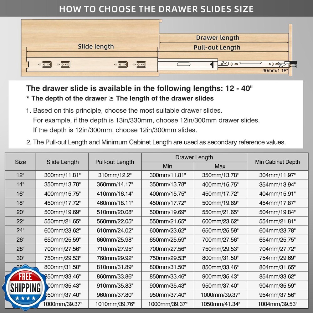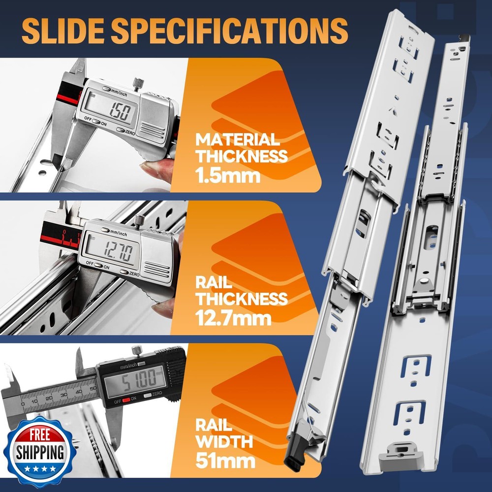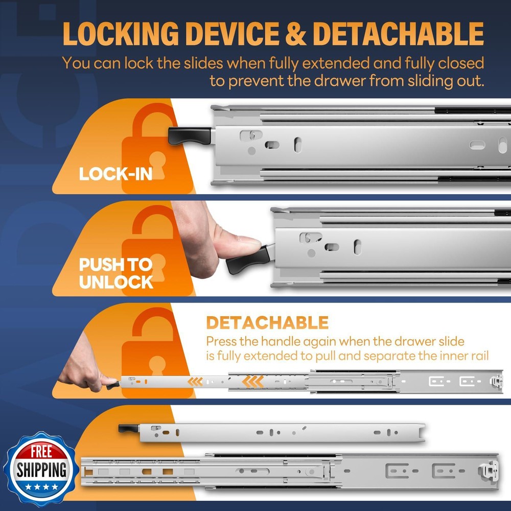 BAIDICE 1 Pair Heavy Duty Drawer Slides with Lock 12 14 16 18 20 22 24 26 28 30 32 34 36 38 40 Inch 150 lb Load Capacity Side Mount Full Extension Ball Bearing Rail Runner Features 【Lock Drawer Slides, Removable】 Simultaneously press the black handles on both sides to lock and unlock the drawer, it can be locked when fully closed, and can be locked when fully opened to prevent sliding. Locking slides can be used on shelves, cabinets, industrial drawers, RVs, trucks, vending machines, and more. 【Installation requirements】 Size: 33.46"(850mm); Fully extension length: 67.52"(1715mm); Installation clearance: Left: 0.50" (13mm); Right: 0.50" (13mm). Approximate length of the blue handle: 1.18" (30mm). You can choose the size of the rail according to the depth of the drawer. The length of the rail should be less than or equal to the drawer. Refer to the picture above. 【Maximum Bearing Capacity 150lb, 30-year Service Life】 All three sections of rails are made of 1.5mm thick Q235 thickened steel plate, and high-strength, high-density and high-quality cold-rolled steel. It can support heavy load storage without deformation, and the bottom is equipped with a limited rubber pad, which is made of ABS plastic, with good wear resistance and good impact resistance. After testing, the number of opening and closing times has reached more than 150,000 times. 【Full Extension Slides, Double Anti-rust】Full extension heavy duty drawer slides support access to the whole space, and the drawers can be pulled out completely for easy storage of items. The surface of the slide rail is treated with a galvanized blue sealing process, which isolates the slide rail from direct contact with air and water, and increases oxidation resistance and corrosion resistance. 【About Screws】 1. This product comes with 8 M4 screws. Due to different usage scenarios, please purchase other suitable screws by yourself. 2. The locking mechanism can only take effect when the drawer is fully closed or fully opened. 3. When installing the product, please push the inner ball bearing to the top of the slide, then attach it to the slide, and finish the installation. Shipping Free & Fast Shipping: We offer free shipping to most of the USA with a normal delivery time of 3-7 days. However, due to the current situation, additional delivery time (up to 3 weeks) may be required for some items. Alternative Carriers: We may use alternative carriers (e.g., USPS, FedEx, UPS) to ensure your package arrives safely and on time. Due to the use of multiple carriers, we are unable to provide a tracking number automatically. Handling Time: Orders are processed and shipped within 1-2 business days of receiving cleared payment. Shipping Restrictions: Shipping to Alaska, Hawaii, Puerto Rico, Guam, and other US territories may incur shipping charges or delivery restrictions. Please contact us before ordering, or your order can be refunded/cancelled. State Restrictions: Certain items may not be shipped to California due to state regulations. Contact for Tracking Updates: If you require tracking updates or have any concerns about the delivery of your order, please feel free to contact us, and we will be happy to assist you. Return Policy 30-Day Hassle-Free Returns: If you are not completely satisfied with your purchase, you can return the item for free within 30 days of receiving it for a full refund or exchange. Easy Return Process: Contact us, and we will provide you with a prepaid return shipping label and detailed instructions. No Restocking Fee: There are no restocking fees for returns. However, the buyer is responsible for return shipping costs if the return is not due to a seller's error. Refund Processing: Refunds will be processed within 1 business day of receiving the returned item in its original condition. Payment We accept all major credit cards, PayPal, and Apple Pay for your convenience. Your payment information is secure and encrypted to ensure a safe and seamless transaction. Please complete your payment within 3 days of purchase to avoid any delays in shipping. Feedback Your feedback is extremely important to us. We strive to provide the best products and customer service possible. If you are satisfied with your purchase, please take a moment to leave us a positive review. If you have any concerns or issues with your order, please contact us before leaving negative feedback. We are committed to resolving any problems and ensuring your satisfaction. Contact Us If you have any questions or concerns, please feel free to reach out to our customer support team. You can contact us through the eBay messaging system. We are available Monday to Friday, 9:00 am to 5:00 pm EST, and we will do our best to respond to your inquiry within 24 hours. Thank you for supporting our small family business!