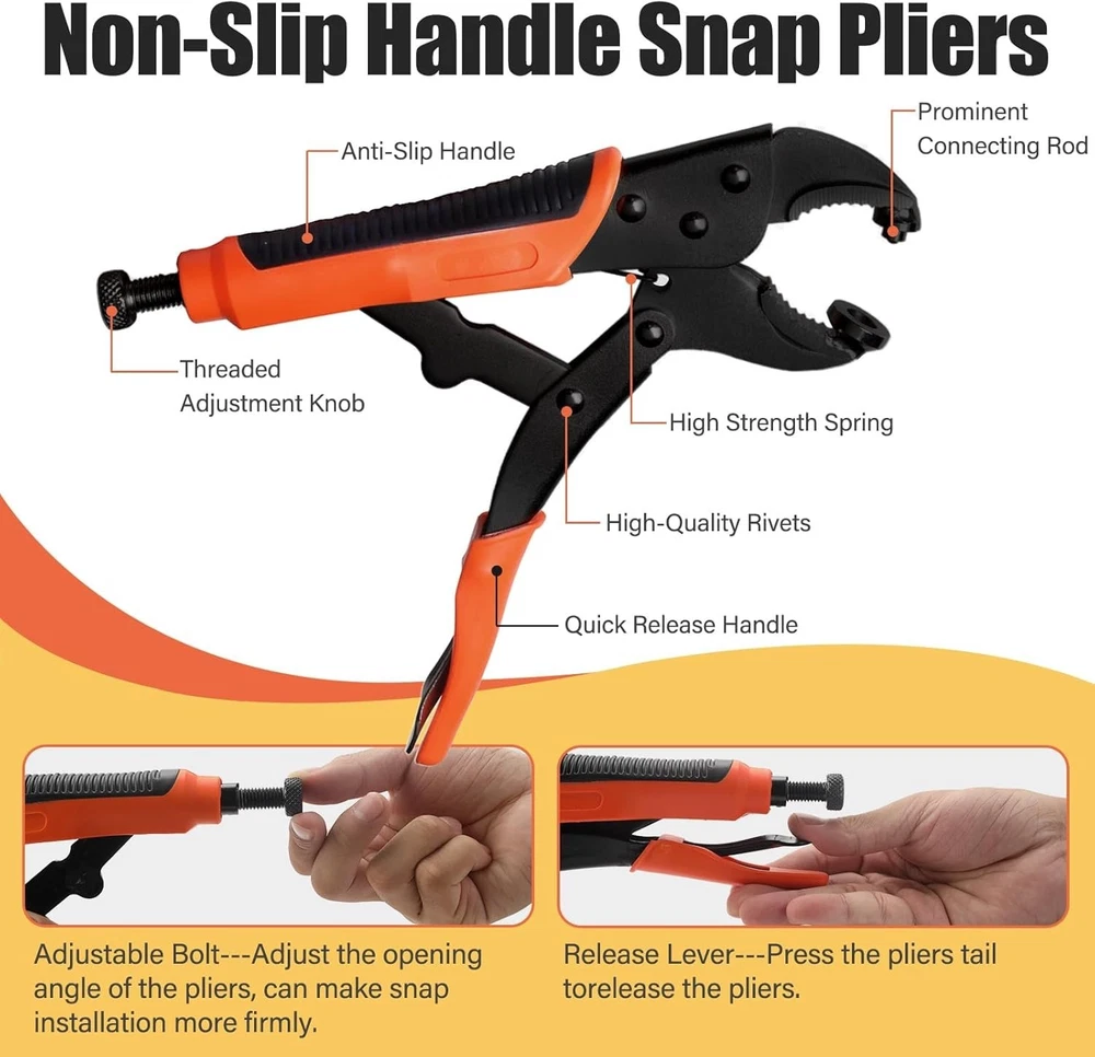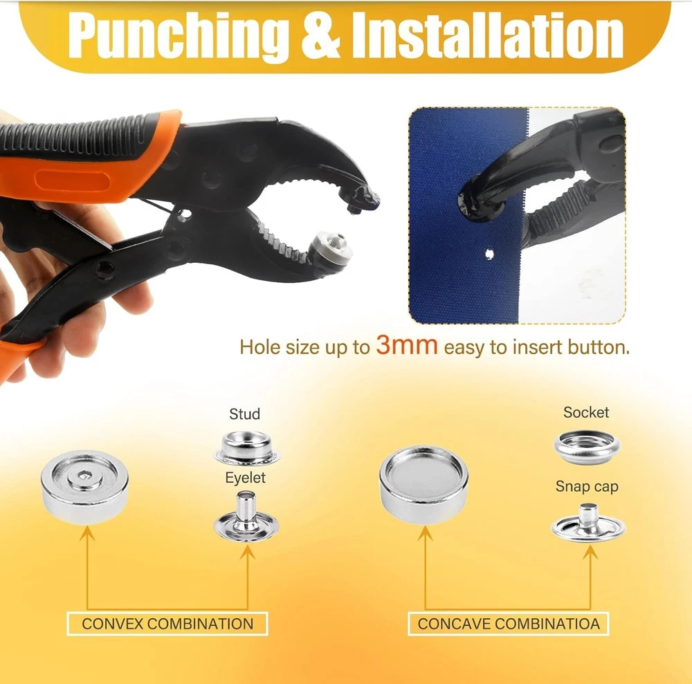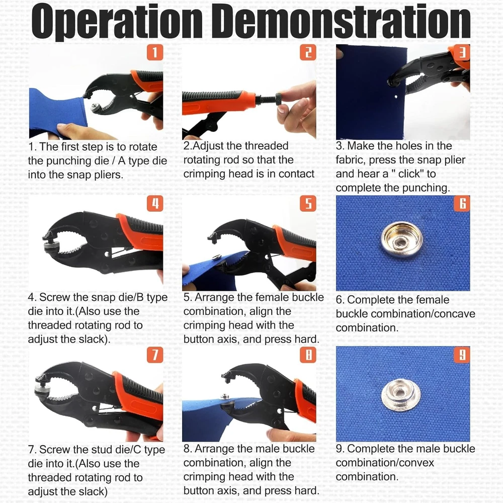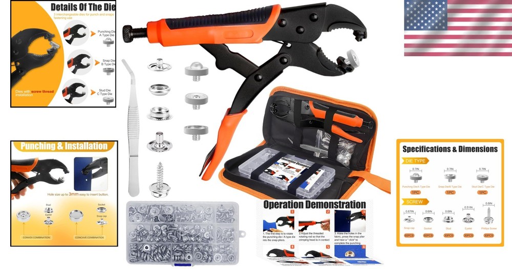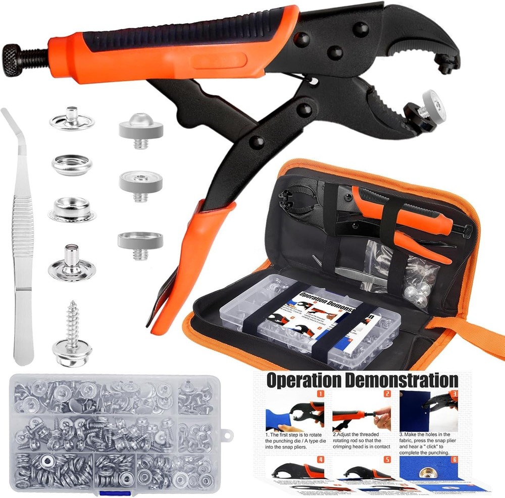 Snap Fastener Tool Kit Marine Metal Snap Buttons Heavy Duty Pliers for Canvas ‹ › ‹ › ‹ › ‹ › ‹ › ‹ › ‹ › ‹ › ‹ › Snap Fastener Tool Kit Marine Metal Snap Buttons Heavy Duty Pliers for Canvas What's Included: Heavy-duty snap fastener pliers Storage bag for easy organization 1 Tweezer to aid in delicate tasks 60 sets of marine snaps, featuring: 60 snap caps 60 sockets 30 fabric base studs 30 eyelets 30 solid base stud screws 1 hole punch die 1 snap die 1 stud die A transparent plastic box to keep all components organized Versatile Applications: This heavyweight tool can handle a variety of scenarios with grace. Use it for: Boat seats and marine canvas Boat covers and tarps Tents and fabric awnings Clothing and leather applications Furniture and golf cart covers Motorcycle helmets Exceptional Durability: Crafted from high-grade materials, this marine snap kit is built to last. Features include: High-grade heat-treated alloy steel pliers for maximum toughness and durability Stainless steel snaps that resist deformation and withstand various environments Adjustable & Flexible Design: Enjoy the ease of a compact tool: Lightweight and portable compared to traditional counterparts Simple die replacements eliminate the need for multiple accessories Height-adjustable parts ensure precision and accuracy with each snap Easy to Operate: Our snap tool comes with clear instructions for effortless use. Follow these steps: Insert the button and die correctly Align the crimping head with the button axis Press firmly to secure Recommended: Practice on a scrap cloth with the first use to avoid mistakes Why Choose Our Snap Button Kit Tool? Upgrade your craft with quick and efficient snap installations Reusability and durability for long-term use Marine-grade components prevent wear and tear in challenging environments Versatile functionality for various applications - wherever a snap is needed Transform your canvas work and ensure longevity with our Snap Fastener Tool Kit. Durable, versatile, and easy to use - the ultimate companion for both professionals and DIY enthusiasts alike. Shipping Free & Fast Shipping - We offer free shipping to most of the USA with a normal delivery time of 3-7 days. However, due to the current situation, additional delivery time (up to 3 weeks) may be required for some items. Alternative Carriers - We may use alternative carriers (e.g. USPS, FedEx, UPS, etc.) to ensure your package arrives safely and on time. Due to the use of multiple carriers, we are unable to provide a tracking number automatically. Handling Time - Orders are processed and shipped within 1-2 business days of receiving cleared payment. Shipping Restrictions - Shipping to Alaska, Hawaii, Puerto Rico, Guam, and other US territories may incur shipping charges or delivery restrictions. Please contact us before ordering, or your order can be refunded/cancelled. State Restrictions - There may be restrictions based on your state of purchase. For example, certain items may not be shipped to California due to state regulations. Contact for Tracking Updates - If you require tracking updates or have any concerns about the delivery of your order, please feel free to contact us, and we will be happy to assist you. Return 30-Day Hassle-Free Returns - We want you to be completely satisfied with your purchase. If you are not, you can return the item within 30 days of receiving it for a full refund or exchange. Easy Return Process - To start a return, simply contact us and we will provide you with a prepaid return shipping label and detailed instructions. Restocking Fee - There are no restocking fees for returns. However, the buyer is responsible for return shipping costs if the return is not due to a seller's error. Refund Processing Time - Refunds will be processed within 5 business days of receiving the returned item in its condition. Payment We accept all major credit cards, PayPal, and Apple Pay for your convenience. Your payment information is secure and encrypted to ensure a safe and seamless transaction. Please complete your payment within 3 days of purchase to avoid any delays in shipping. Feedback Your feedback is extremely important to us. We strive to provide the best products and customer service possible. If you are satisfied with your purchase, please take a moment to leave us a positive review. If you have any concerns or issues with your order, please contact us before leaving negative feedback. We are committed to resolving any problems and ensuring your satisfaction. Contact Us If you have any questions or concerns, please feel free to out to our customer support team. You can contact us through the eBay messaging system. We are available Monday to Friday, 9:00 am to 5:00 pm EST, and we will do our best to respond to your inquiry within 24 hours. Buy it now and enjoy a pleasant shopping experience! Unit Quantity: 60 sets Suitable For: Costumes,Crafts,Drapery,Jackets & Coats,Shirts & Blouses,Upholstery,Boat covers,Canvas,Leather,Furniture,Tents,Fabric,Awnings,Golf cart cover,Motorcycle helmet Color: Orange Material: Stainless Steel Type: Snap Buttons Shape: Round Unit of Sale: Pack