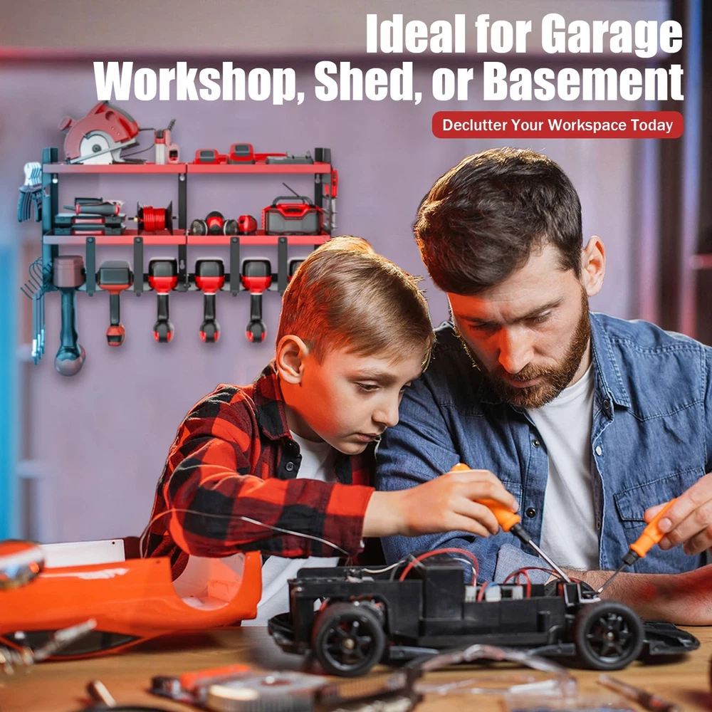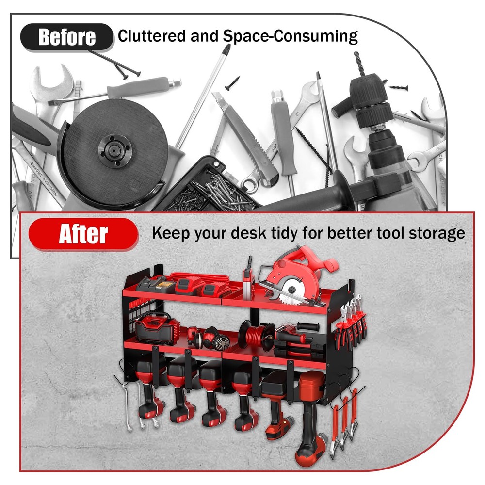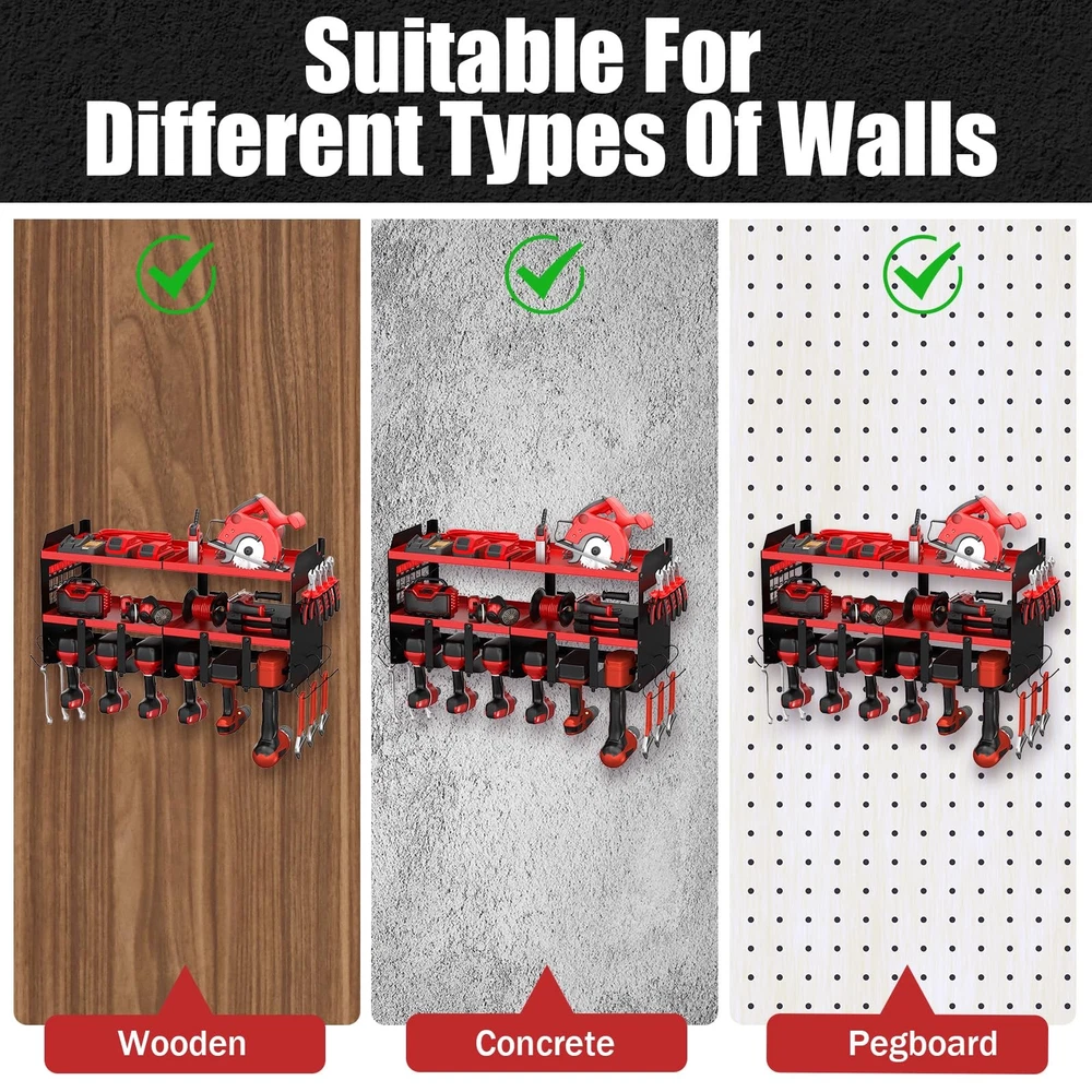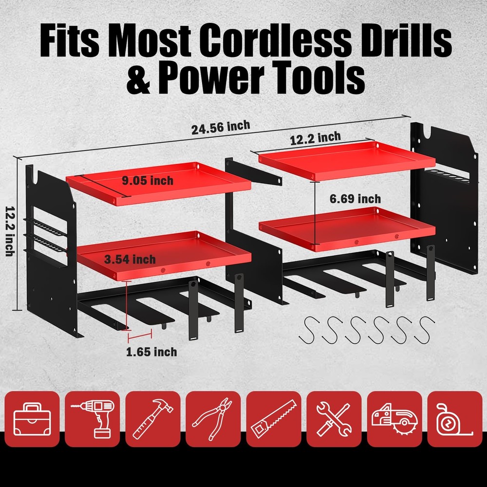 Organize Your Garage Like a Pro This wall-mounted power tool organizer helps you turn wasted wall space into a high-efficiency storage area. Ideal for storing drills, chargers, batteries, toolboxes, and more, it's the perfect solution for any garage, workshop, or shed. Durable All-Metal Construction Made from thick cold-rolled steel with a rust-resistant powder-coated finish, this heavy-duty rack holds up to 150 lbs of tools without bending or warping. It's built to last through years of tough use. 6 Drill Holders & Wide Top Shelf Features six drill slots designed to fit most cordless drills and impact drivers. The spacious top shelf stores chargers, batteries (not powered), or frequently used accessories, keeping everything you need within easy reach. 3-Tier Storage with Side Hooks The multi-level design includes side slots and hooks for pliers, hammers, screwdrivers, tape measures, and more. Keep your workspace neat, visible, and fully accessible. Fast & Easy Installation Comes with high-quality mounting hardware and clear instructions. Compatible with wood studs, concrete walls, or pegboards. Set up your tool wall organizer in just minutes and free up your floor space. Great Gift for DIYers & Professionals A practical gift idea for Father’s Day, Christmas, or birthdays. Perfect for men who love tools and value a well-organized garage or workshop. Upgraded All-Metal Build – Holds Up to 300lbs: Crafted from thick cold-rolled steel and coated with a rust-resistant powder finish, our power tool organizer offers outstanding strength and durability. It securely holds up to 300 lbs—ideal for drills, drivers, and even heavy-duty toolboxes. A reliable garage organizer for long-term use. 6 Drill Slots & Extra-Wide Top Shelf: Features 6 precisely cut slots for cordless drills and impact drivers, plus a spacious top shelf that fits batteries, chargers (non-powered), or large toolboxes. Keep your cordless tools visible and always ready. Note: Power strip not included. 3-Layer Tool Storage with Side Hooks: Designed with a tiered layout, the 3-layer design holds a wide range of garage tools—from power drills to hammers, pliers, and screwdrivers. Includes side hooks and slots to maximize your wall space and keep every tool in reach. Fast Installation – Wall, Pegboard, or Concrete: Compatible with pegboards, wooden studs, and concrete walls. Comes with premium hardware and clear instructions, allowing you to assemble and install within minutes. A clutter-free workbench is just a few steps away. Gift-Worthy for DIYers & Pros: A must-have gift for Father's Day, Christmas, or birthdays—perfect for dads, husbands, carpenters, or anyone who loves organized tools. Ideal for garages, workshops, basements, or sheds.
