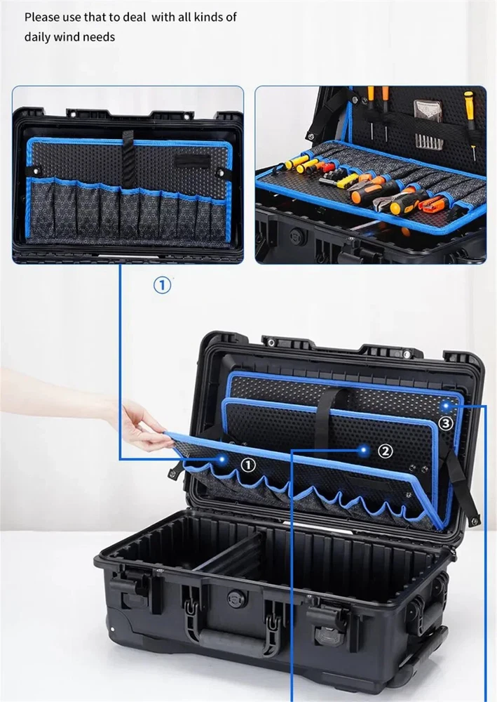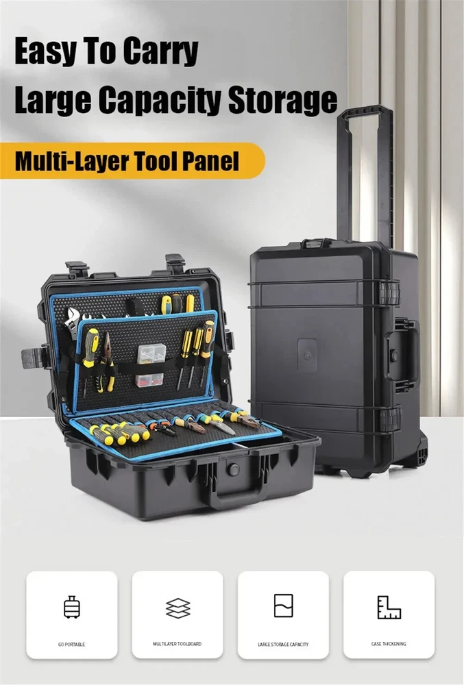 Heavy Duty Outdoor Case with Trolley Pocket Tool Boards Wheel Electric Drill Garage Storage Electrician Tools Chest Organizers Features: 100% brand new and high quality,we support retail, dropshipping, wholesale,customized impact-resistant case made of polypropylene (PP) Unlimited 30 year warranty for case shell Waterproof and dust proof case Removable lid Automatic pressure relief valve 100% Satisfaction Guarantee,If there is any problem with the use of the product, please contact me and solve the problem.For you to Resend or refund, Please don't give a low score directly.Thank you, Dear customer! Color:see pictures Material:plastic Sales Way : Retail, Wholesal,Drop Shipping Size: One Size Length:56cm(22.05in) Width:36cm(14.17in) Height:23cm(9.06in) Quantity: 1pc Size For Manual Measurement, there may be a 0 to 2 cm error, belongs to the normal phenomenon. And due to the difference between different monitors, the picture may not reflect the actual color of the item. Thank you! Package includes: 1x tool case
