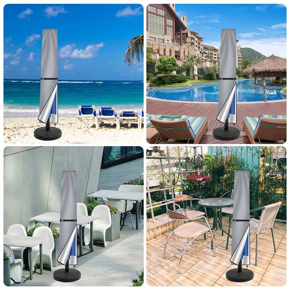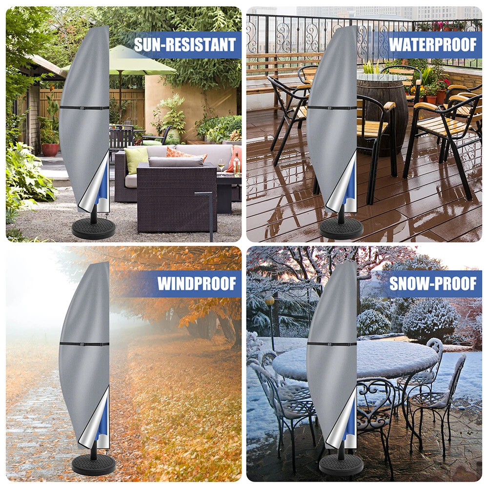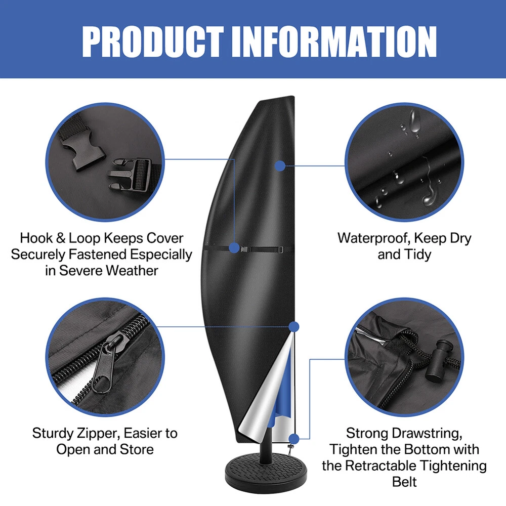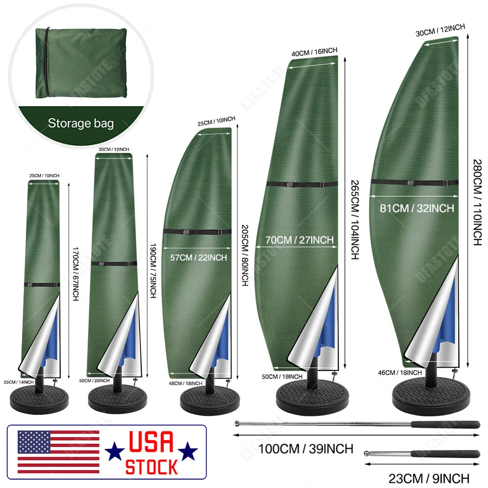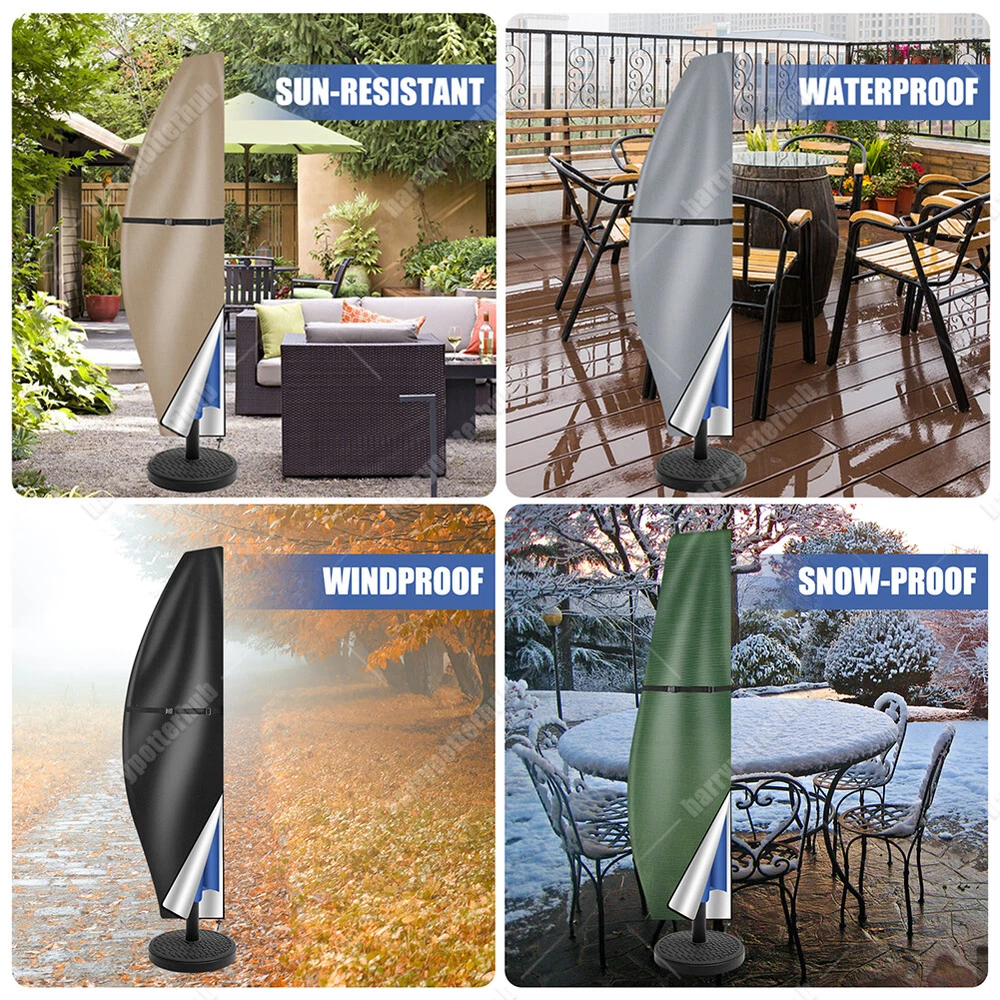 Features: 【 Heavy Duty Waterproof Material】- Made from 210D PVC-lined oxford fabric, this heavy-duty parasol cover is waterproof, UV-resistant, tear-resistant and fade-resistant, better protect your parasol from harsh environments such as strong sunshine, rain, snow, dust and more 【Wide Compatibility Size】- Our parasol cover fits most of parasols on market. Ideal size for a comprehensive range of waterproof patio offset umbrella covers. Fits 1.8 to 3.9 m (6 to 13ft) parasols.Check your parasol's dimensions for proper fit. 【WINDPROOF】 Easy to put on and take off with parasol cover with zip.There is a drawstring and belt which are specially designed to keep the cover secure on your umbrella. You can adjust them to ensure the cover will not be blown away by the wind, increasing the stability of the cover. 【WATERPROOF】Strong waterproof Oxford fabric, PU coated, breathable, lightweight, comfortable fitting and sturdy. The cover will not shrink, fade or deform in harsh conditions such as rain, snow, frost or bird droppings. cantilever parasol cover with ingeniously designed waterproof zipper. 【UV RESISTANT】Parasol cover prevents the sun's harmful rays from discoloring and fading your parasol, which is the right choice for keeping your parasol protected all year long. Especially to fit all weather conditions: rain, snow, sun exposure, etc. It is a right and modern way to apply a cheaper cover to protect the more expensive parasol. 【Parasol cover with telescopic pole】- you can use the telescopic pole to place the parasol cover on a standing canvas and complete the installation. Easily remove or hang up the protective cover. 【Easy to Clean and storage】 Come with a storage bag, easy to storage when not in use. The parasol protective cover is black, dirt and wear resistant. You can wipe with a damp cloth to quickly clean the cover. If you don't want to use it, you can put the parasol cover in a practical storage bag that doesn't take up any space. Specification: Material: 210D Oxford Color: Black,Green,Grey,Khaki Telescopic Pole Size:23-100cm Storage bag:25x18cm The size of the Parasol Umbrella Cover: 【SIZE】: 280cm (High) : 30cm (Top) x 81cm (Middle) x 46cm (Bottom ),Fits offset umbrella up to 9ft/2.7m DIA (Round) or 13ft/3.9m L (Square) 【SIZE】: 265cm (High) : 40cm (Top) x 70cm ( Middle ) x 50cm (Bottom) , Fits offset umbrella up to 8ft/2.4m DIA (Round) or 12ft/3.6m L (Square) 【SIZE】: 205cm (High) : 25cm (Top) x 57cm (Middle) x 48cm (Bottom) , Fits offset umbrella up to 7ft/2.13m DIA (Round) or 11ft/3.35m L (Square) 【SIZE】: 190 CM( High) x 30m (Top) x 50cm (Bottom), Fits market umbrella up to 8ft/2.4m DIA (Round) or 11ft/3.35m L (Square), but can NOT fit for cantilevered umbrellas any size. 【SIZE】: 170 CM ( High) x 25cm (Top) x 35cm (Bottom),Fits market umbrella up to 6ft/1.8m DIA (Round) or 9ft/2.7m L (Square), but can NOT fit for cantilevered umbrellas any size. Please measure your umbrella dimensions before order. umbrella dimensions before order. Why choose our cantilever parasol covers? ✓ The parasol covers are easy to Use and Storage ✓ This garden parasol covers are waterproof, it can be left outside all year round ✓ Can withstand extremes in temperature, frost, snow, rain and UV ✓ Against rain, snow, dust, and bird droppings How to find the perfect cover? 1.In order to properly measure your umbrella, crank it to the closed position so that the umbrella material closes completely around the umbrella pole. 2.With the umbrella closed, measure the circumference around the widest part of the umbrella material. You can also measure the diameter across the umbrella material at the widest point. 3.Measure the height (sometimes referred to as length) from the top of the umbrella to where the material ends. 4.Compare your dimensions to the sizes of our patio umbrella covers shown above and select the size that is equal to or slightly larger than your umbrella dimensions from the drop down menu above. Package List: 1 x Parasol Cover 1 x Storage Bag 1x 100cm Telescopic Pole